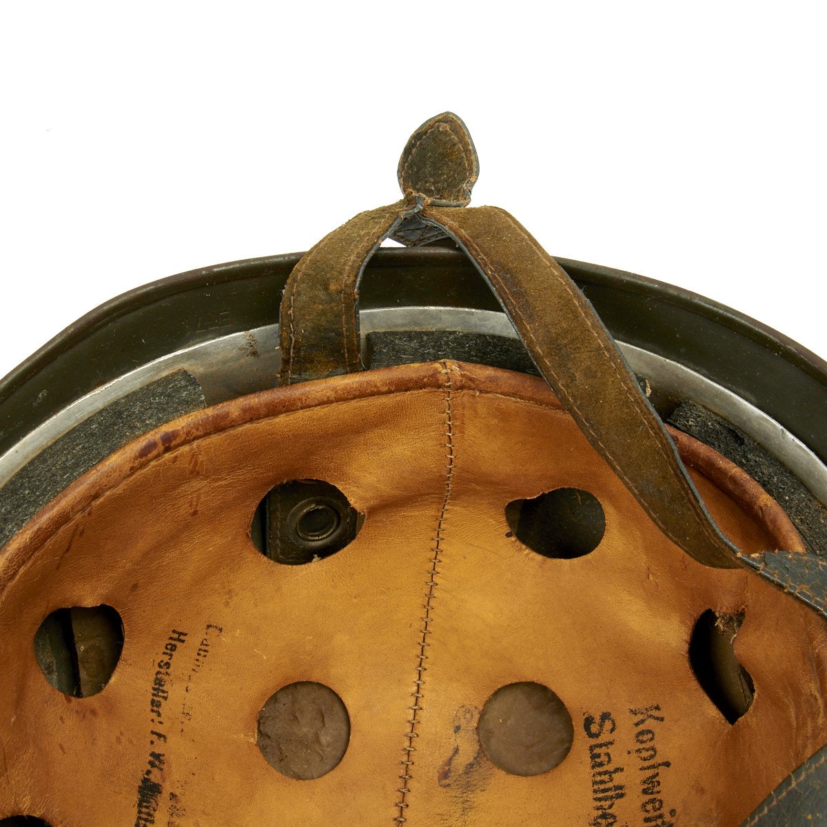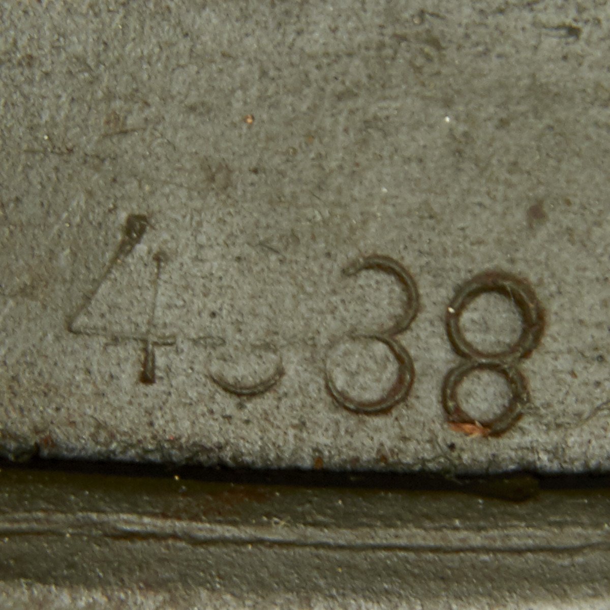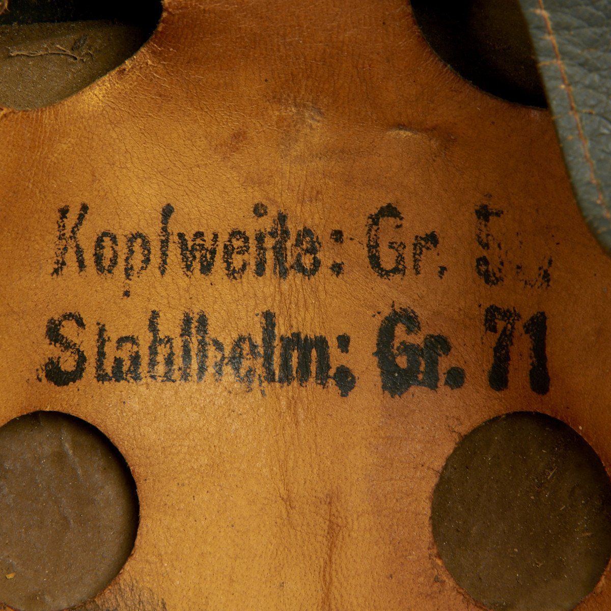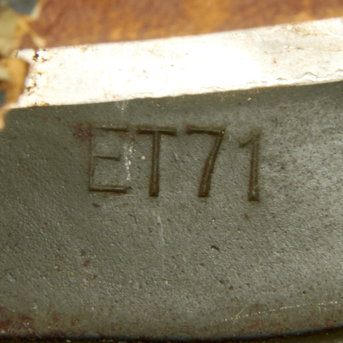The side of the interior shell is stamped ET 71 and the rear of the skirt is stamped with the steel lot number 4521. All paratrooper helmets were produced by Eisenhuttenwerke of Thale. This one is a size 71 and was produced some time in 1940.
