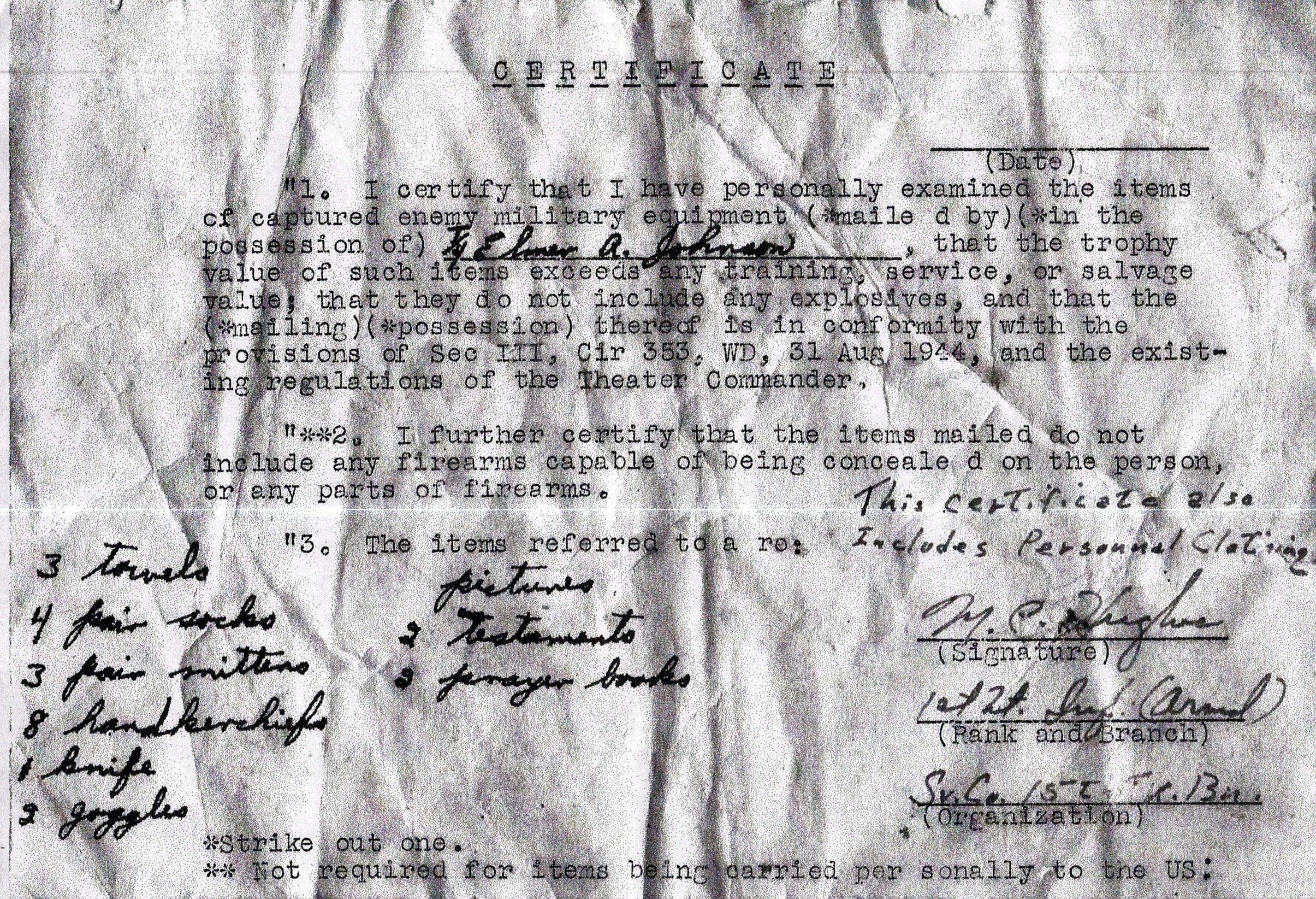The lovely set was brought back according to the certificate by T/4 Elmer A. Johnson, a soldier from a tank battalion. The exact unit is unclear due to illegible writing but it may be for the 15th Tank Battalion.