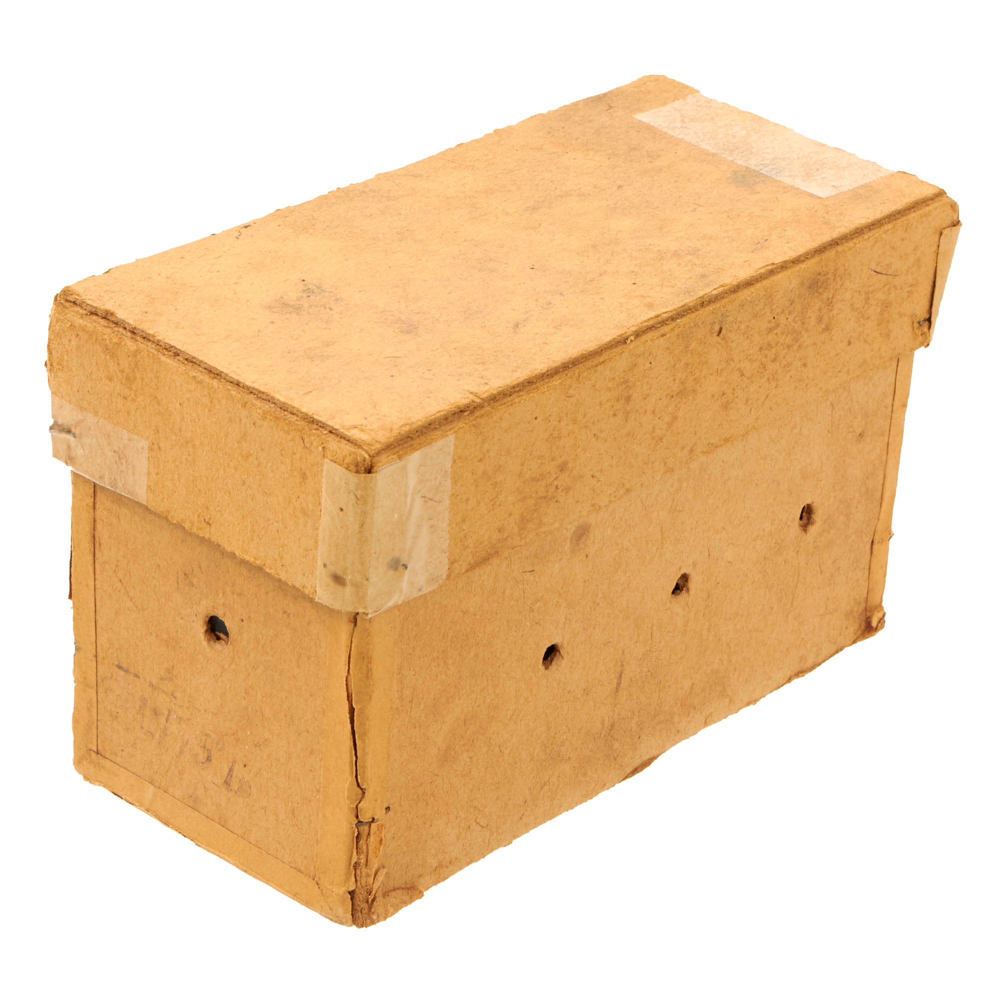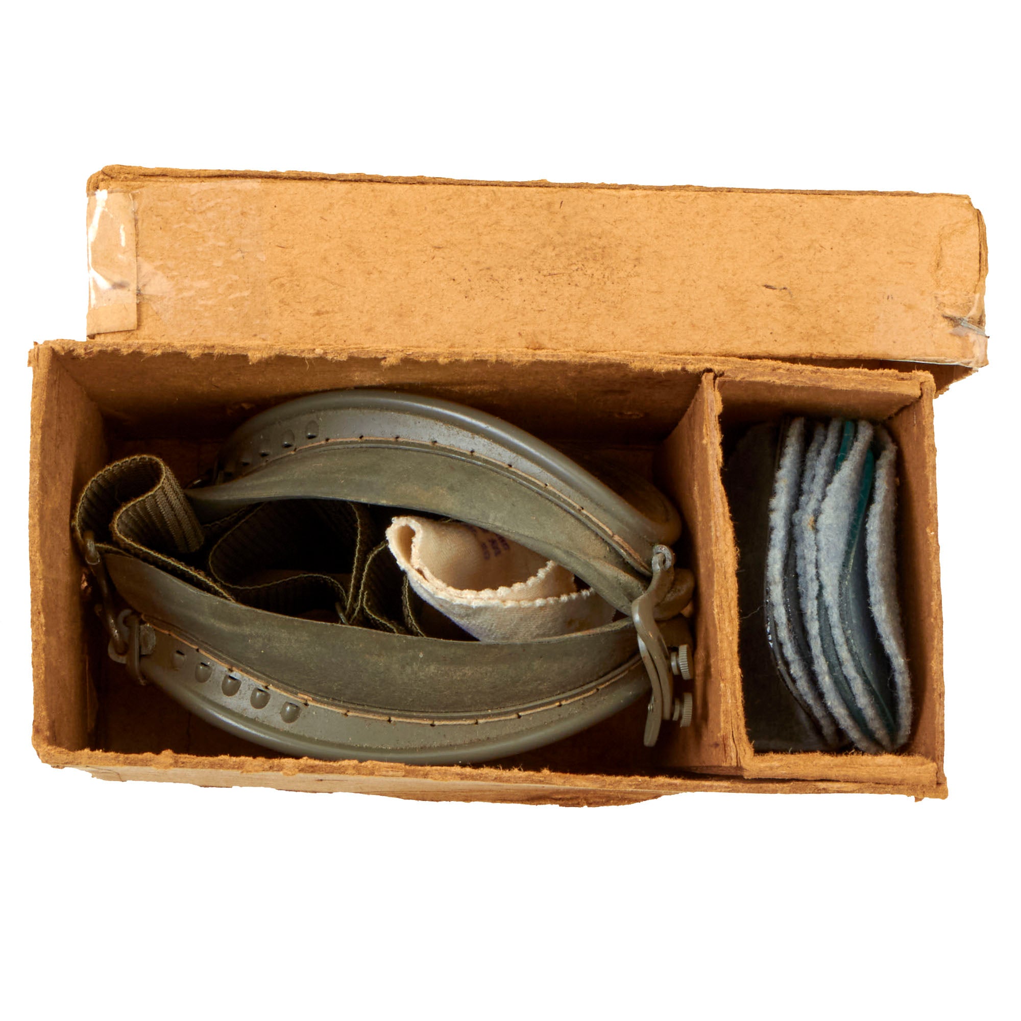 The goggles are in unissued condition but are not without signs of service wear and material degradation. Surprisingly enough, the securing strap still retains some moderate elasticity. The set comes complete with (2) sets of spare lenses which totals to four separate ones. The cardboard box is mostly undamage but there were repairs made via tape to keep it held together and close properly.