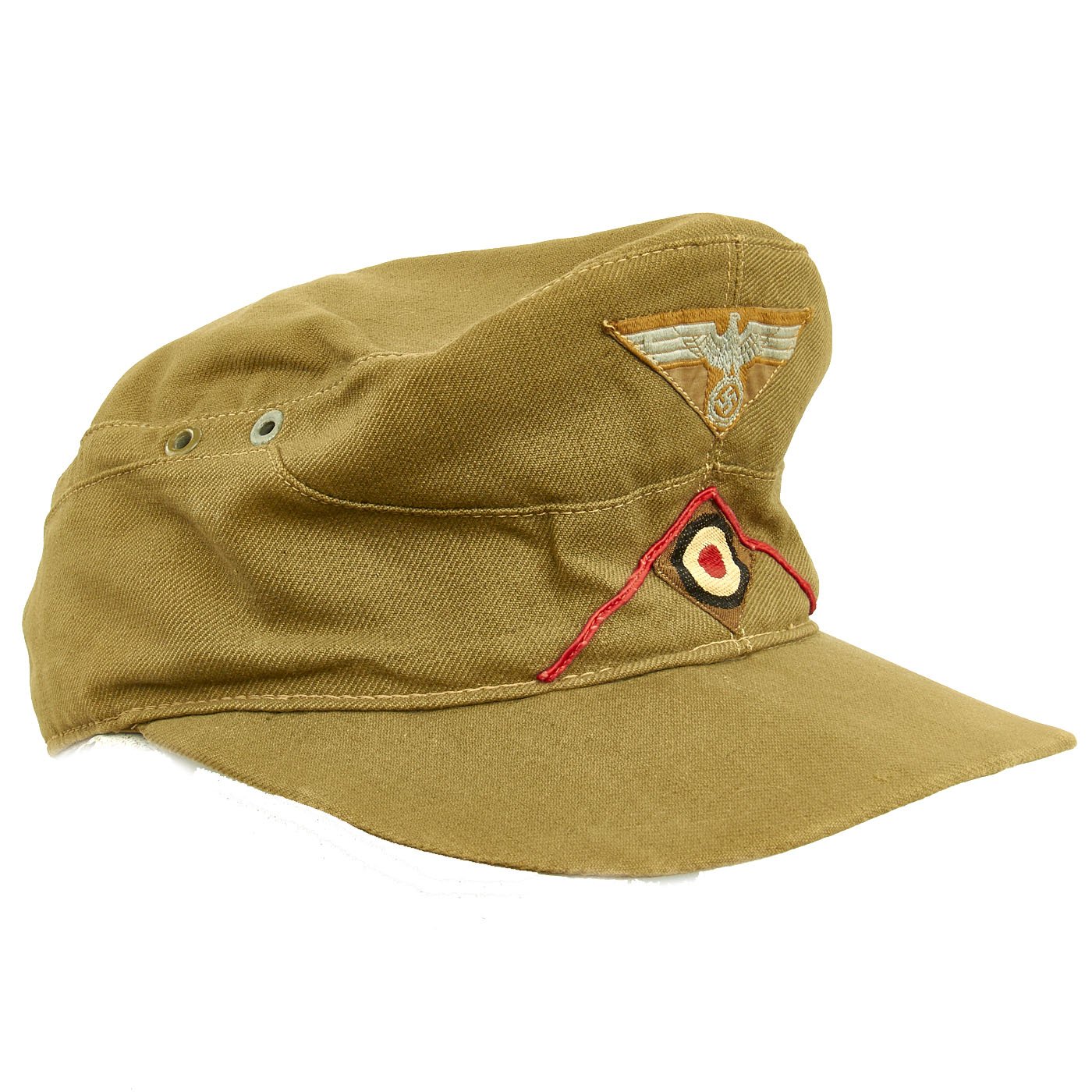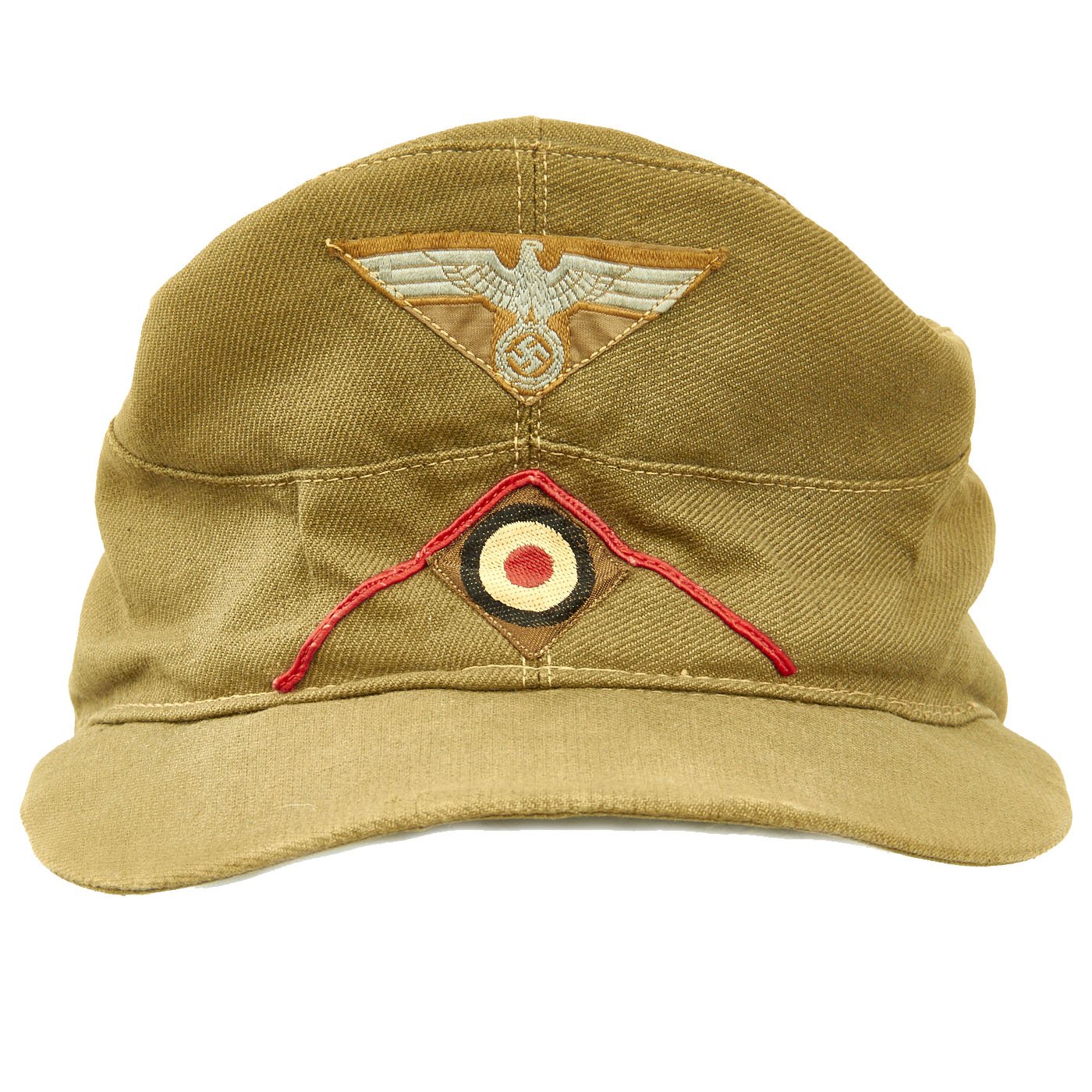 The M41 tropical field cap was introduced in early 1941 and design of the cap was loosely based on the Mountain Troopers, Bergmütze with minor variations. Officer ranks caps were distinguished from EM/NCO's with silver piping for the ranks of Lieutenant to Oberst and gilt piping for the ranks of Generalmajor to Generalfeldmarschall while EM/NCO's ranks caps were not piped. The different branches of service within the army were allocated a particular identifying waffenfarbe, (Branch of Service Color), and originally the M41 tropical field caps had a branch of service soutache applied to the front consisting of an inverted "V" encompassing the national tri-color cockade but regulations of July 10TH 1942 abolished the use of the soutache and instructed it to be removed from the caps, although the directive was not strictly adhered to.