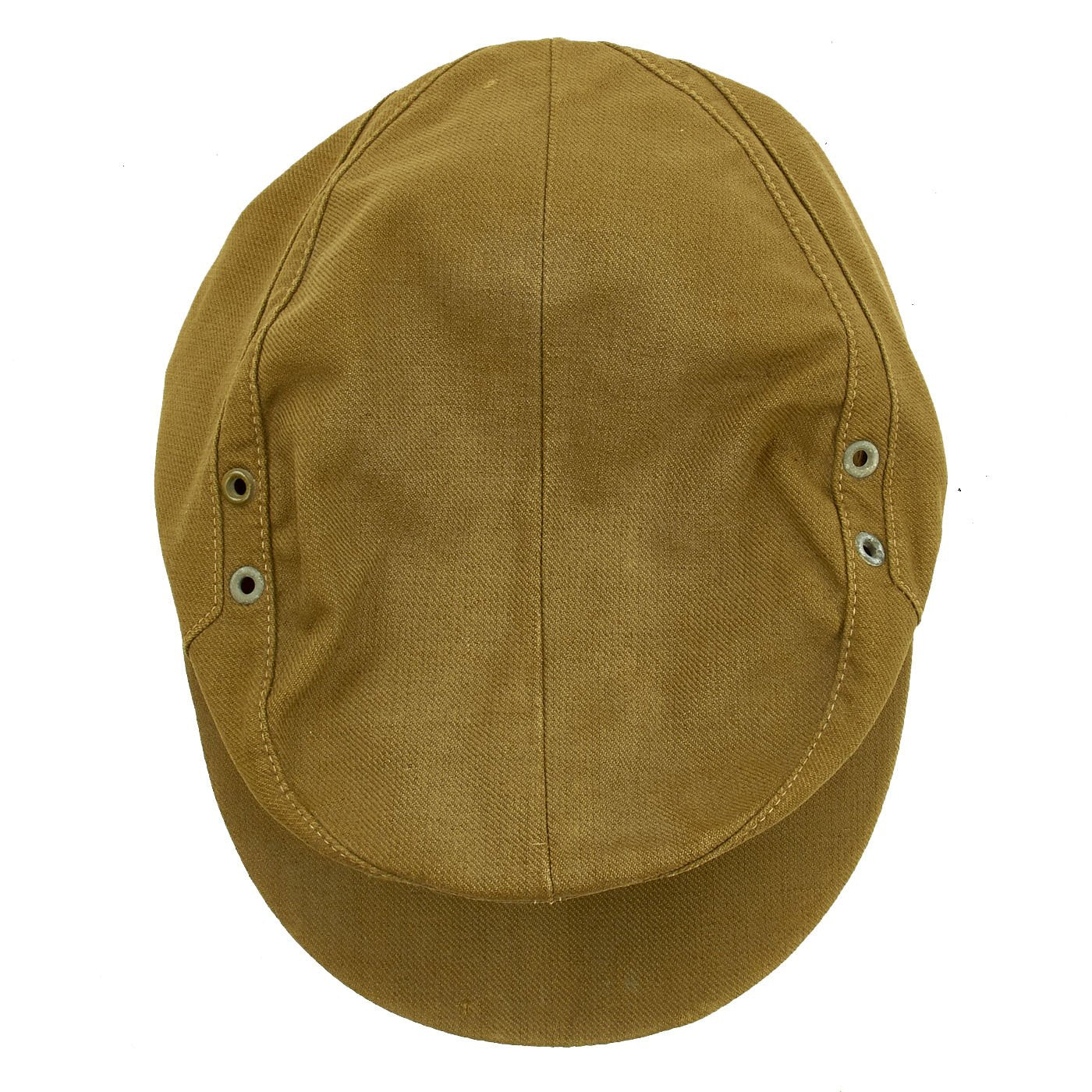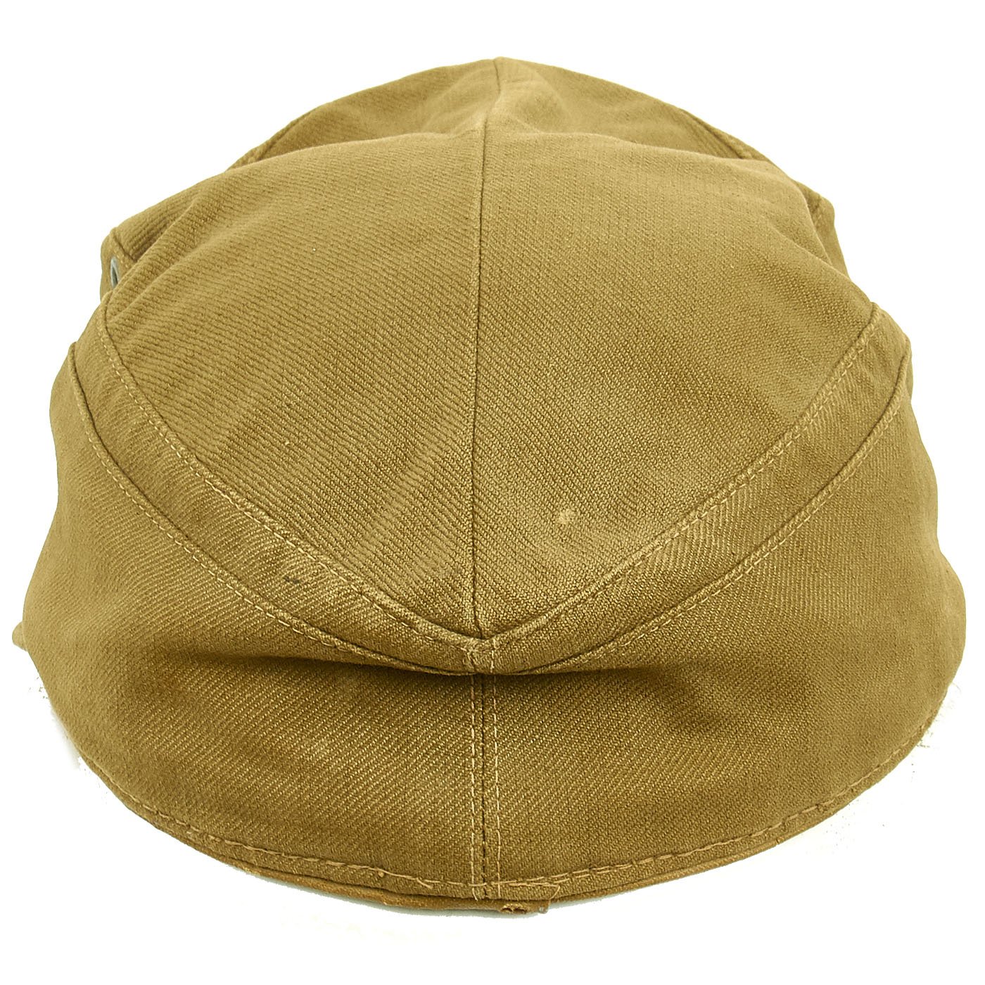 This wonderful example of the M41 Tropeneinheitsfeldmütze (Tropical Unit Field Cap) is correct in all respects, and these are rare in any condition. It features ribbed olive/khaki cotton twill construction, dual-ply, stitched down side and back panels with a gently scalloped downward slope to the front center. The cap has ventilation grommets to each side positioned just below the outer edge of the crown seam. The top center seam is correctly stitched right through the interior liner for added strength. The front center of the cap has a BeVo machine woven national eagle in light blue/grey threads on a triangular cut-out, woven tan base.