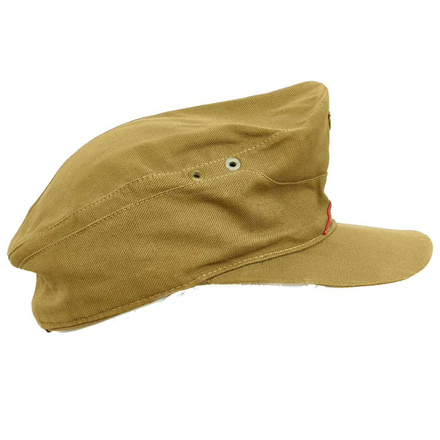 The front center of the dual-ply, downward sloping scalloped panel has a BeVo machine woven national tri-color cockade on a woven tan/olive diamond shaped base. Both the eagle and the cockade are hand-stitched to the cap. Surrounding this is a RED Soutache going from the brim around the cockade, indicating issue to the Artillery Corps or Flak. The cap has a cotton twill covered, forward visor with an internal cardboard stiffener. The visor has dual rows of reinforcement stitching to the bottom of the forward edge. The interior of the cap is fully lined in light weight red cotton with a reinforced cotton sweatband.