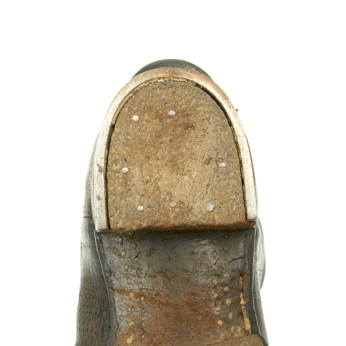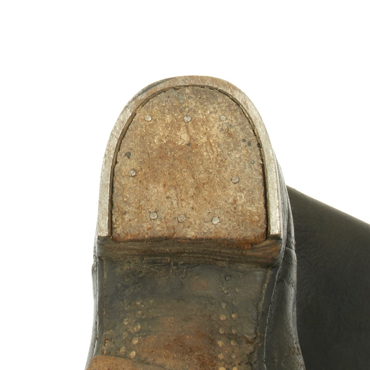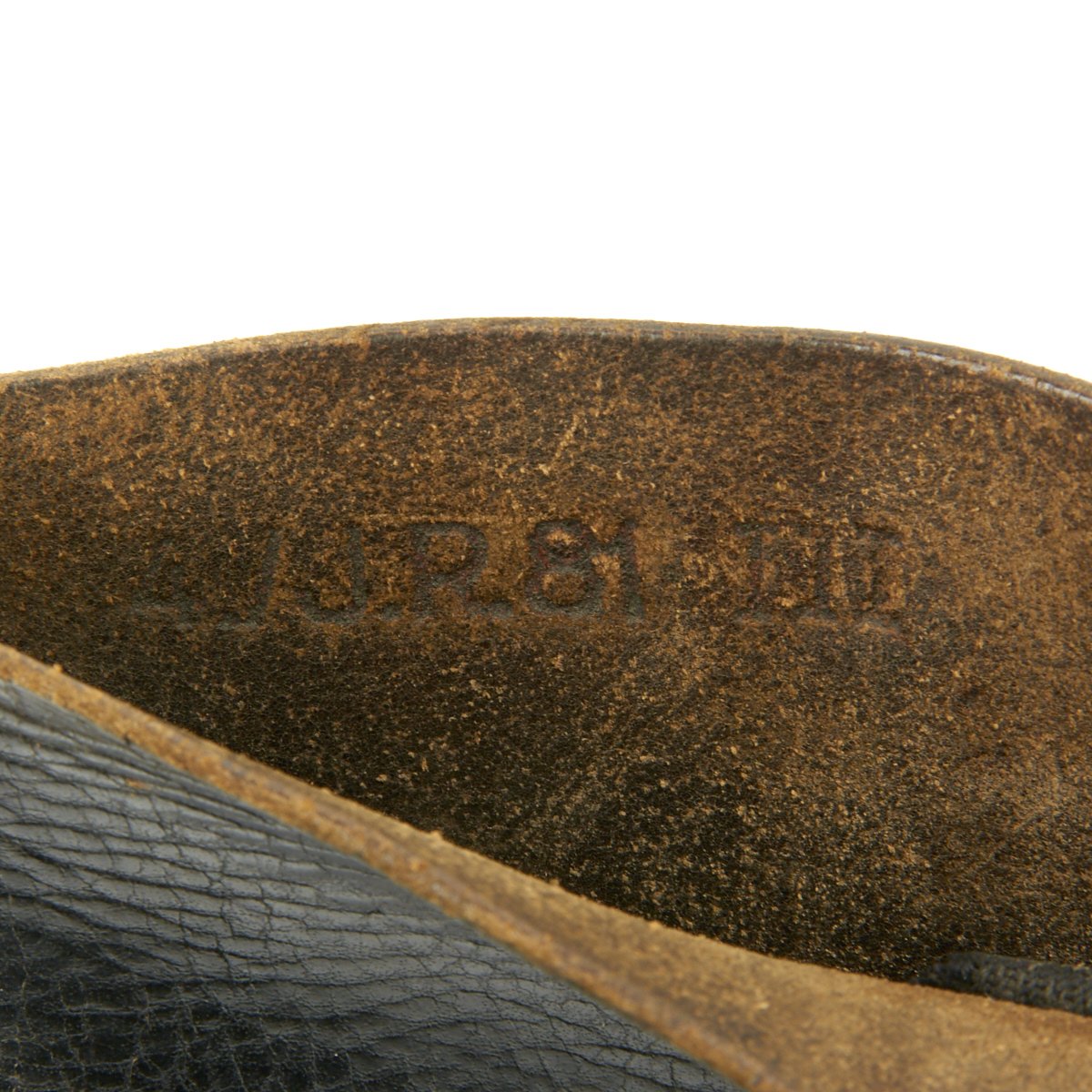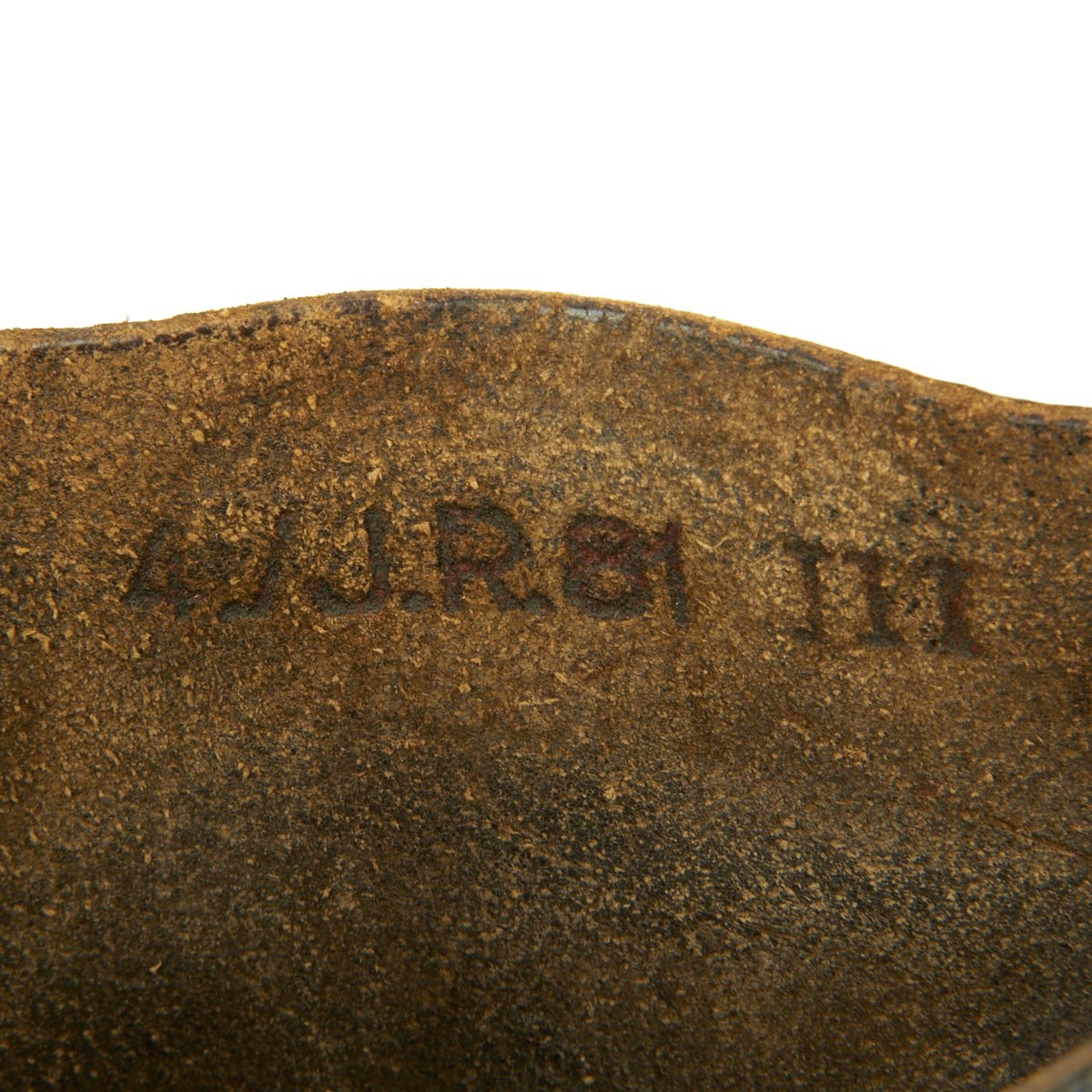 The soles are worn, so only BERT remains of the maker mark on both soles. Almost all hob nails are present, as are the steel toe plates, heel plates and leather heel tabs. One of the fabric pull loops on the right boot is missing, and there is definitely wear to the leather, so these are boots that did see service.The inside of each boot is marked 4. / J.R. 81 / III, indicating use by Jaeger Regiment 81, 3rd Battalion.