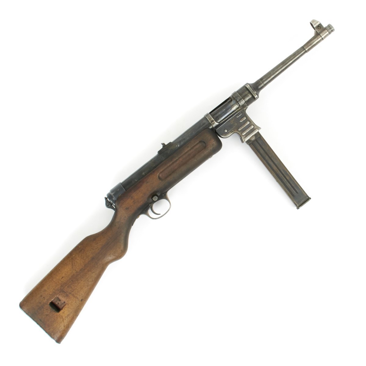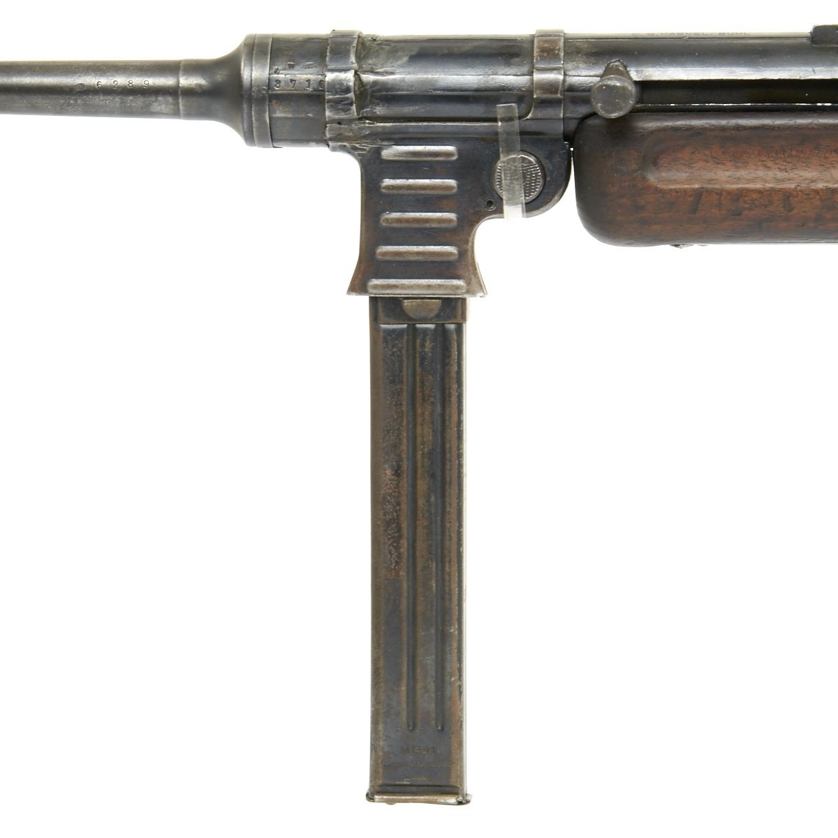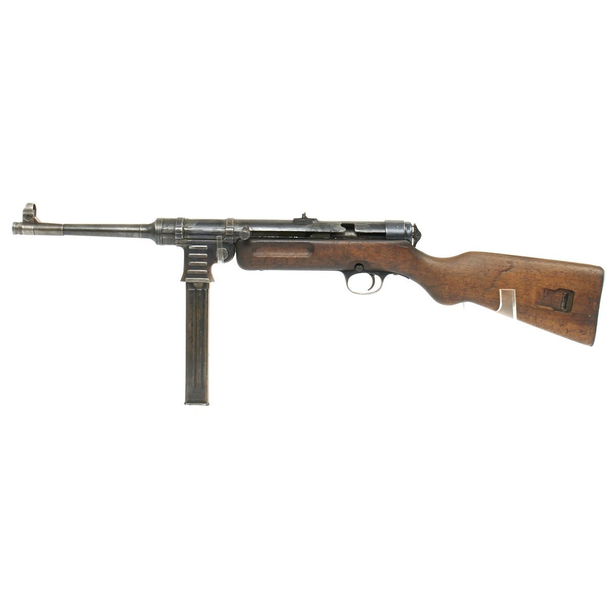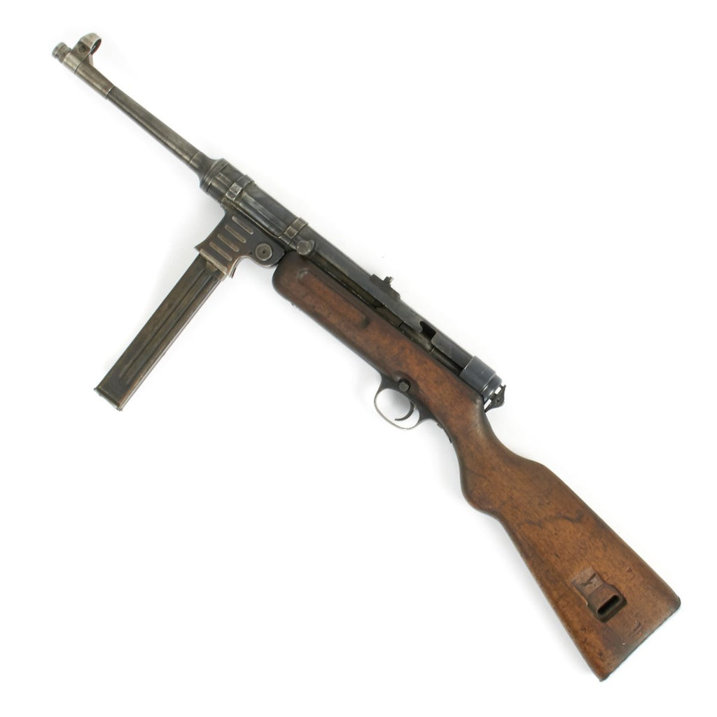 The MP-41 (M.P. 41) submachine gun is blowback operated, selective-fire weapon which fires from an open bolt. It uses a bolt with telescoped return spring guide borrowed from the MP40. The receiver and magazine are also both borrowed from the MP40. The wooden stock and trigger unit with cross-bolt button fire mode selector were taken from the MP-28.