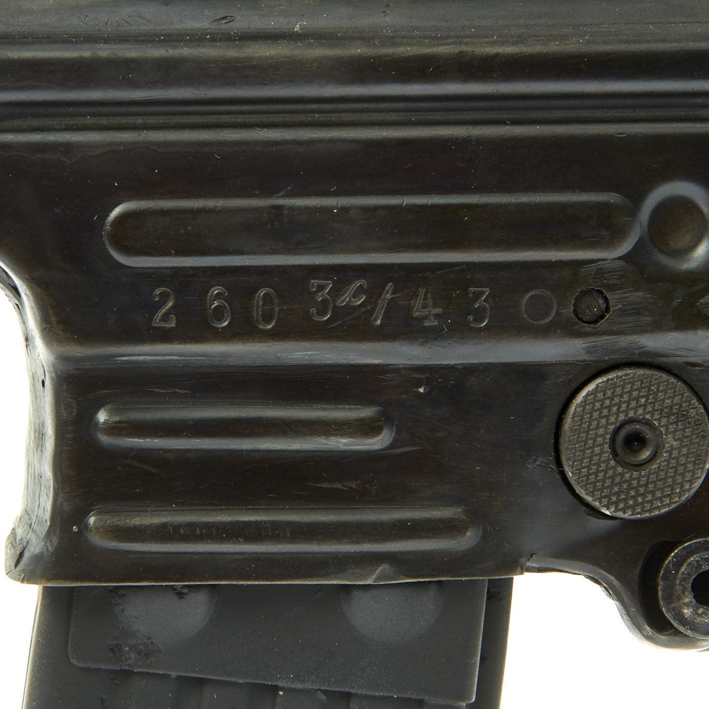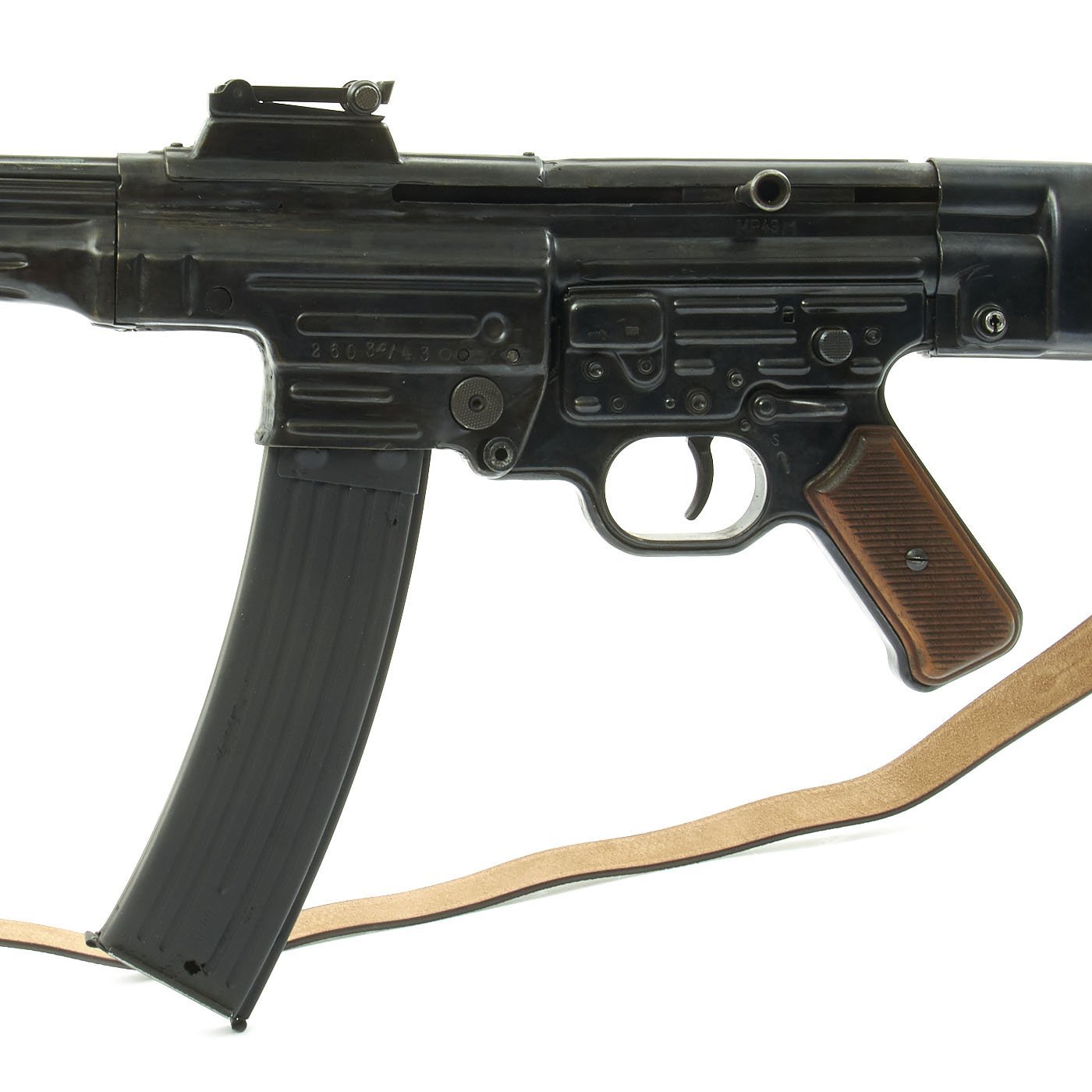 This sample is in excellent condition, bearing original serial number 2603c / 43 above the magazine well, indicating that it was produced in 1943. It bears serial number 4620 c on the butt stock cup and on the operating rod, so this is a "partial matching" gun. There are also multiple Waffenampt inspection codes on various parts of the gun.