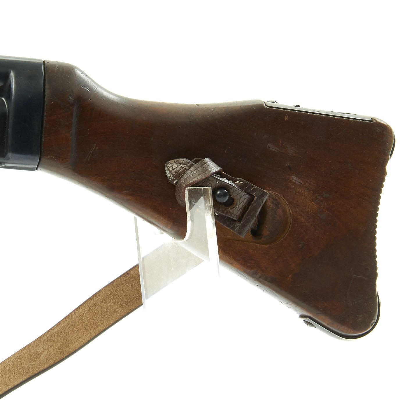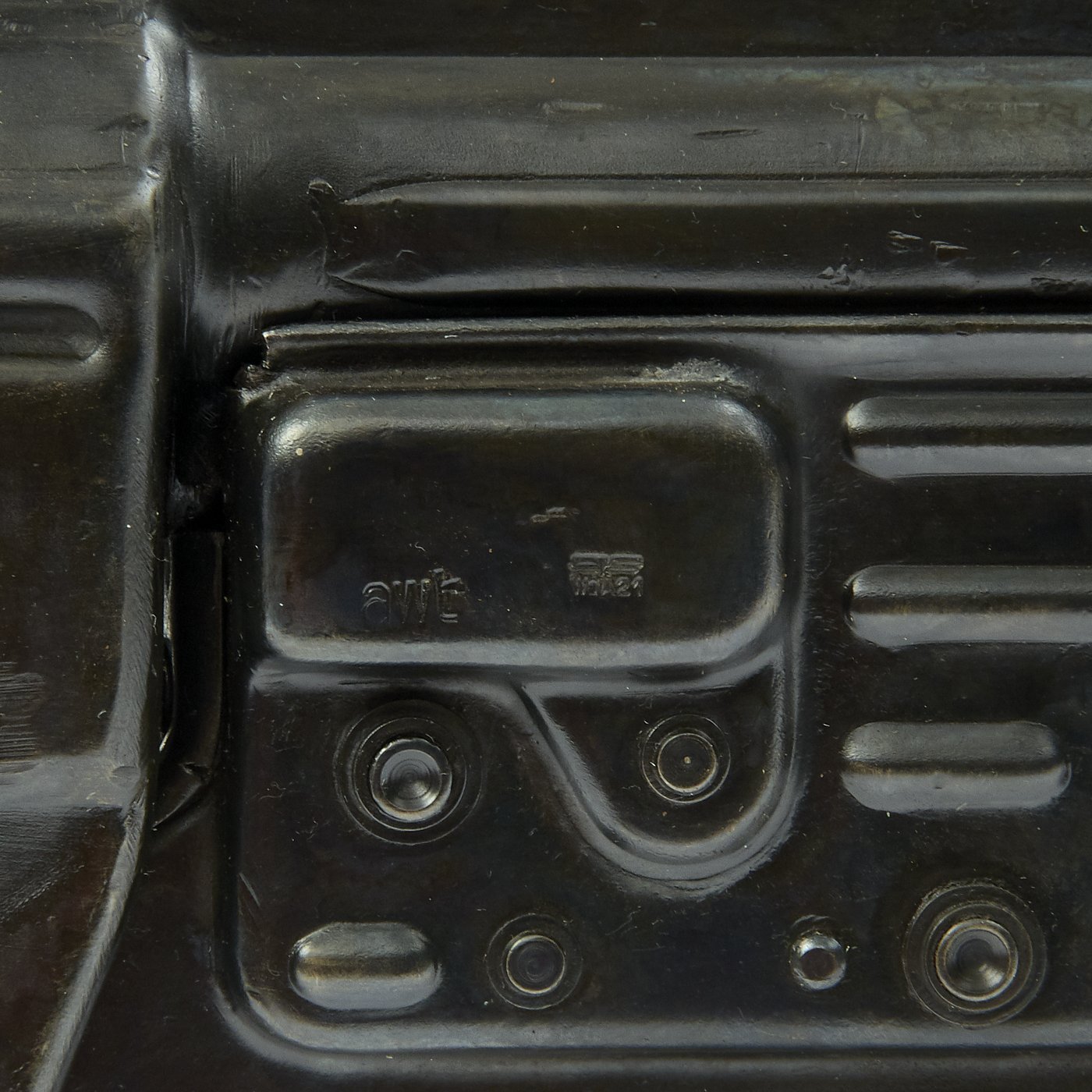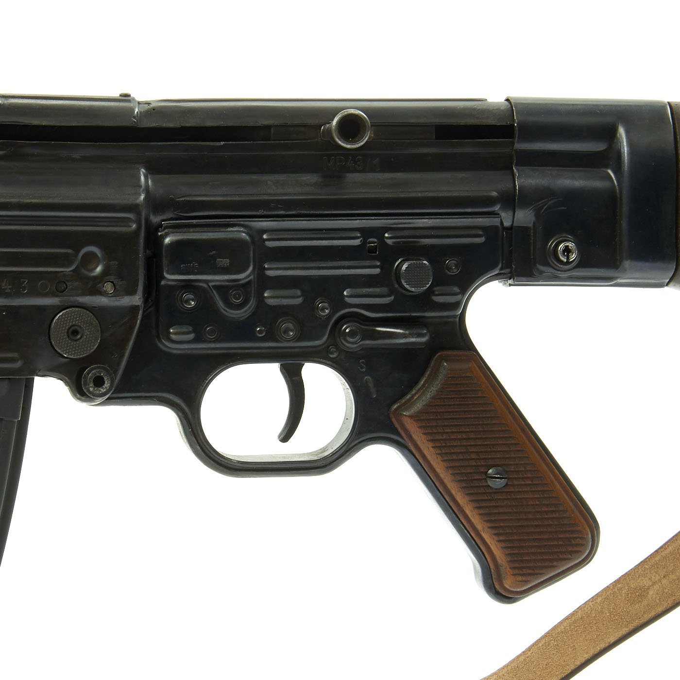 There is no longer any maker code on the receiver, but it is marked MP 43 / 1, indicating it is the first revision of the design. The trigger group is marked awt, for Württembergische Metallwarenfabrik AG, Geislingen-Steige. This manufacturer marking is specifically only found on MP43 components, and usually is not found on later variations. The butt stock cup is marked with cos, for Merz-Werke Gebr. Merz, in Frankfurt am Main, Rheinland. This maker manufactured many small arms components during the war.