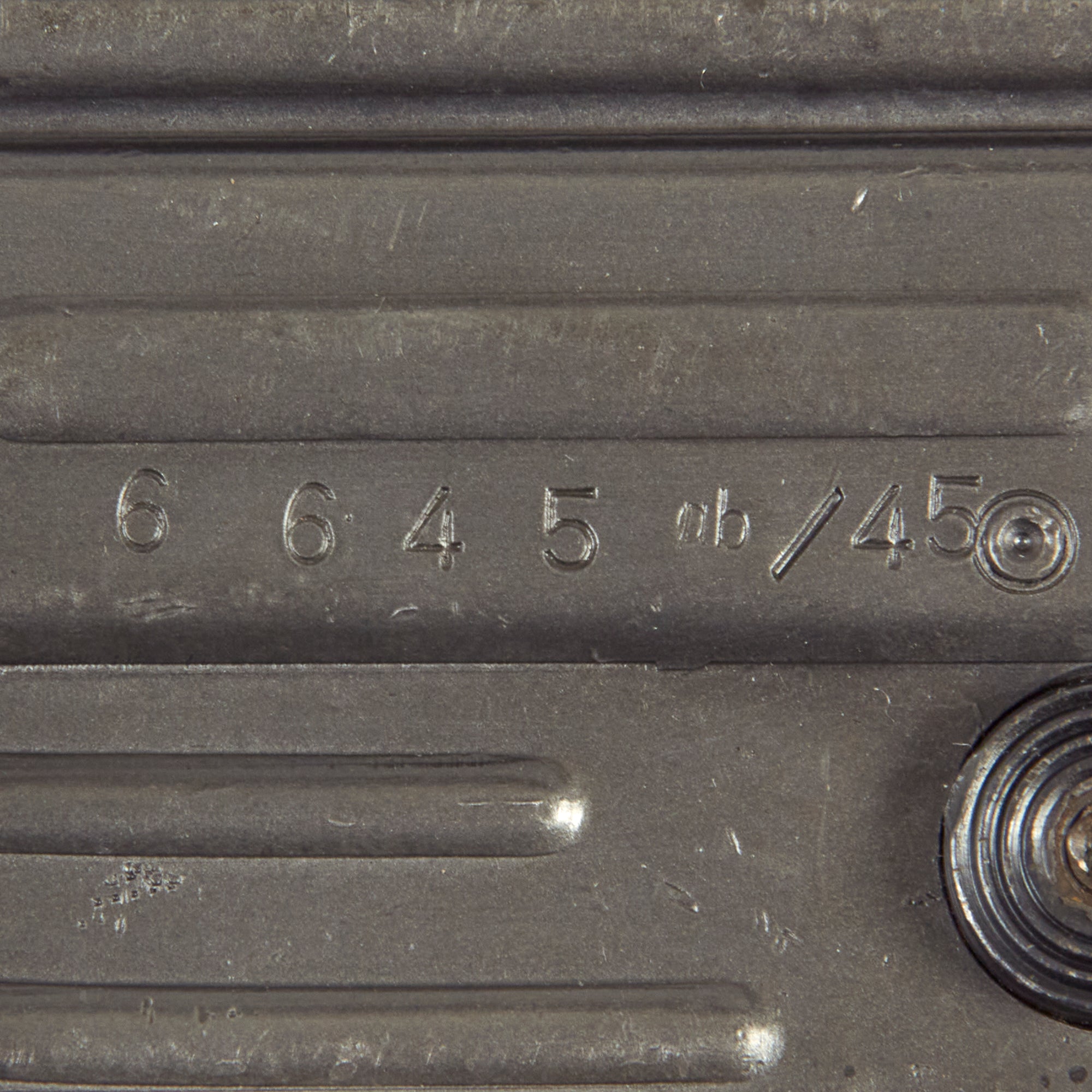 The underside of the hand guard is marked with aqr, for Lux, R. u. O., Metallwaren- und Maschinenfabrik A.-G., located in Marienthal-Bad Liebenstein/Thuringen. This was another known maker of MP44 parts. The trigger group is serial numbered 6568, but we were not able to find any maker code. However, the left front side of the trigger group is marked with Waffenamt WaA21, which is a known inspection stamp seen on MP44 / STG44 trigger groups, but has not been identified. The gas piston / operating rod is marked with alv, for maker Gerhard Adam, located in Oskau-Friedrichsdorf, part of the So-called Sudetenland. This maker has also been seen on MP 44 magazine housings. The large number of different makers involved with making this gun shows just how important it was to the war effort.