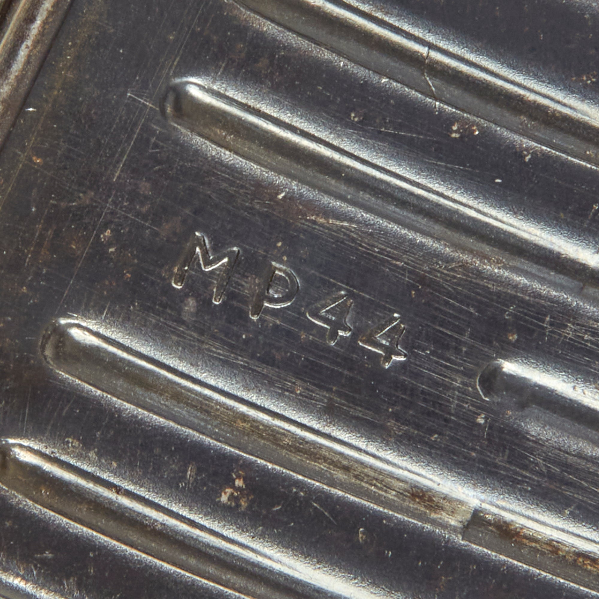 Included with the display gun is an original MP44 marked magazine in fantastic condition, maker marked gqm, for Loch und Hartenberger in Idar-Oberstein. This maker made various small arms components as well as magazines for the MP40 and MP 44. It also bears the correct Waffenamt WaAA98 code for this maker. Magazine will have the spring and follower removed if shipped to a state that prohibits high capacity magazines.