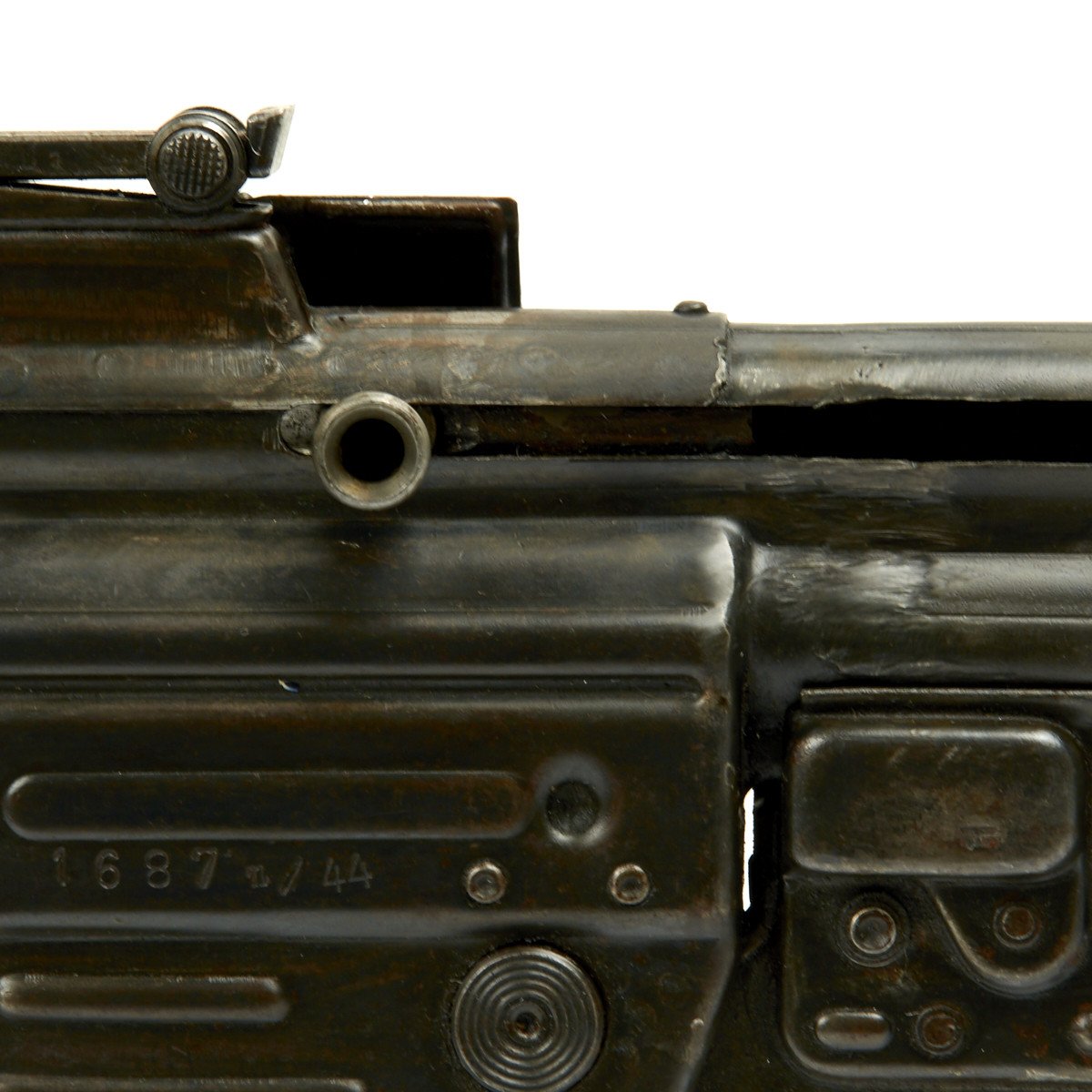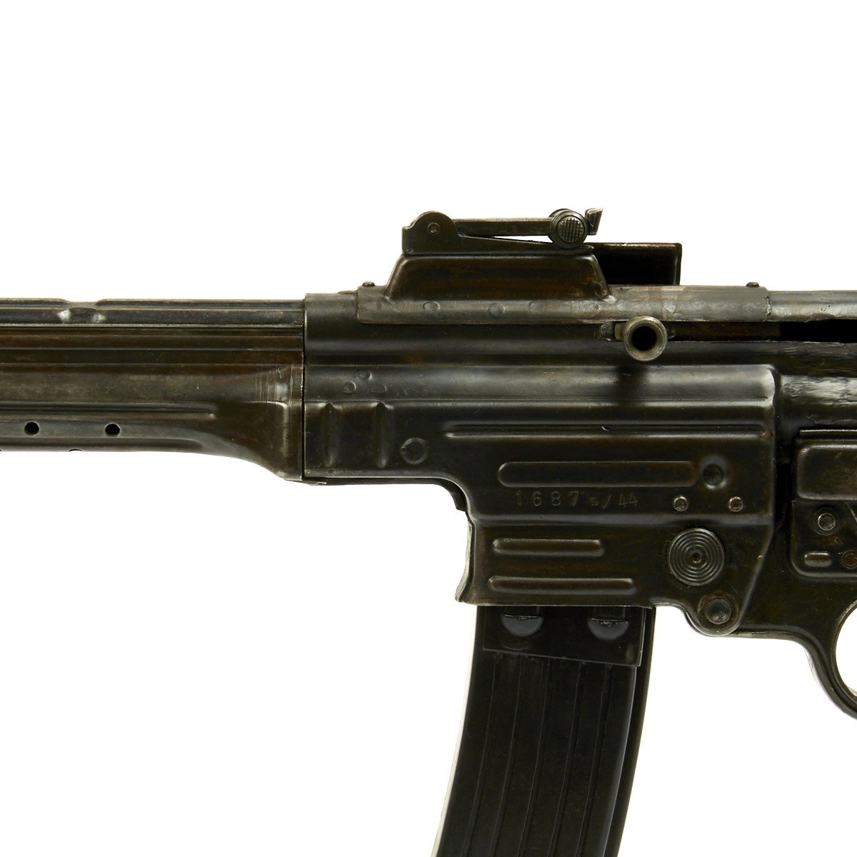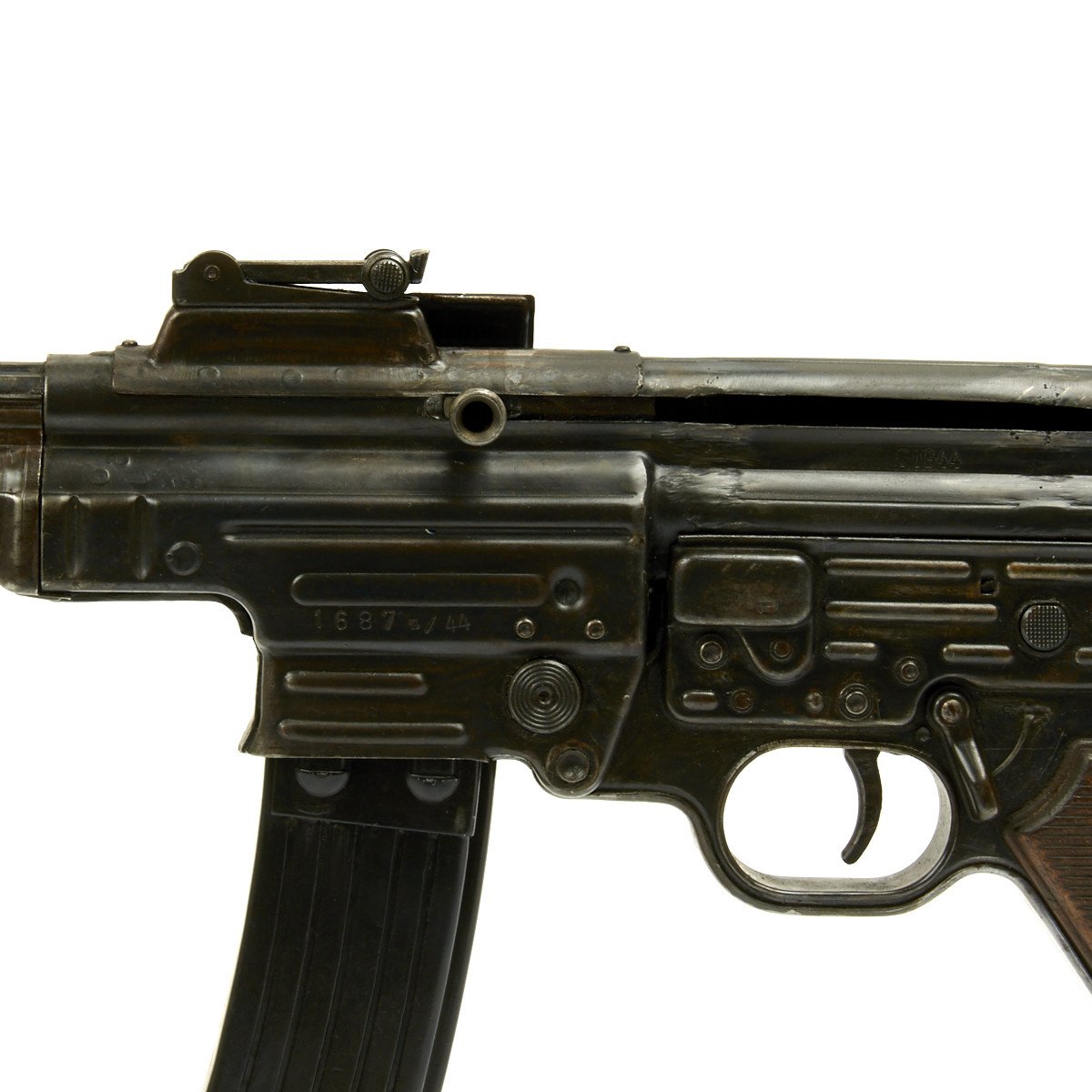 This sample is in excellent condition bearing original serial number 1687, multiple Waffenamt Codes and is dated 1944! Both the receiver and trigger group have inspection stamps. Constructed by a precision-minded master-craftsman exclusively for IMA this display gun was built from an IMA all original WW2 era parts set that includes an original demilitarized receiver, and a non-functional reproduction metal MP44 magazine.