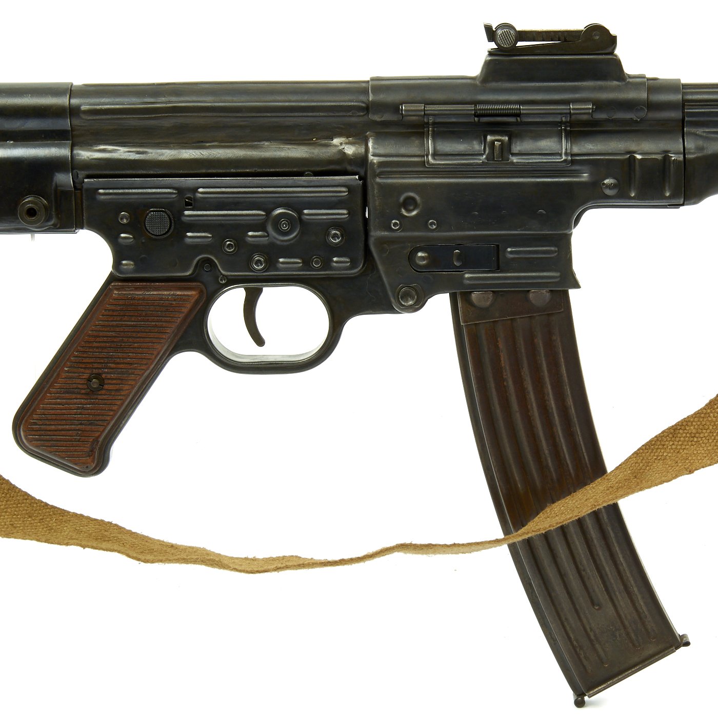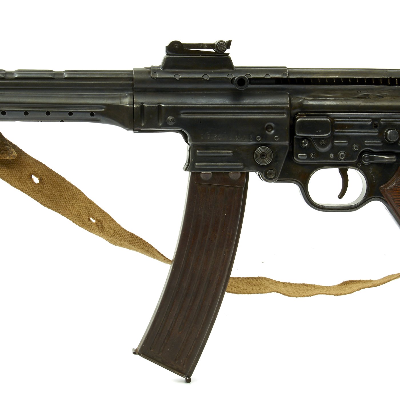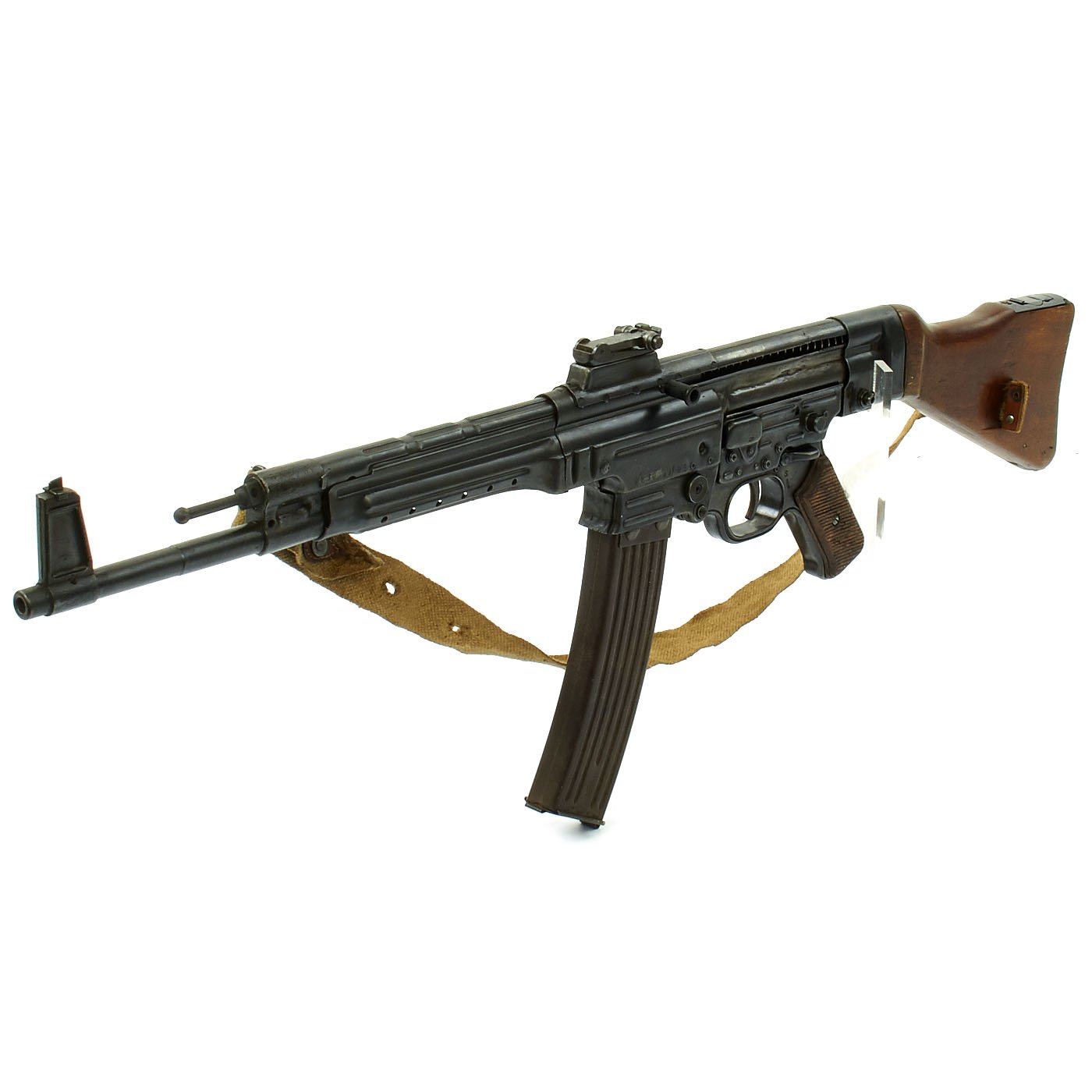 This sample is in excellent condition bearing original serial number 9930, multiple Waffenamt Codes and is dated 1945. Meaning this was one of the very last STG44s ever produced! It was such a late production that this is one of the most uncommon ones indicated by the fact that the barrel muzzle is not threaded. Both the receiver and trigger group have inspection stamps. Constructed by one of our own precision-minded master-craftsman gunsmiths. This display gun was built from the ground up with exacting detail and looks fantastic. Also included is an original MP44 magazine. Will ship intact where permissible and deactivated where prohibited. Finally, we've added an ultra rare original canvas sling which is nicely maker marked and 1945 dated. This sling is perhaps even more rare than the gun!