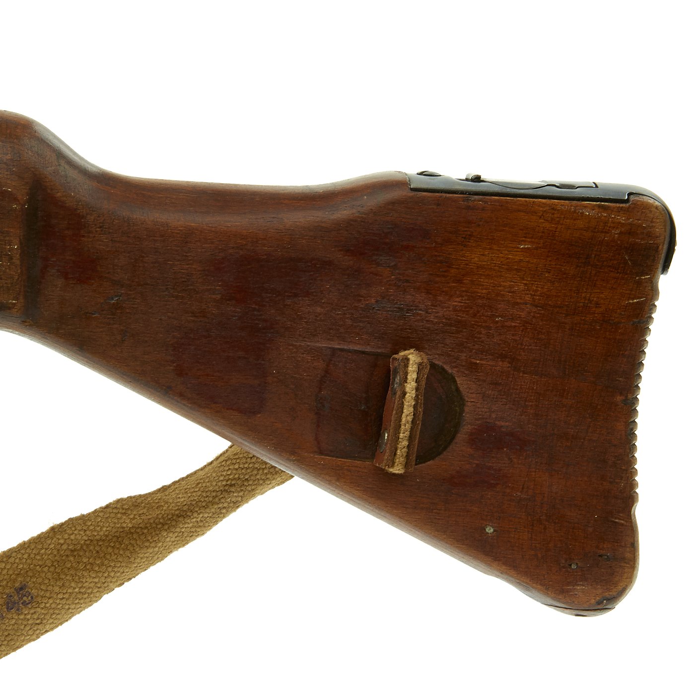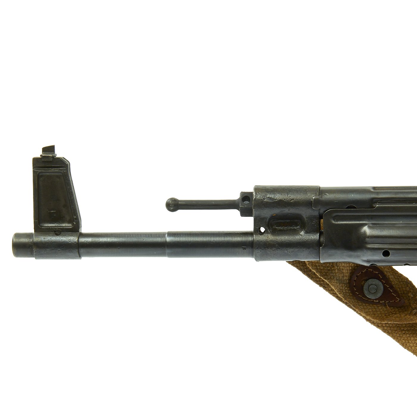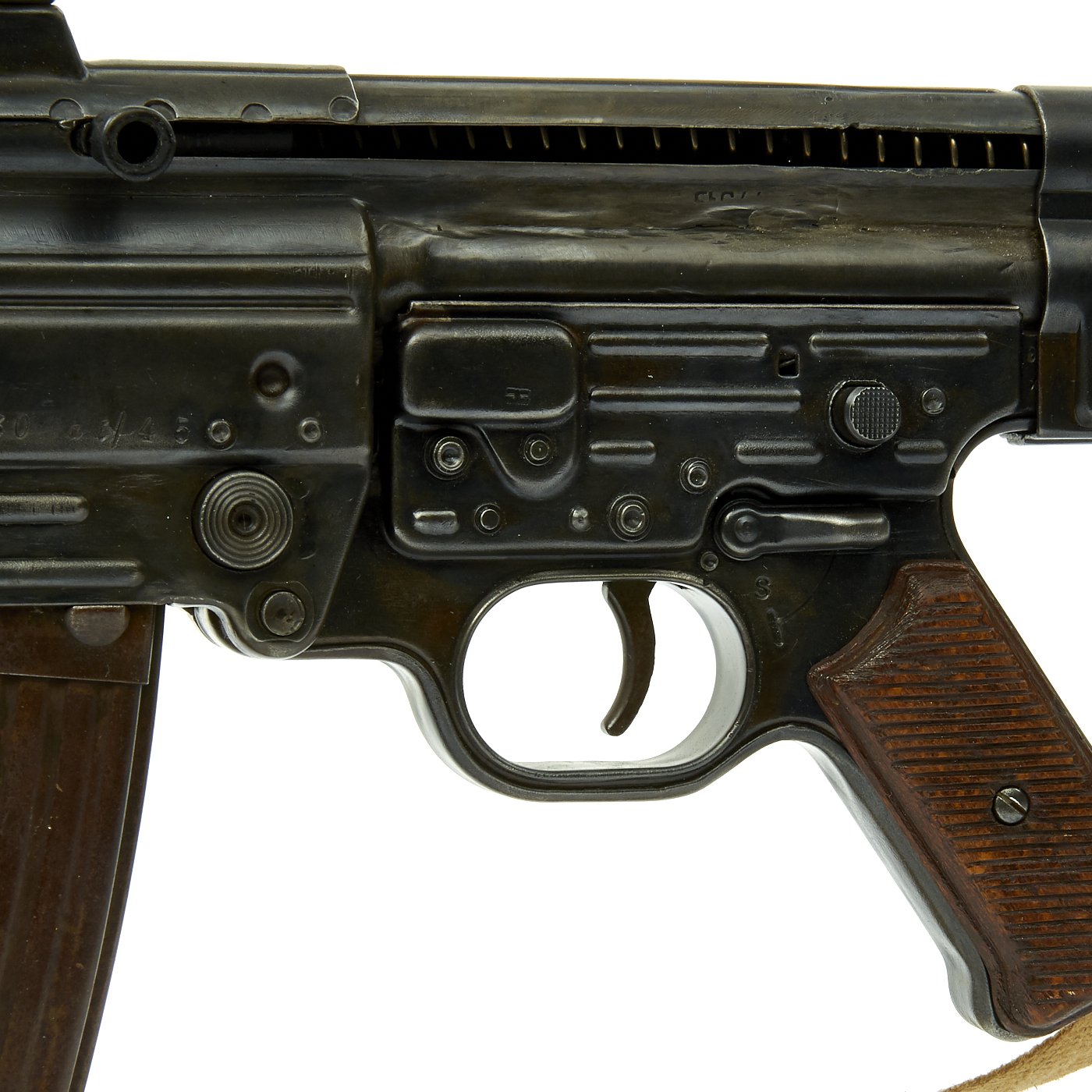 This sample is in excellent condition bearing original serial number 9930, multiple Waffenamt Codes and is dated 1945. Meaning this was one of the very last STG44s ever produced! It was such a late production that this is one of the most uncommon ones indicated by the fact that the barrel muzzle is not threaded. Both the receiver and trigger group have inspection stamps. Constructed by one of our own precision-minded master-craftsman gunsmiths. This display gun was built from the ground up with exacting detail and looks fantastic. Also included is an original MP44 magazine. Will ship intact where permissible and deactivated where prohibited. Finally, we've added an ultra rare original canvas sling which is nicely maker marked and 1945 dated. This sling is perhaps even more rare than the gun!