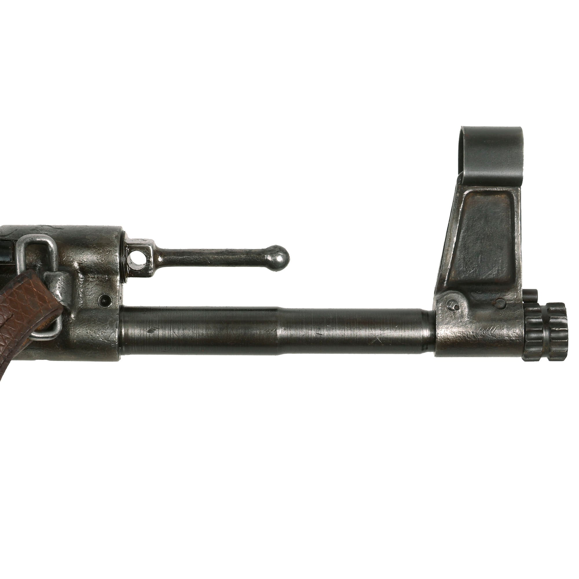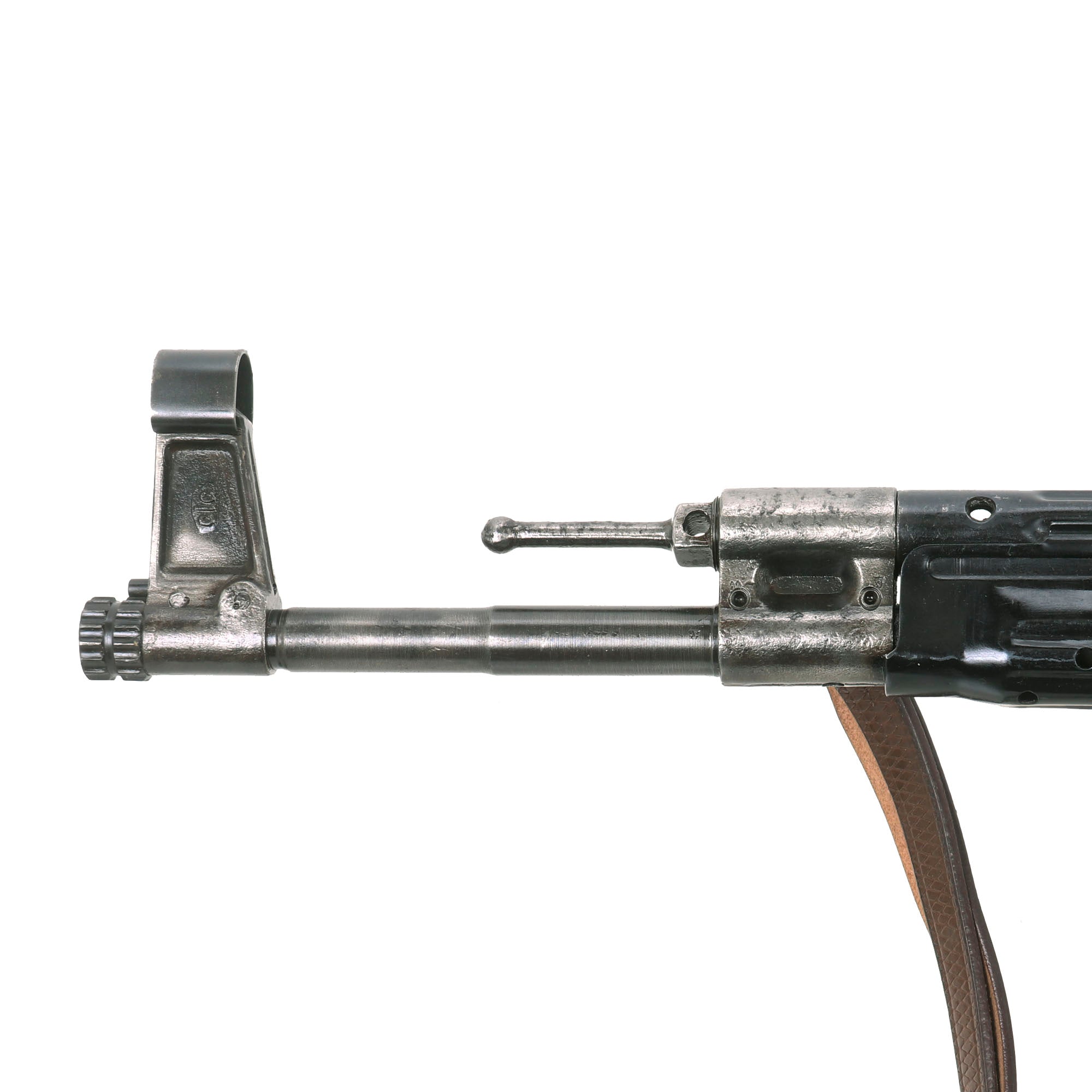 The barrel does not have any maker markings, but is marked on the left side with a Waffenamt Eagle / 37 inspection stamp, associated with manufacture in Suhl, Germany, home of many weapons manufacturers. The same inspection stamp appears on the left side of the gas regulator. The front side of the front sight base and left side of the gas regulator assembly are marked with ce, for the famous J.P. Sauer und Sohn, Waffenfabrik, located in Suhl, Thuringia. The left side of the front sight base is additionally marked clc, the maker code for Richard Ab. Herder of Solingen, a maker of cutlery and tools in the legendary "City of Blades", and a known maker of front sight bases.