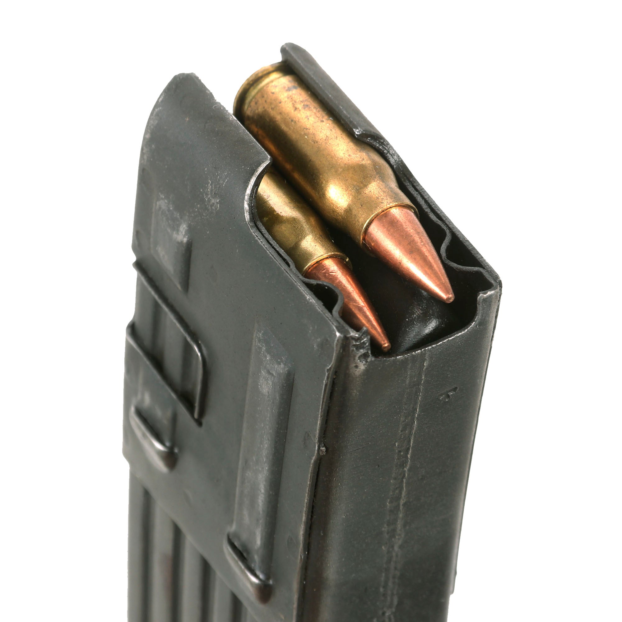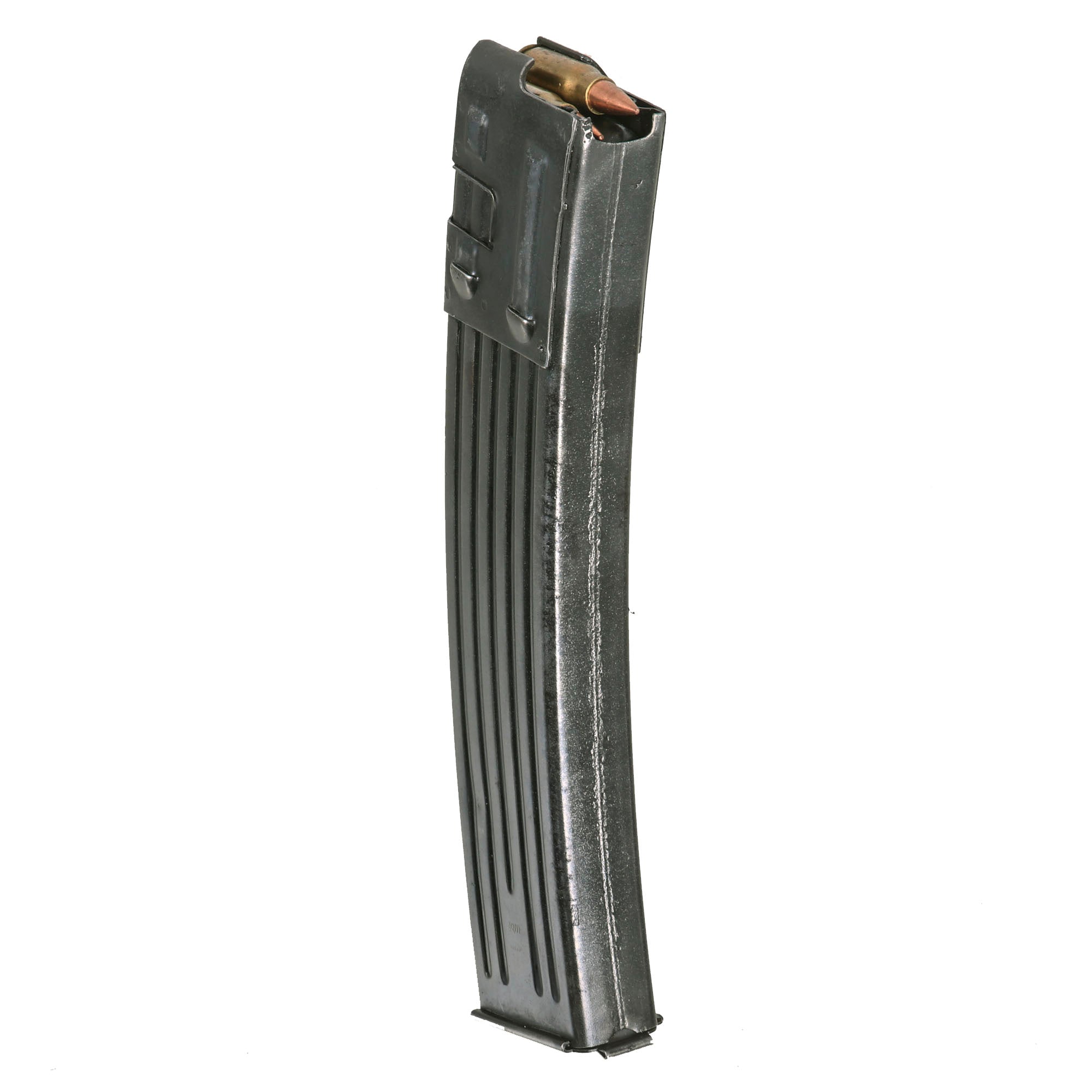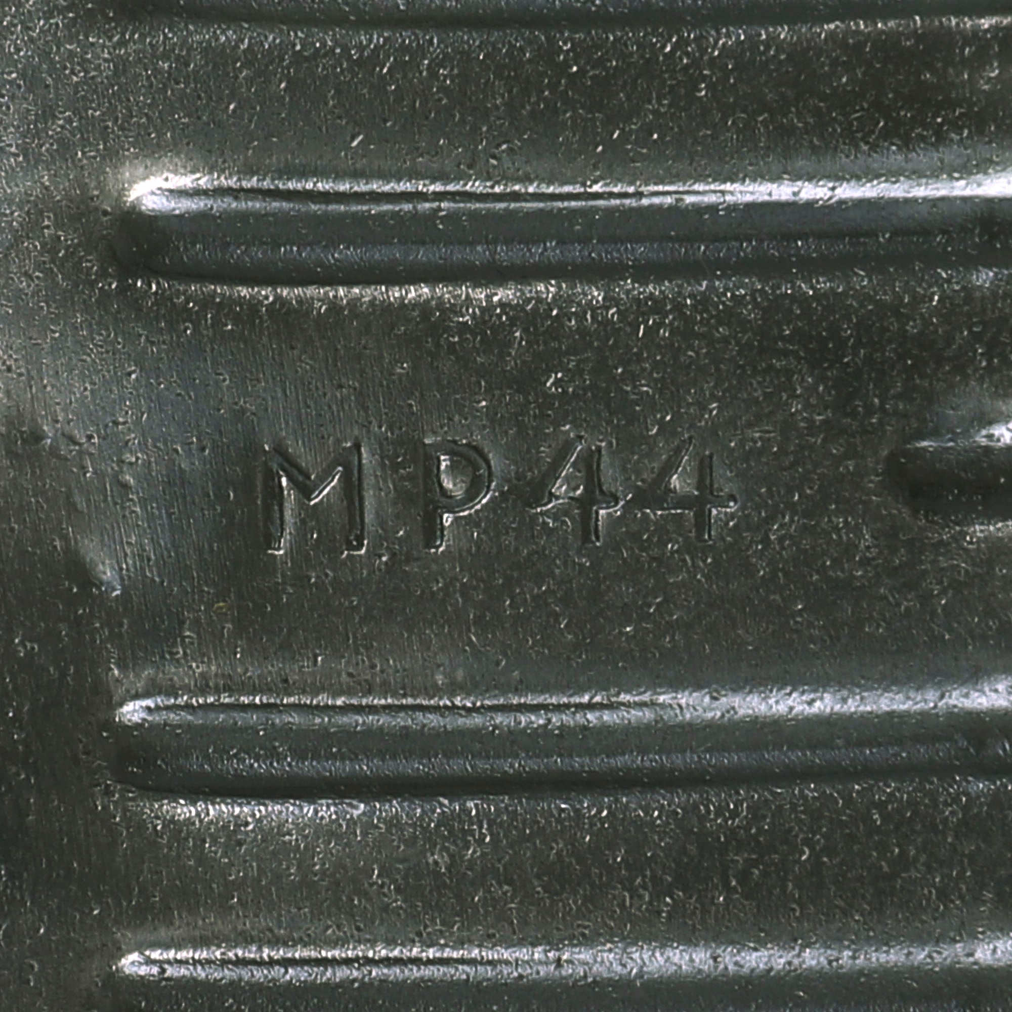 Included with the display gun is an lovely original MP44 marked magazine in fantastic condition, maker marked gqm, for Loch und Hartenberger in Idar-Oberstein. This maker made various small arms components as well as magazines for the MP40 and MP 44. It also bears the correct Waffenamt WaAA98 code for this maker. The floor plate is coded qlx, the late war maker code for C.G. Haenel of Suhl, and the spring is marked C.H.N., for Gebr. Reinhold, Maschinenfabrik und Eisengiesserei in Zwötzen bei Gera, Thüringen. We do not know if the floor plate was replaced at some point, or the work subcontracted out. Magazine will have the spring and follower removed if shipped to a state that prohibits high capacity magazines.