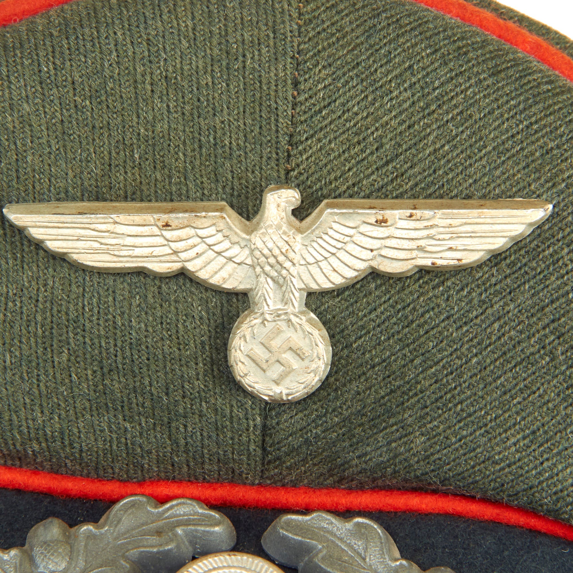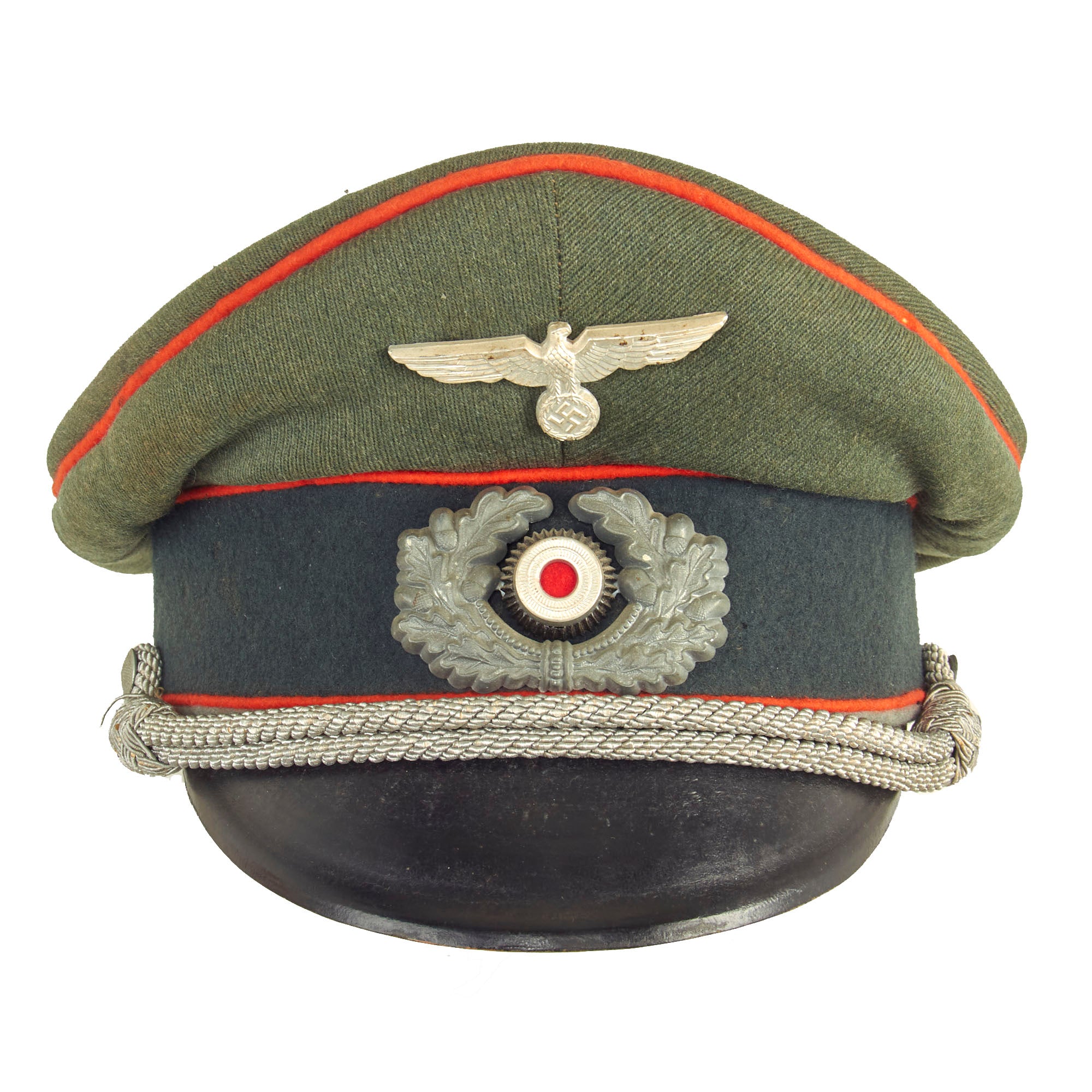 The visor cap (Schirmmütze) was an important part of the headgear worn by German uniformed military, civil, paramilitary and political organizations during the Third Reich. This was the standard cloth headgear worn as a part of the service uniform. Visor caps were worn outdoors as well as indoors, and were often required to be worn by all personnel on duty. Visor caps were made in versions specific to each organization and were often further differentiated through the use of insignia, colored piping, or style of chin cord, to indicate rank, role or branch. The insignia used on these caps ranged from simple stamped metal emblems, to elaborate hand embroidery. Visor caps were issued to enlisted soldiers and NCOs in the military and in some other organizations. Officers had to purchase their own hats, and lower ranks could choose to purchase caps that were of a higher quality than the rather basic, issue examples. The private purchase caps were generally made in very high quality, with fine materials. A wide variety of fabrics were used, from Trikot and doeskin, to heavy wool, or even lightweight white fabric for summer wear. In the military, issue of these caps was generally suspended shortly after the outbreak of the war, but they continued to be worn by some troops until the end of the war.