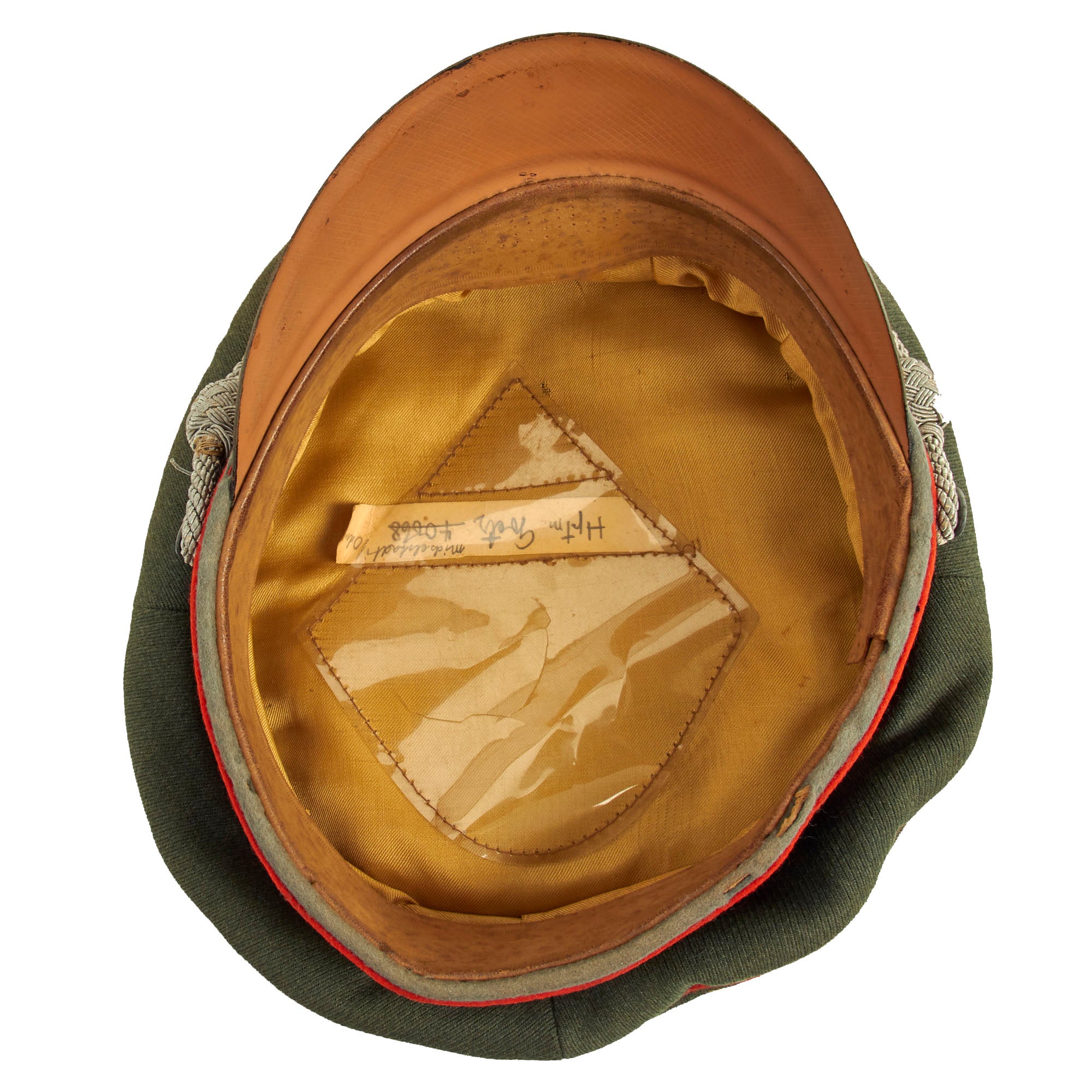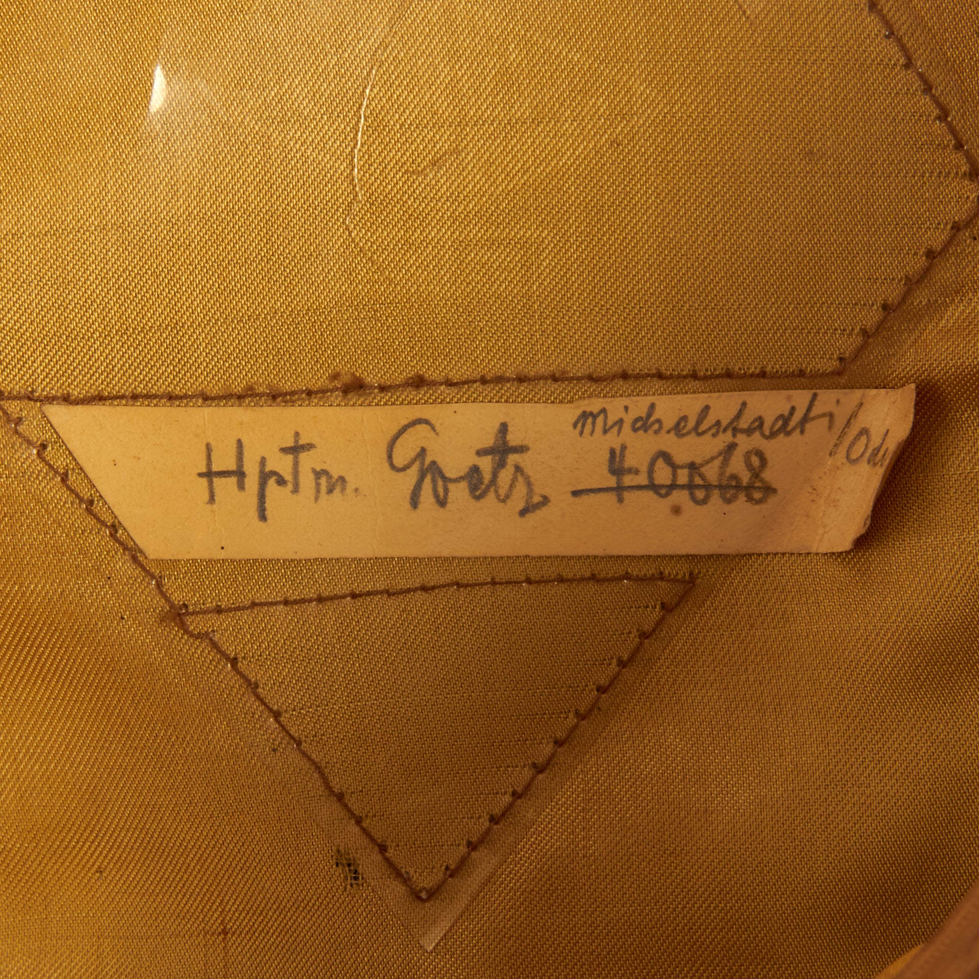 The inside of the cap is lined with cream sheer fabric, most likely rayon. The top plastic shield is fully present, though there is a crack in it. The original maker logo is completely gone, however we can still see a "ghost" under the sweatshield, which looks to read EREL and EXTRA, but we cannot confirm this. There is also an aged name tag in the slot, which reads Hptm. Goetz 40048 Michelstadt / Oden. Definitely some great research potential here!