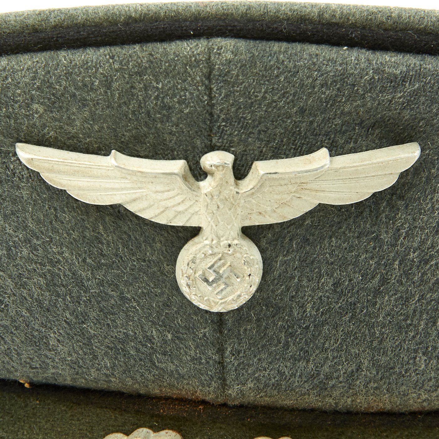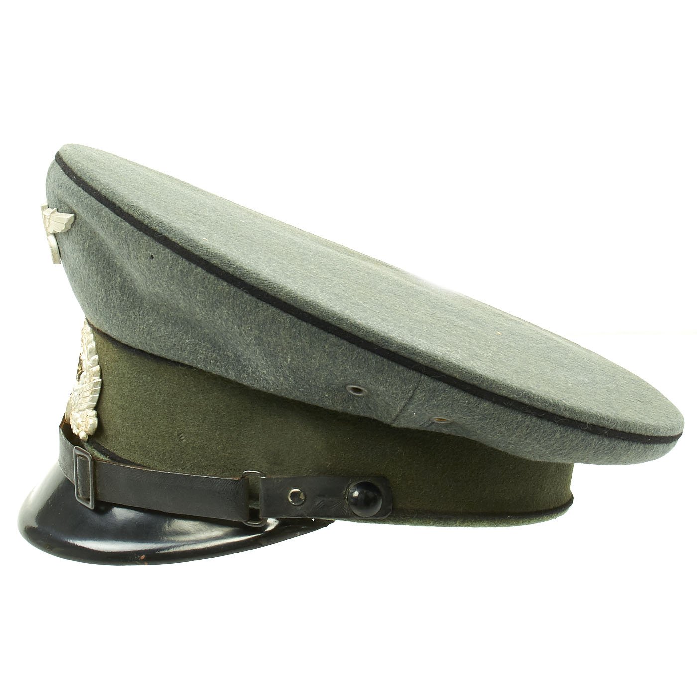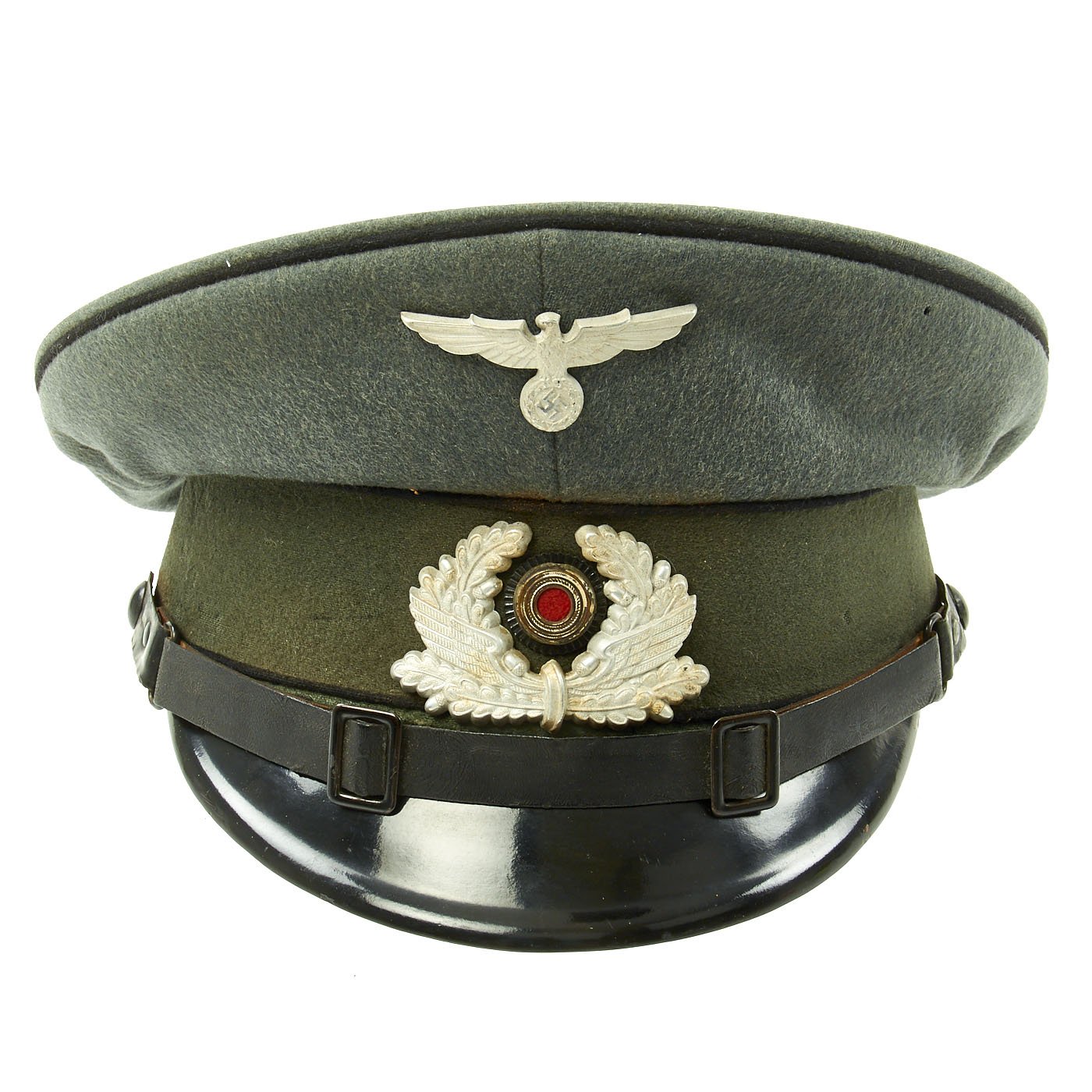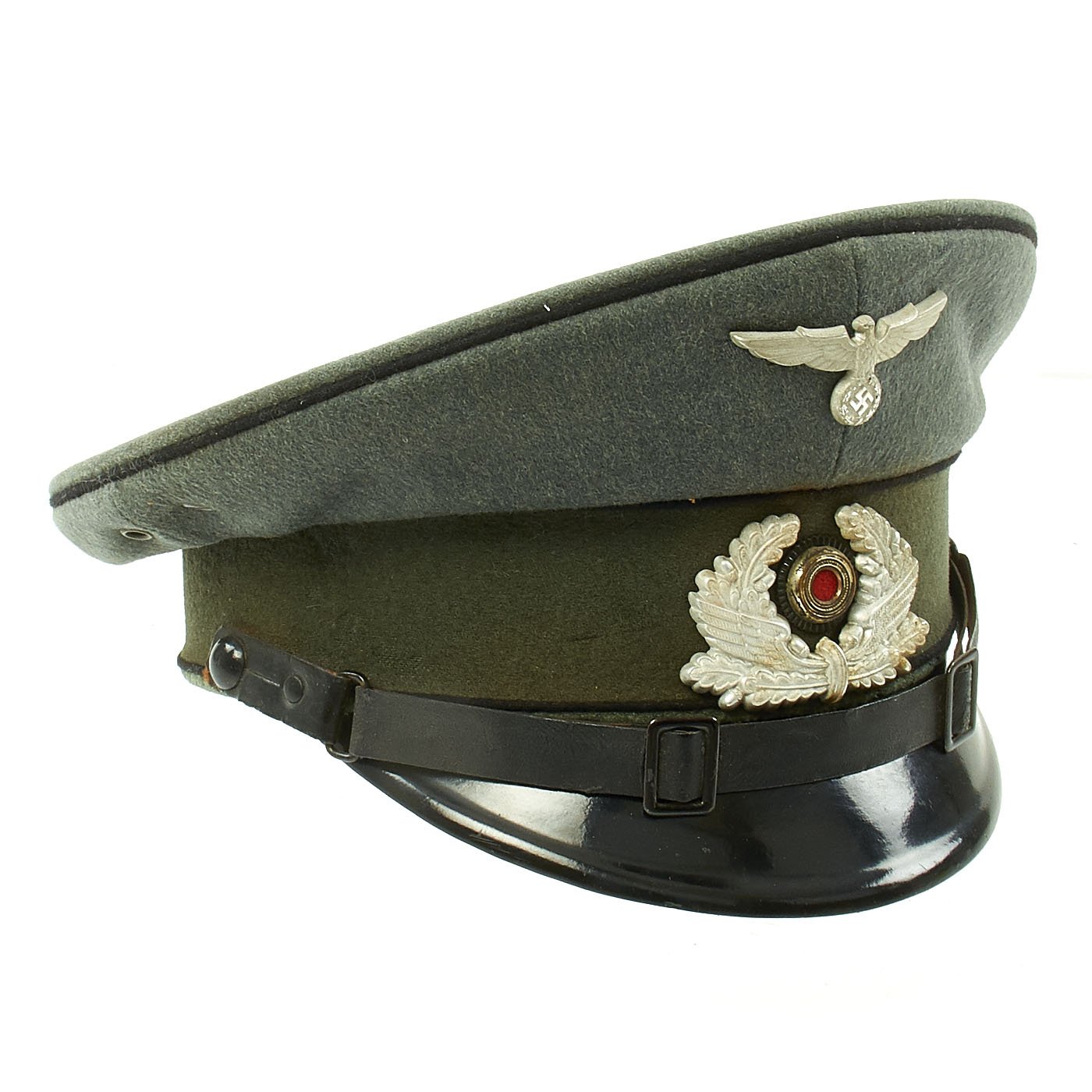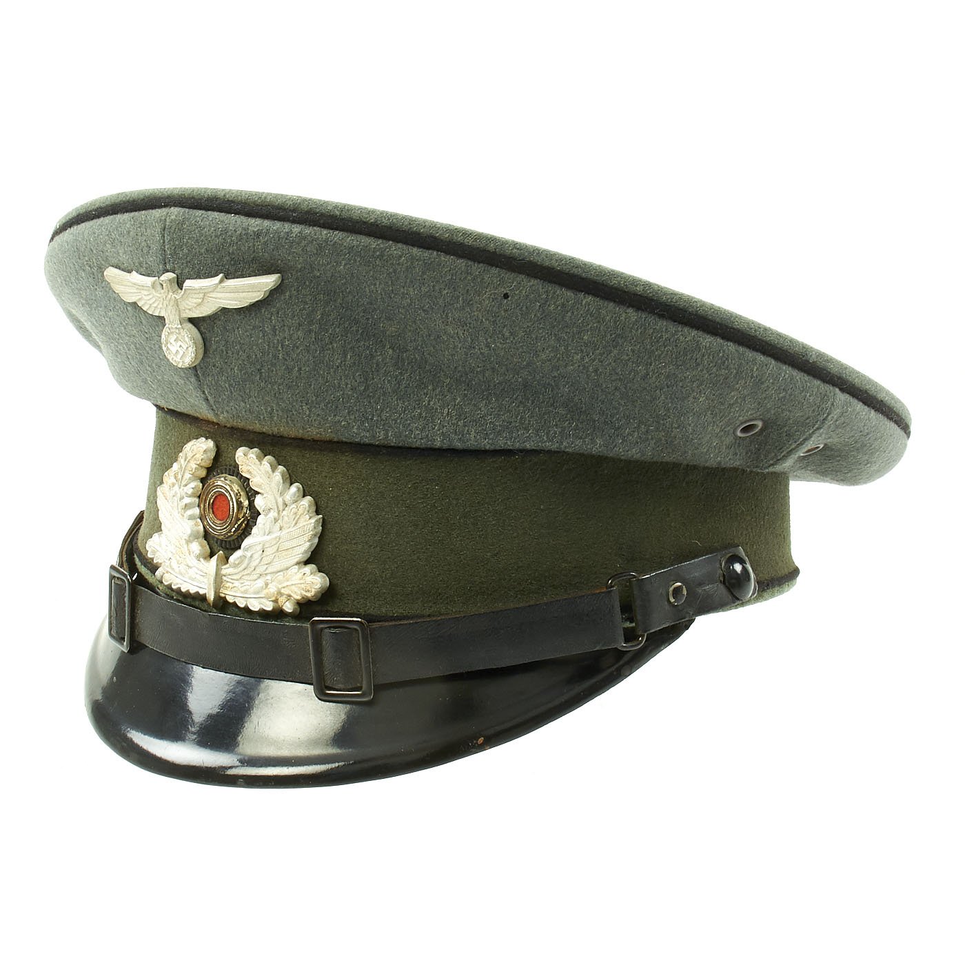 The visor cap (Schirmmütze) was an important part of the headgear worn by German uniformed military, civil, paramilitary and political organizations during the Third Reich. This was the standard cloth headgear worn as a part of the service uniform. Visor caps were worn outdoors as well as indoors, and were often required to be worn by all personnel on duty. Visor caps were made in versions specific to each organization and were often further differentiated through the use of insignia, colored piping, or style of chin cord, to indicate rank, role or branch. The insignia used on these caps ranged from simple stamped metal emblems, to elaborate hand embroidery. Visor caps were issued to enlisted soldiers and NCOs in the military and in some other organizations. Officers had to purchase their own hats, and lower ranks could choose to purchase caps that were of a higher quality than the rather basic, issue examples. The private purchase caps were generally made in very high quality, with fine materials. A wide variety of fabrics were used, from Trikot and doeskin, to heavy wool, or even lightweight white fabric for summer wear. In the military, issue of these caps was generally suspended shortly after the outbreak of the war, but they continued to be worn by some troops until the end of the war.