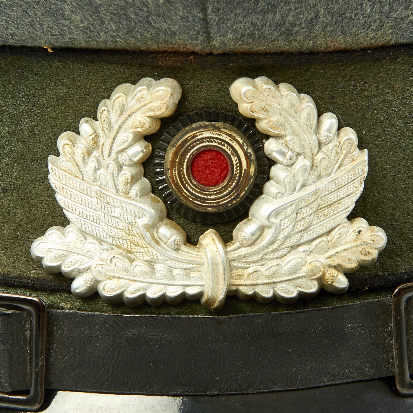 Original Item: Only One Available. This is a really attractive example of a German WWII DRB Bahnschutzpolizei (Railway protection police) Schirmmütze (visor cap), complete with a name tag! This example shows high quality fabrication, made with the typical Heer style feldgrau (Field Gray) green / gray wool with a forest green band and a traditional high front. The cap has black Waffenfarbe (corps color) piping along the top edge and flanking either side of the band, indicating the branch to be Railway.
