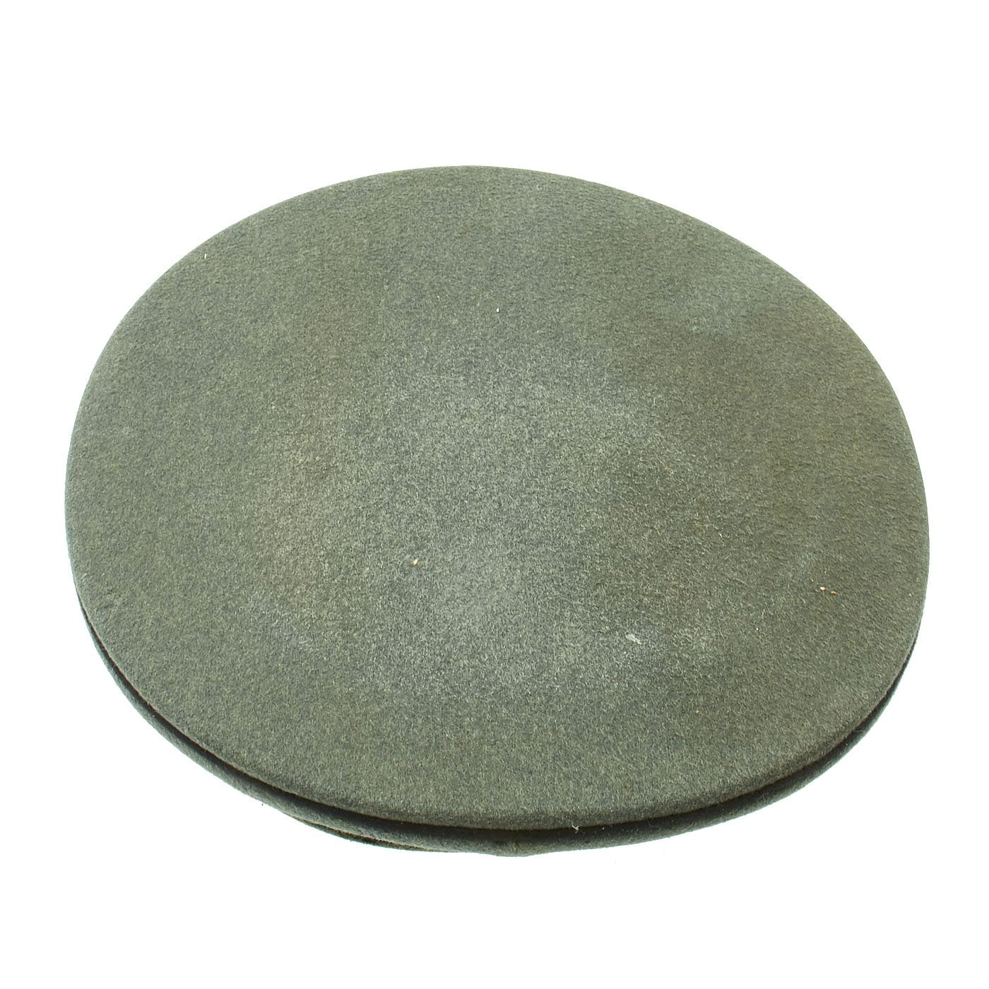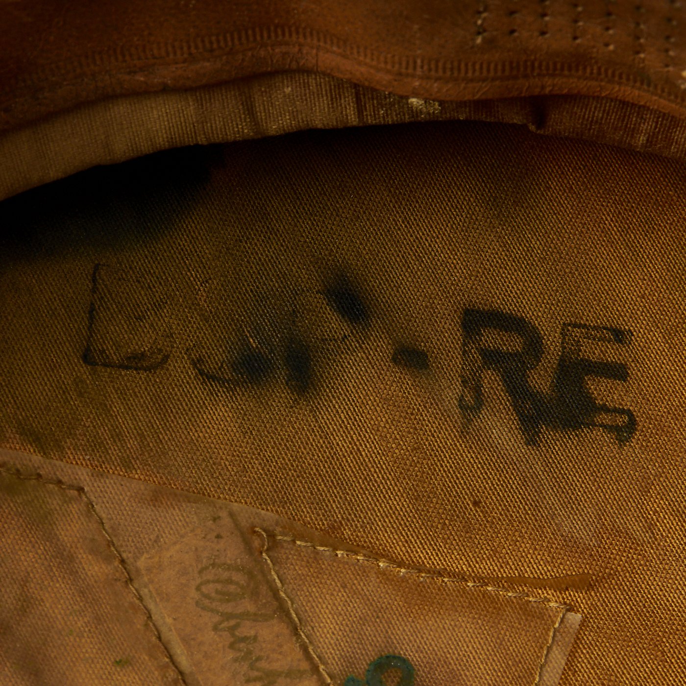 The condition of the cap is quite nice, though as with many wool caps, there are some moth nips to the exterior The interior is quite nice, showing light to moderate wear, though it definitely has been exposed to moisture during service. The leather sweatband stitching has rotted out in areas, which is typical.