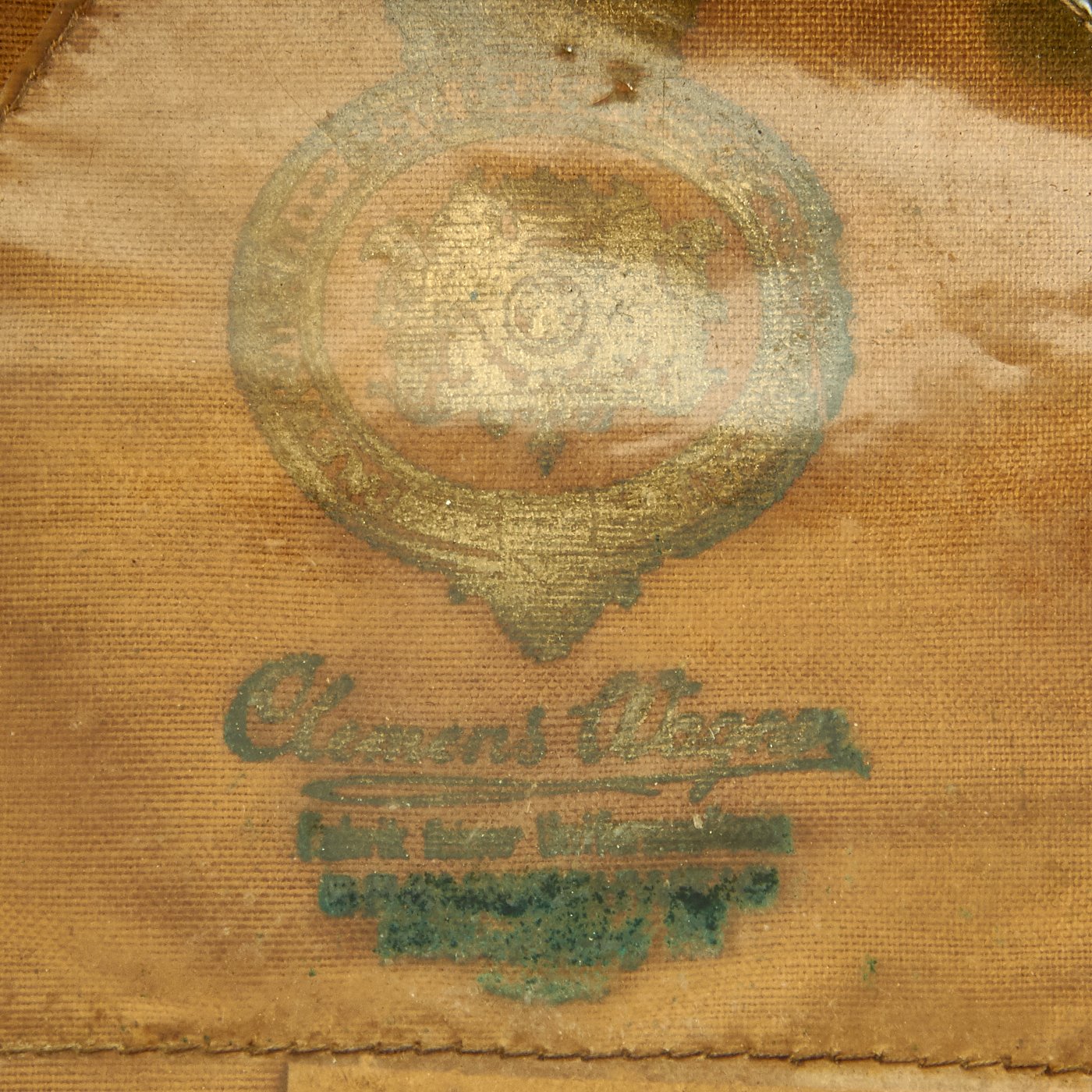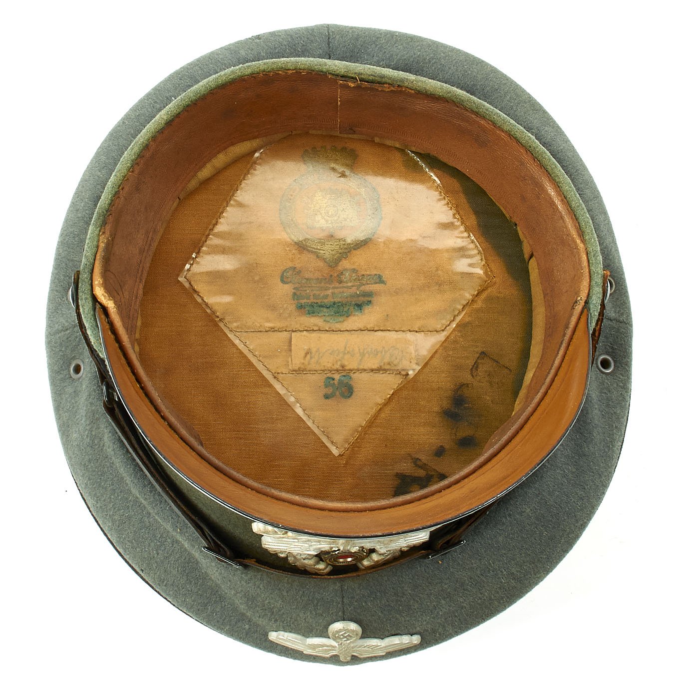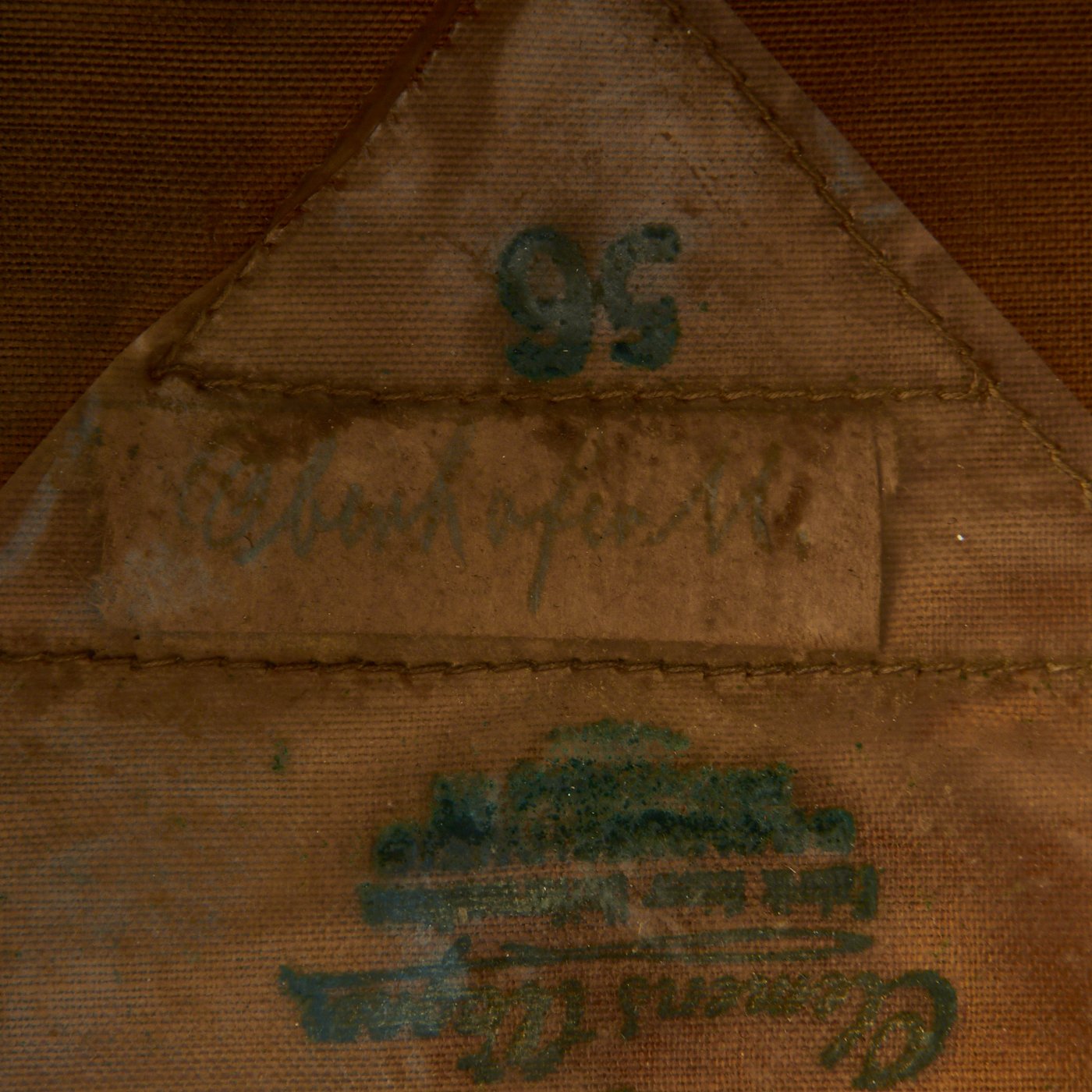 The inside of the cap is lined with tan sheer fabric. The top plastic shield is fully present. It still bears the makers logo and name Clemens Wagner underneath, though the metal paint has oxidized to a greenish patina, and not all of the words can be read. The size is indicated as 56, and there is a name tag, though it cannot be read.