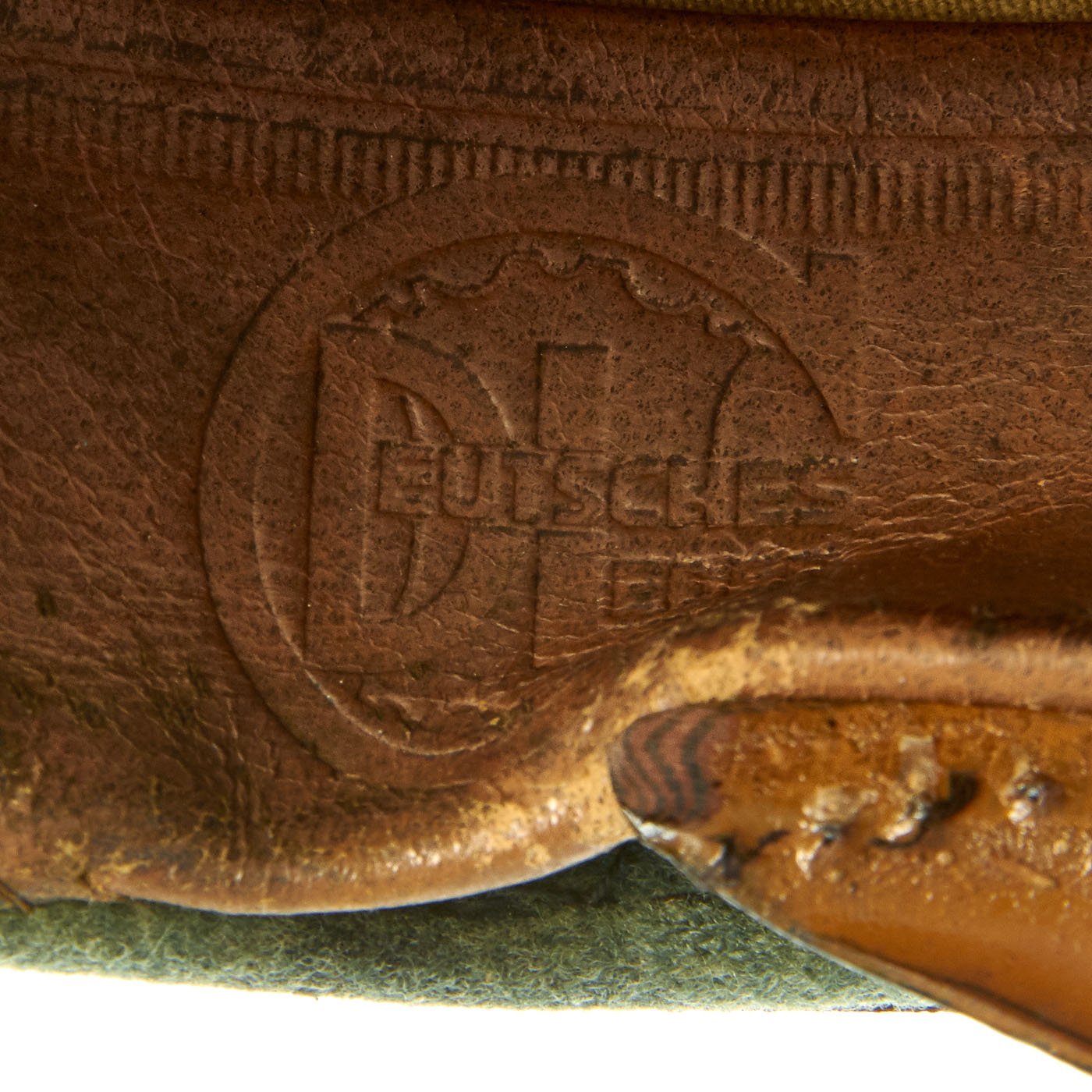 It is decorated with a well detailed silvered aluminum eagle insignia on the peak and and an open silvered aluminum oak leaf and acorn wreath surrounding a metal tri-color cockade on the band. The wreath also incorporates the "Winged Wheel" DRB emblem on the bottom, which is specific to the Railway Protection Police. The dual-buckled black leather chinstrap, designating the wearer to be an enlisted man, is attached to black lacquered buttons on either side. The vulcanfibre visor has a smooth black leather-look upper, exhibiting slight wear along the edge and is orange on the underside. The brown leather sweatband is in good supple condition and has an embossed maker mark on the left side.