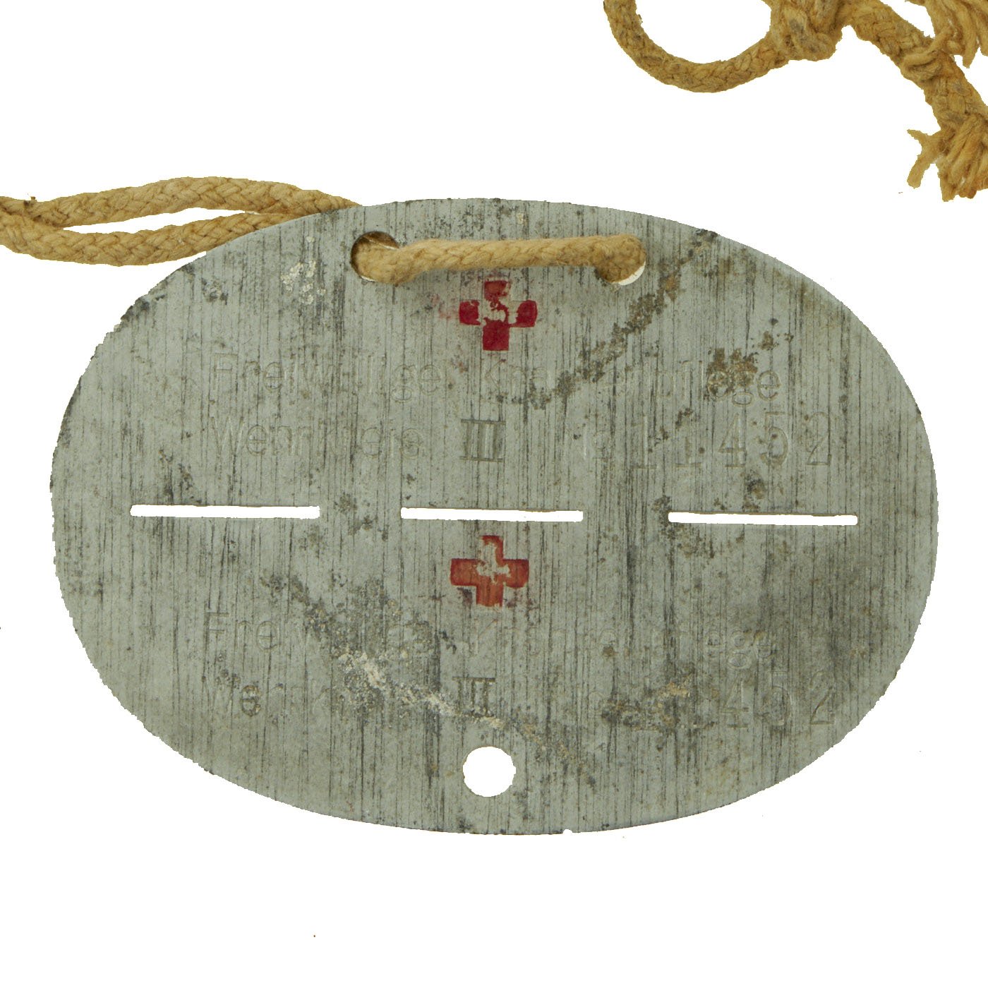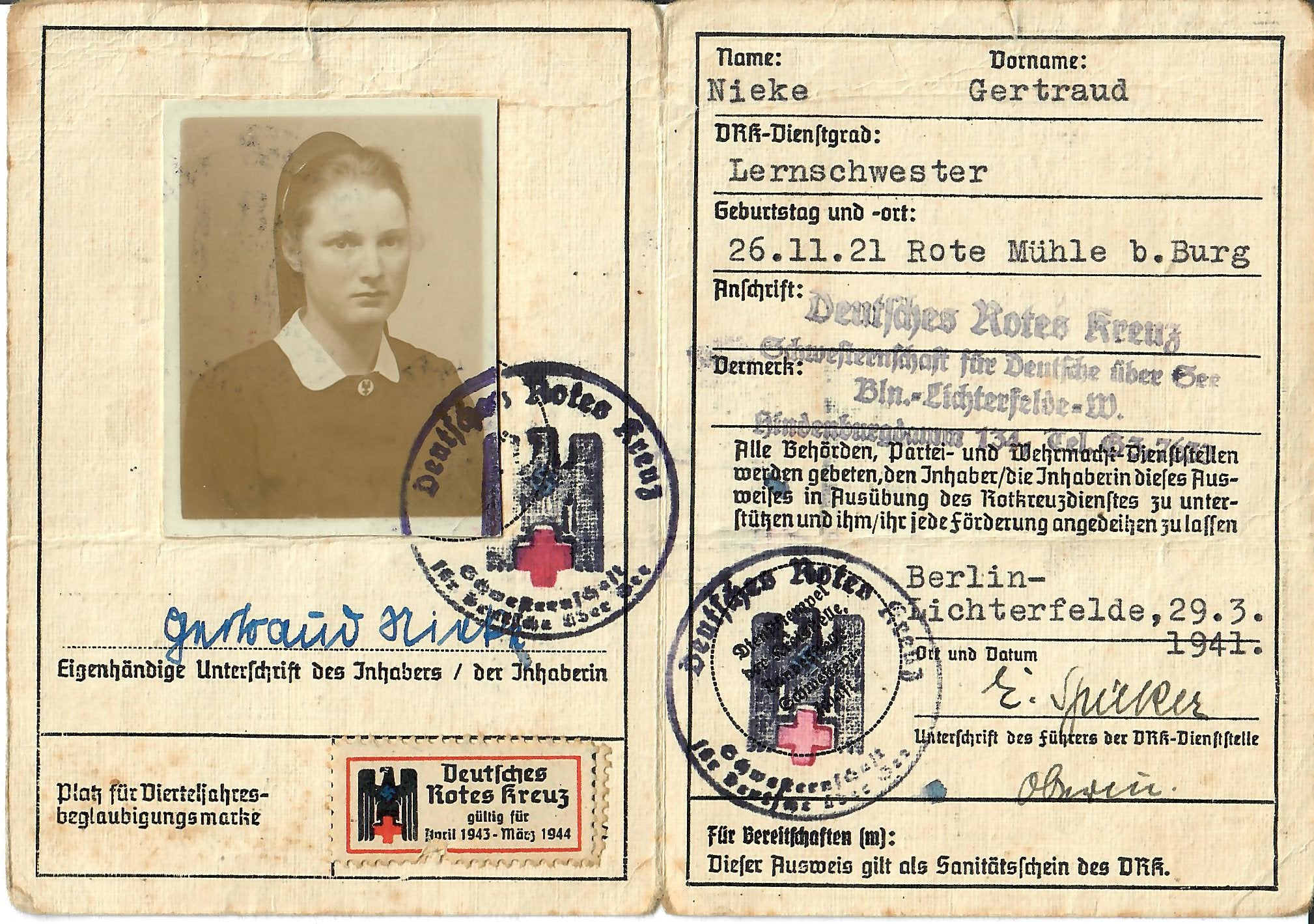 The Dog Tag bears a "Red Cross" symbol, and indicates it is for Freiwillige Krankenpflege Wehrkreis III No 11452 (Voluntary Nursing Military District III No 11452). There are no real records that could be used to link this to Nieke, but we assume that this was her dog tag.