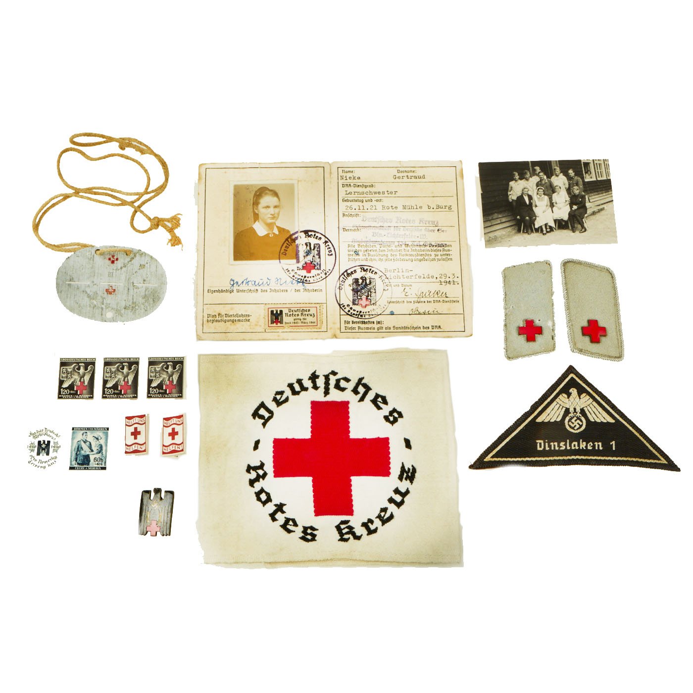 Original Item: One of a Kind Set. This is a fantastic German WWII Red Cross grouping, consisting of various different insignia and other items related to the DRK. The centerpieces however are definitely the named DRK Personal-Ausweis (ID Card) and Erkennungsmark (Dog Tag). These contain details about the service of the owner, and the ID card indicates it was issued to Lernschwester (Student Nurse) Gertraud Nieke. It gives personal information such as her date and location of birth, where she was stationed, and has all the proper stamps and signatures.
