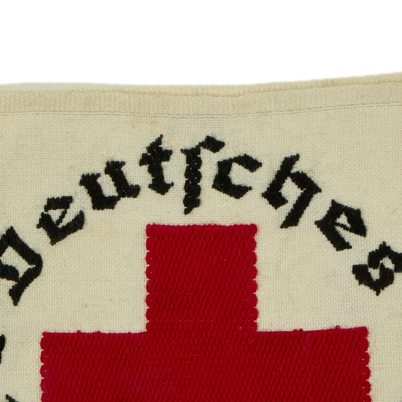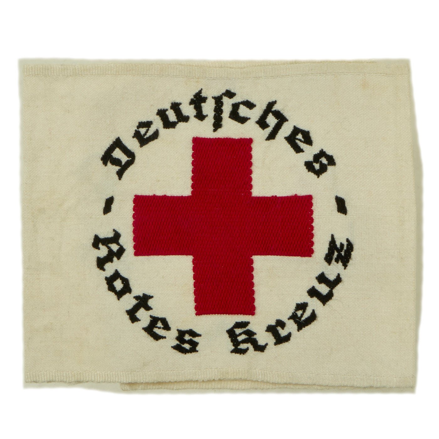 - One Very good condition German WWII DRK Red Cross fabric armband. The armband is the correct white cotton canvas, with a red heavily embroidered red cross and black script that reads; Deutsches Rotes Kreuz (German Red Cross). It measures about 15" x 5", and is sewn not together in the back.