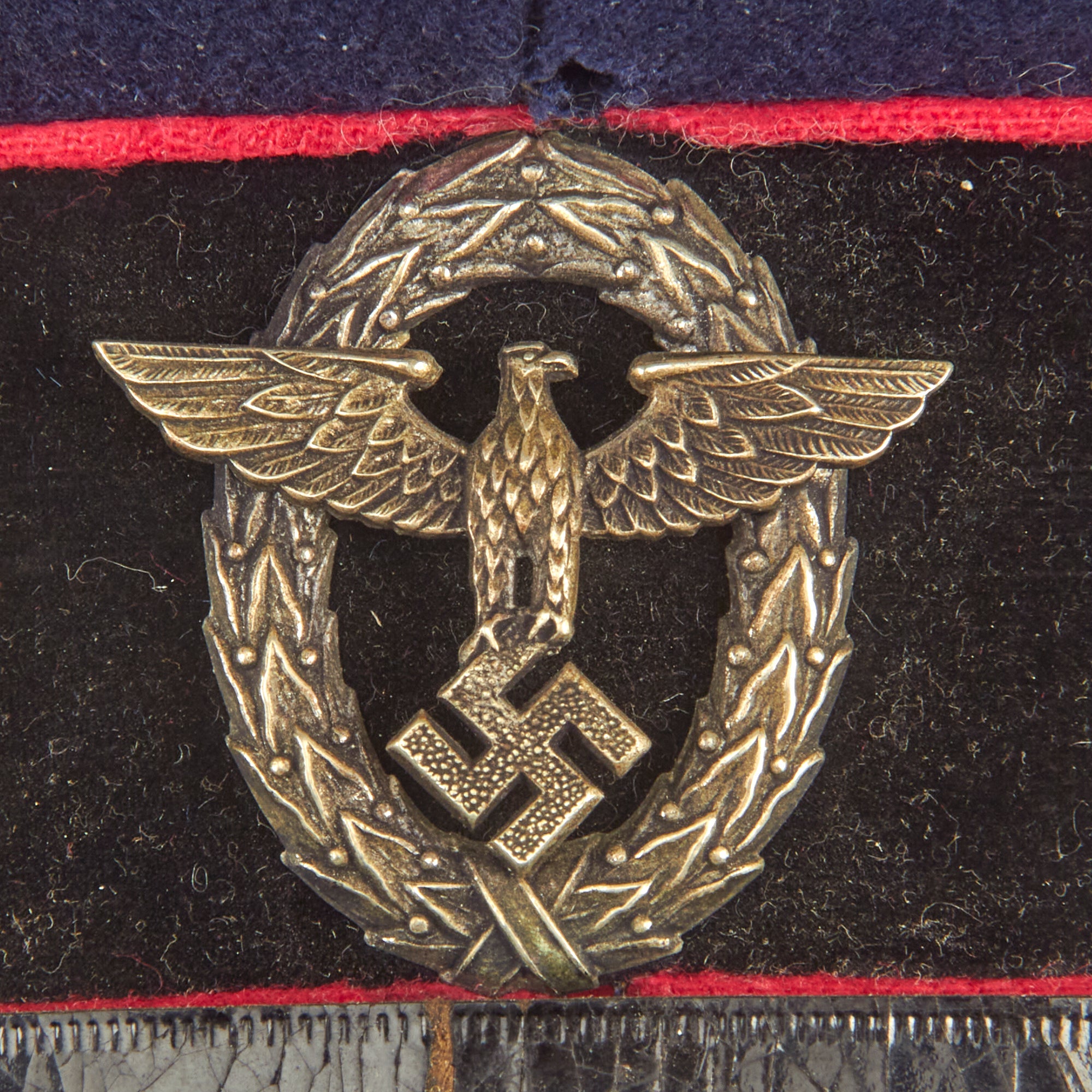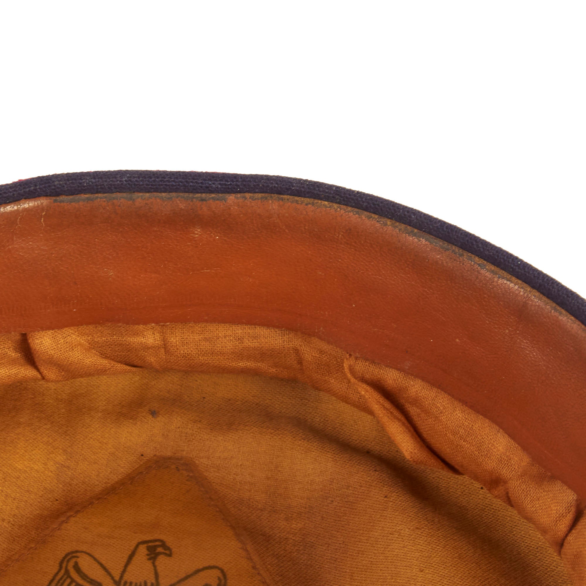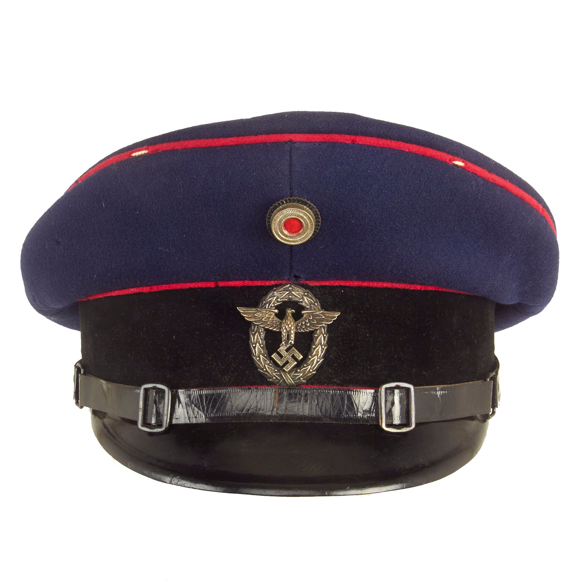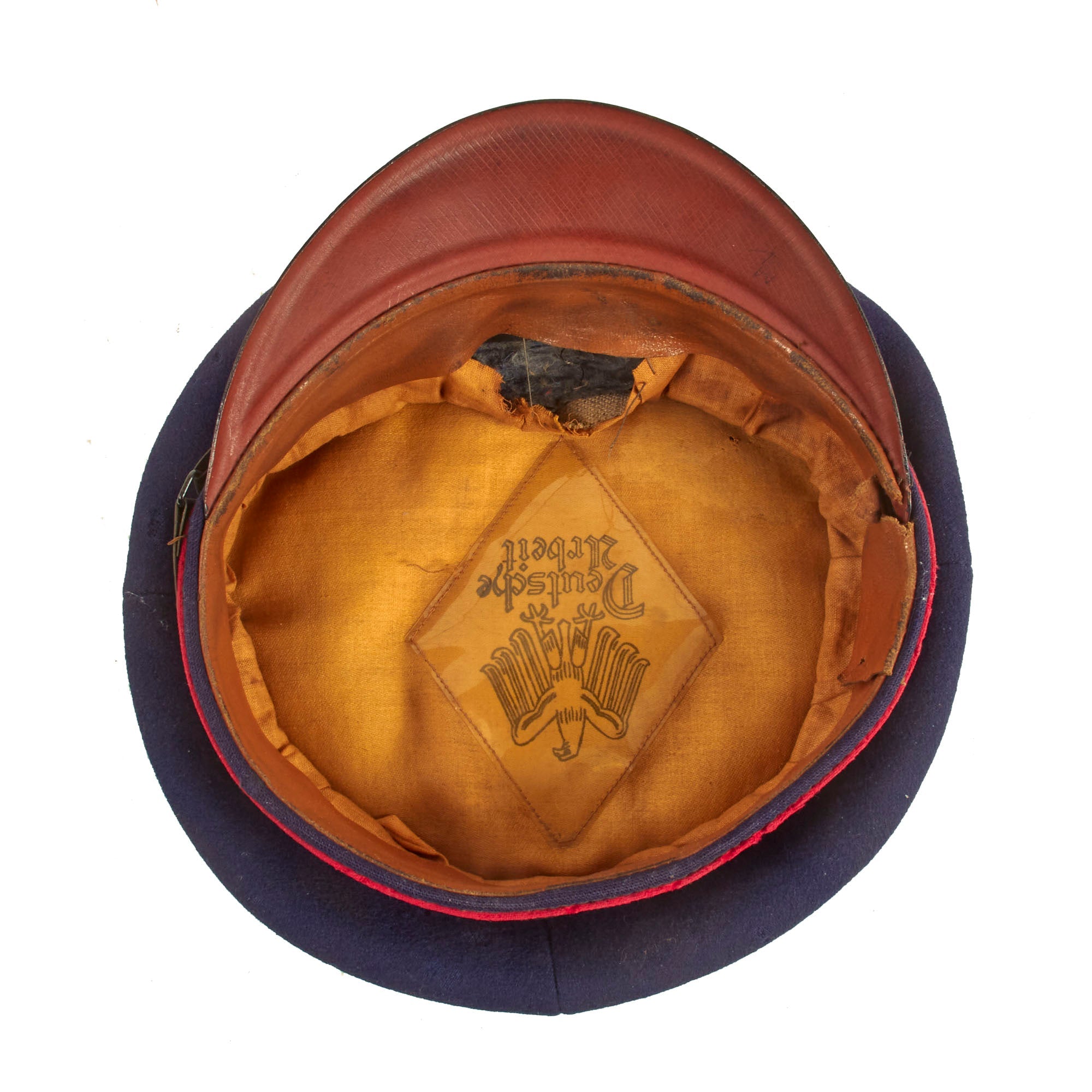 This is a high quality German made cap, which is most likely intended more for an NCO than an enlisted man. It is fabricated from very dark navy blue worsted wool cloth, with wide black velvet cap band, plus two rows of saddle carmine red (karminrot) color piping around the circumference. This is the Protection Police Truppenfarbe (troop color) for the Fire branch. It no longer has a crown stiffener.