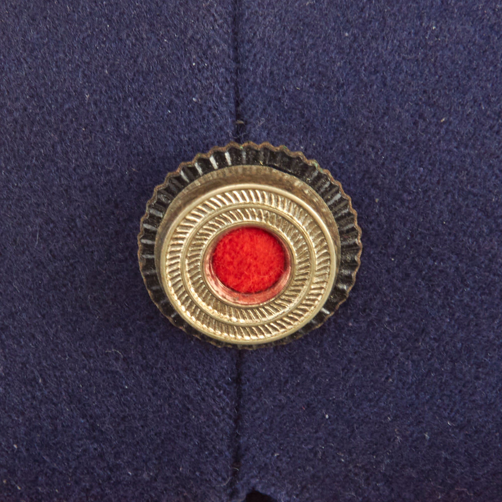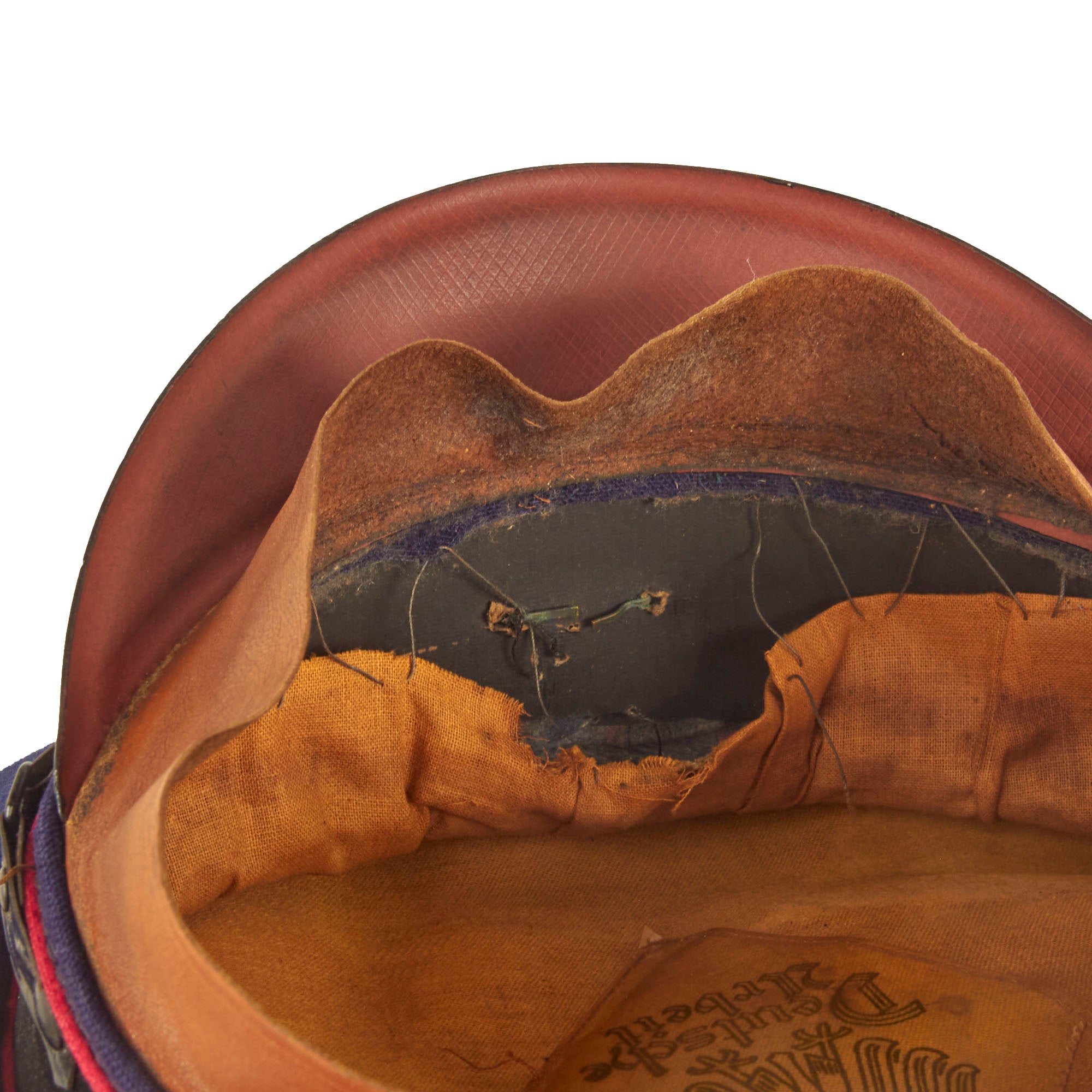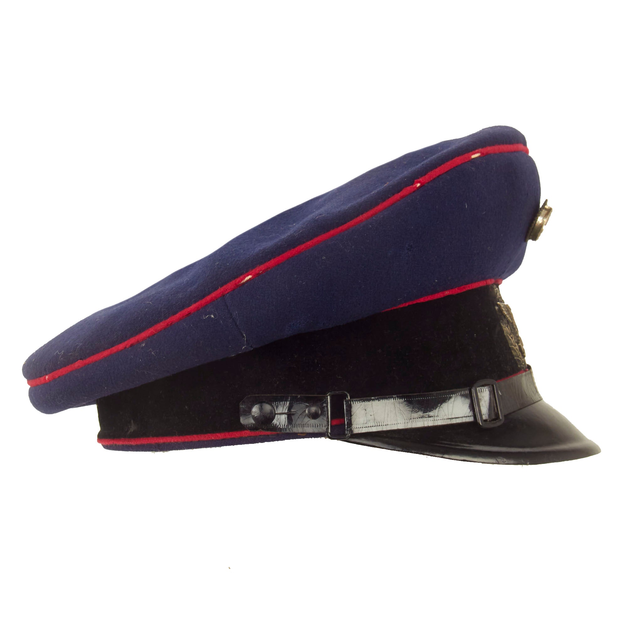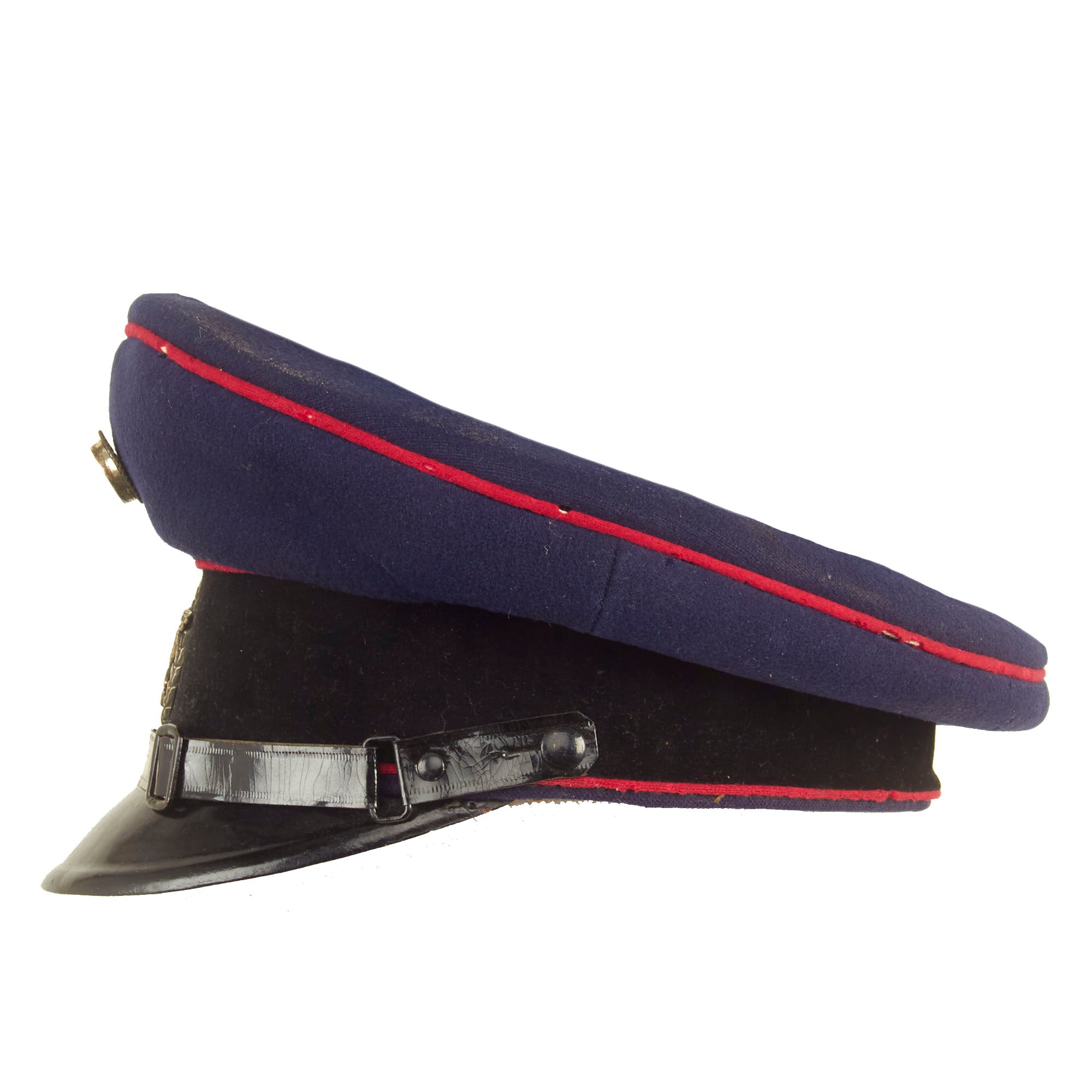 This is a high quality German made cap, which is most likely intended more for an NCO than an enlisted man. It is fabricated from very dark navy blue worsted wool cloth, with wide black velvet cap band, plus two rows of saddle carmine red (karminrot) color piping around the circumference. This is the Protection Police Truppenfarbe (troop color) for the Fire branch. It no longer has a crown stiffener.