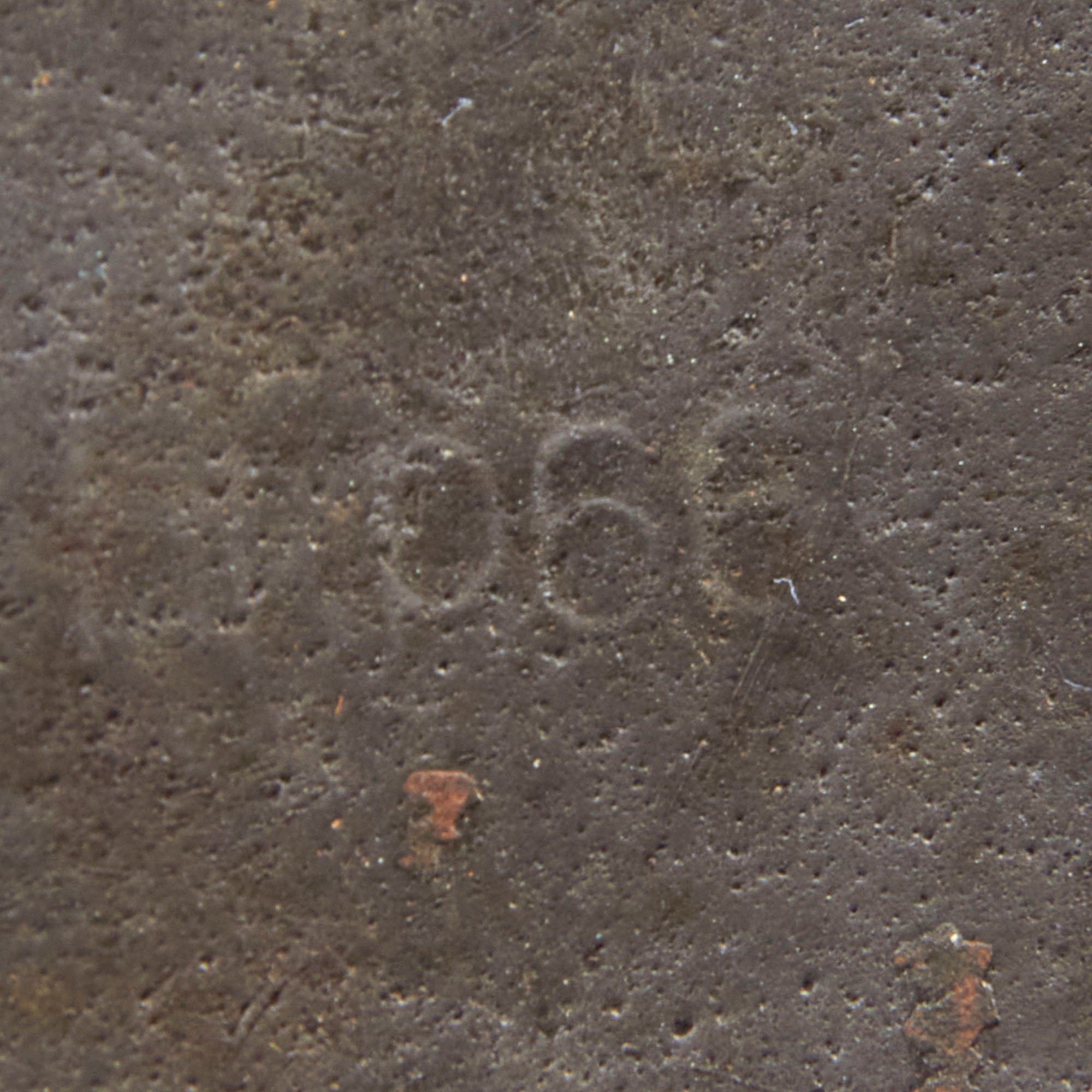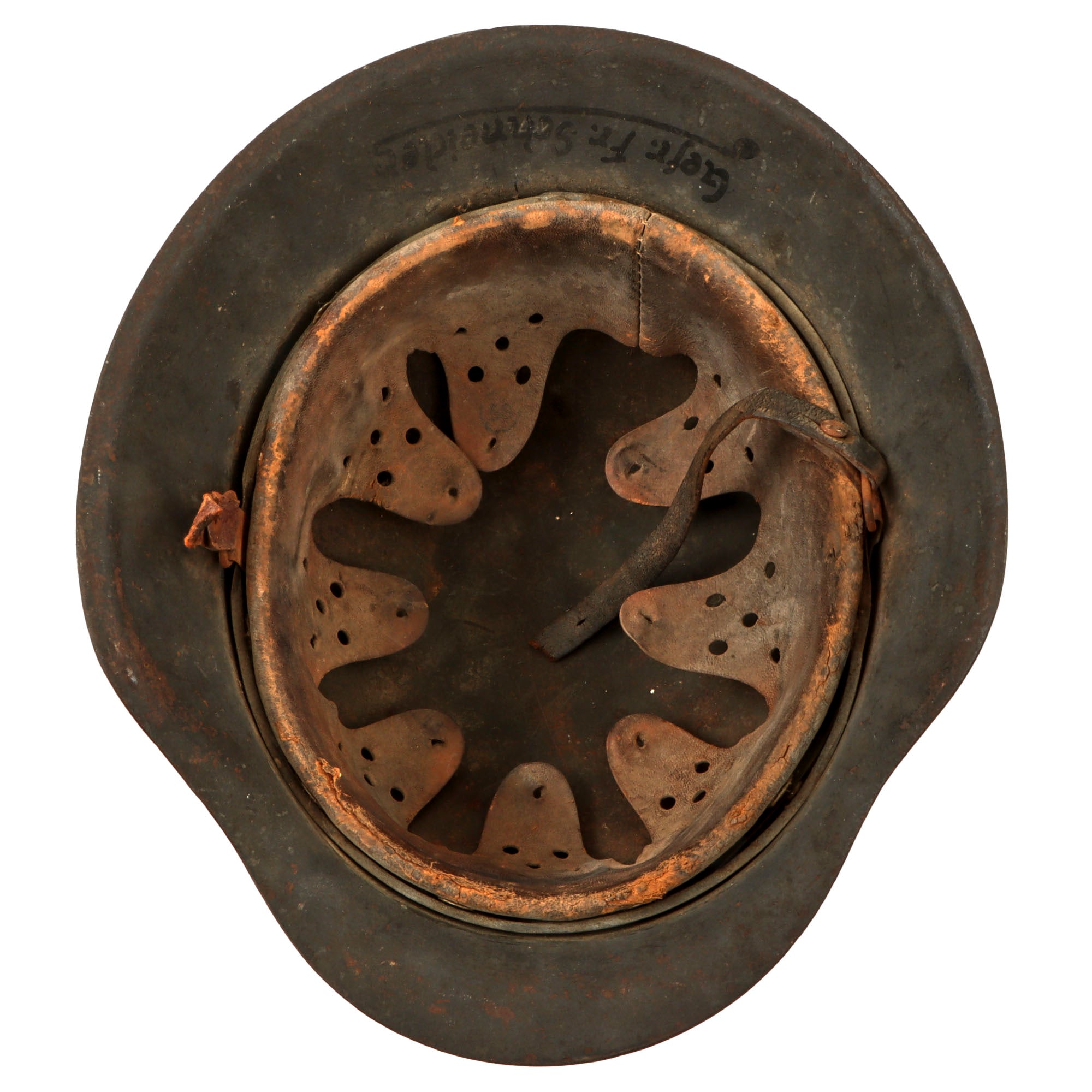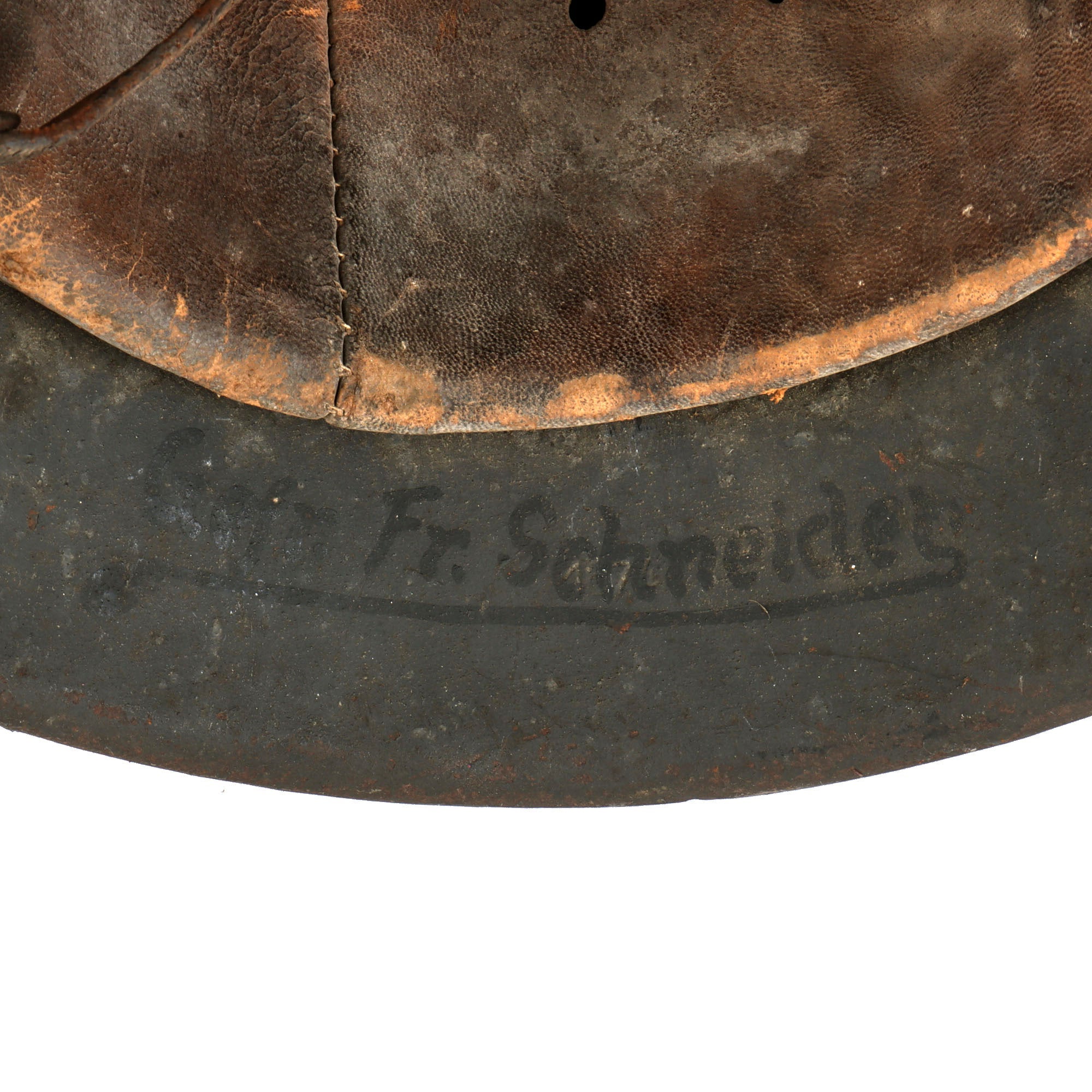 The reverse, interior, neck guard apron is serial number stamped 1674 and the interior, left side, apron has the stamped manufacturer's code and size hkp 66, indicating that Sächsische Emaillier und Stanzwerke A.G. of Lauter, Germany manufactured it. Towards the end of the war, the SE marking was discontinued in favor of the three letter code hkp, and after that both markings were put under the rear skirt to save production time. Size 66 is a nice large size that can accommodate liners from 58cm to 59cm or US 7 1/4 to 7 3/8 . Size 66 shells are much harder to find and are therefore more valuable to a collector. There is also the name Gefr. Fr. Schneider in black paint under the rear skirt over the heat lot, for an enlisted man in the army. The surname "Schneider" is somewhat common, but it still does represent some research potential.