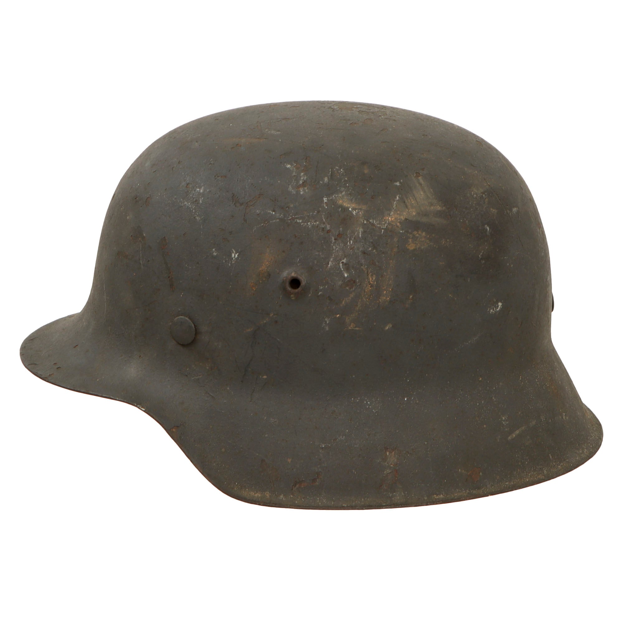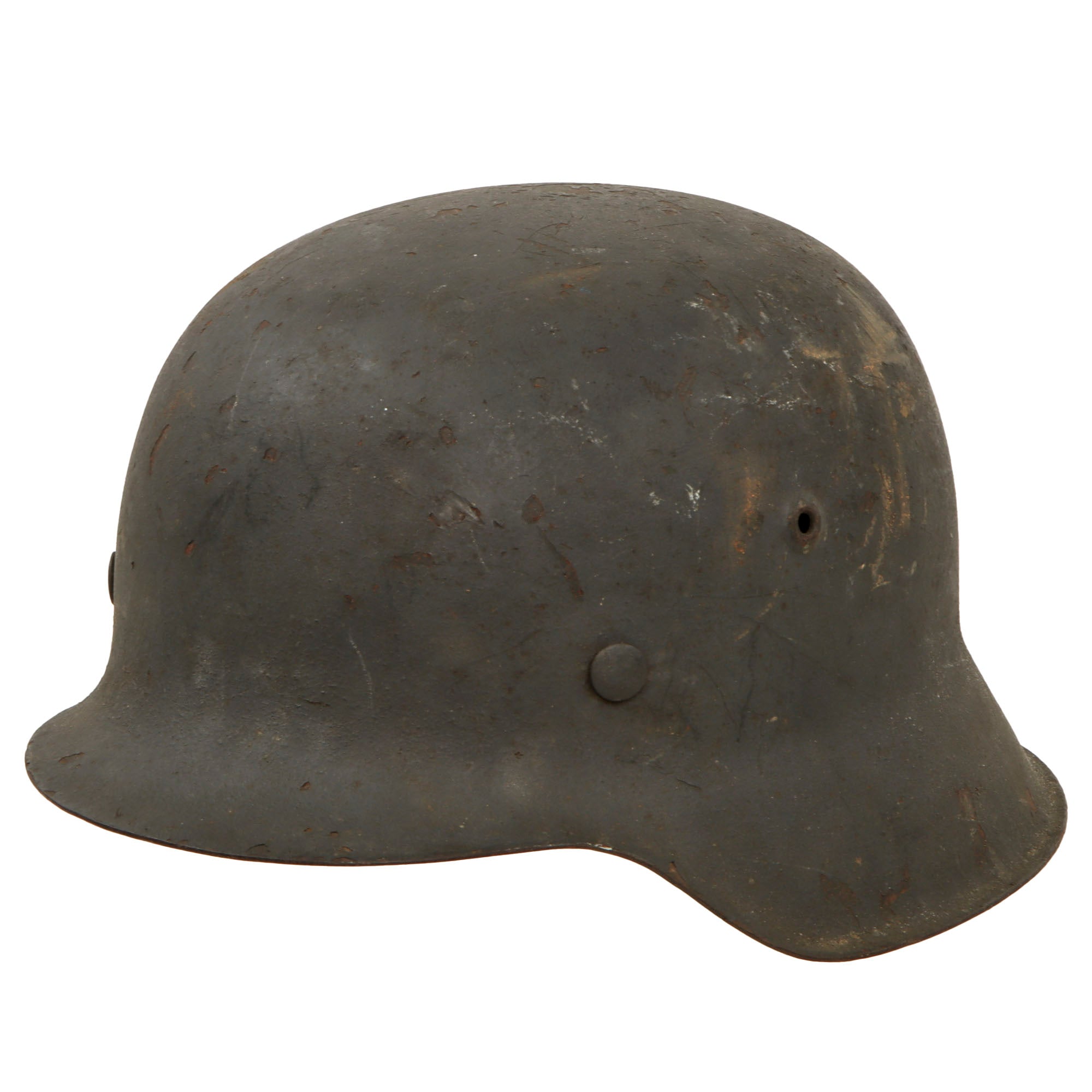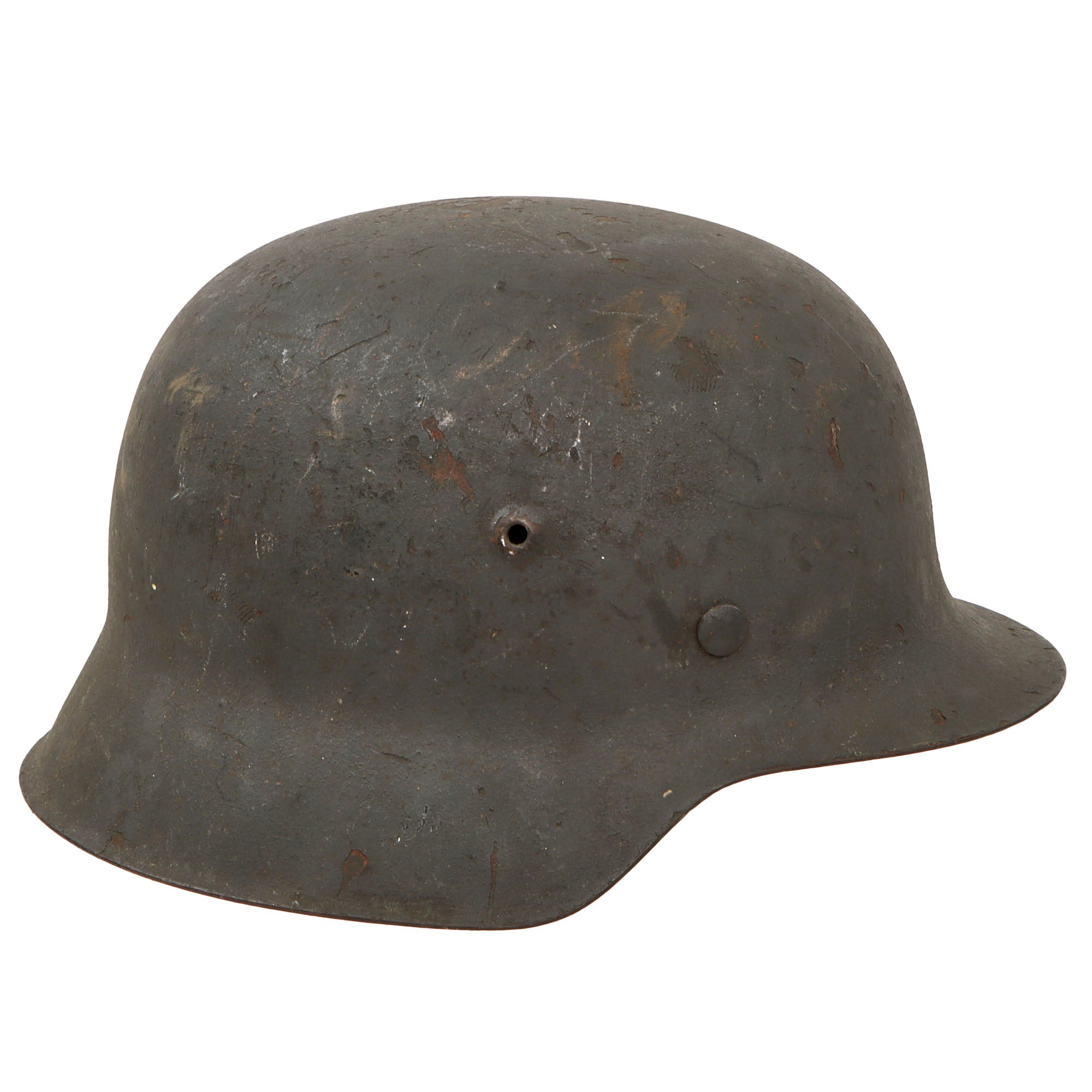 Original Item: Only One Available. This is a very nice all original example of a German Model 42 Steel helmet, as issued to the Wehrmacht Heer (army). This stamped sheet steel construction helmet has a great service used look to the textured later war panzergrau (armor gray) paint on the exterior, showing overall wear and some areas of paint loss and oxidation, giving it a great "been there" look! The interior paint is in the same condition, possibly a little worse due to oxidation inside the dome. There is no decal on this helmet, however later in the war these were often omitted due to rushed production.