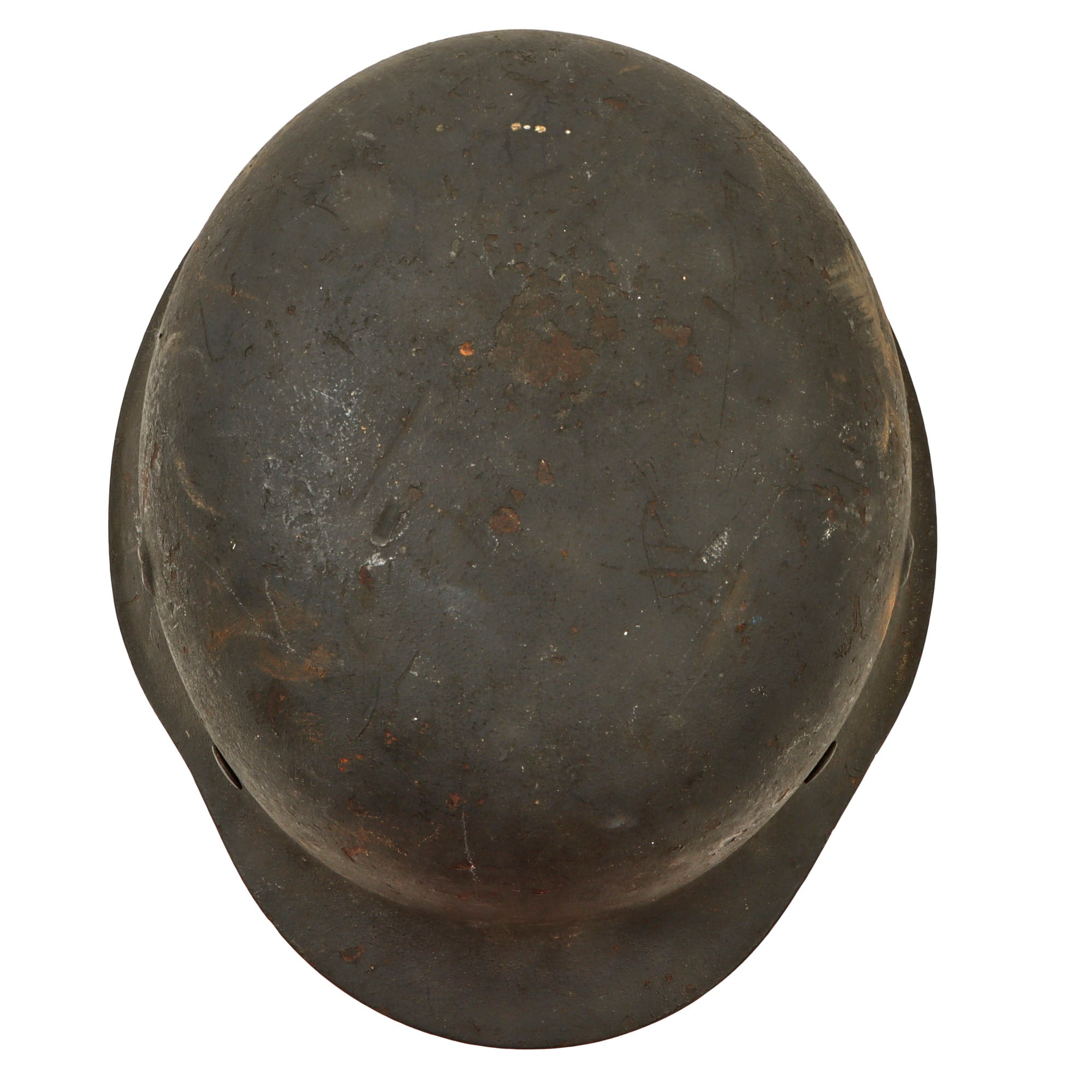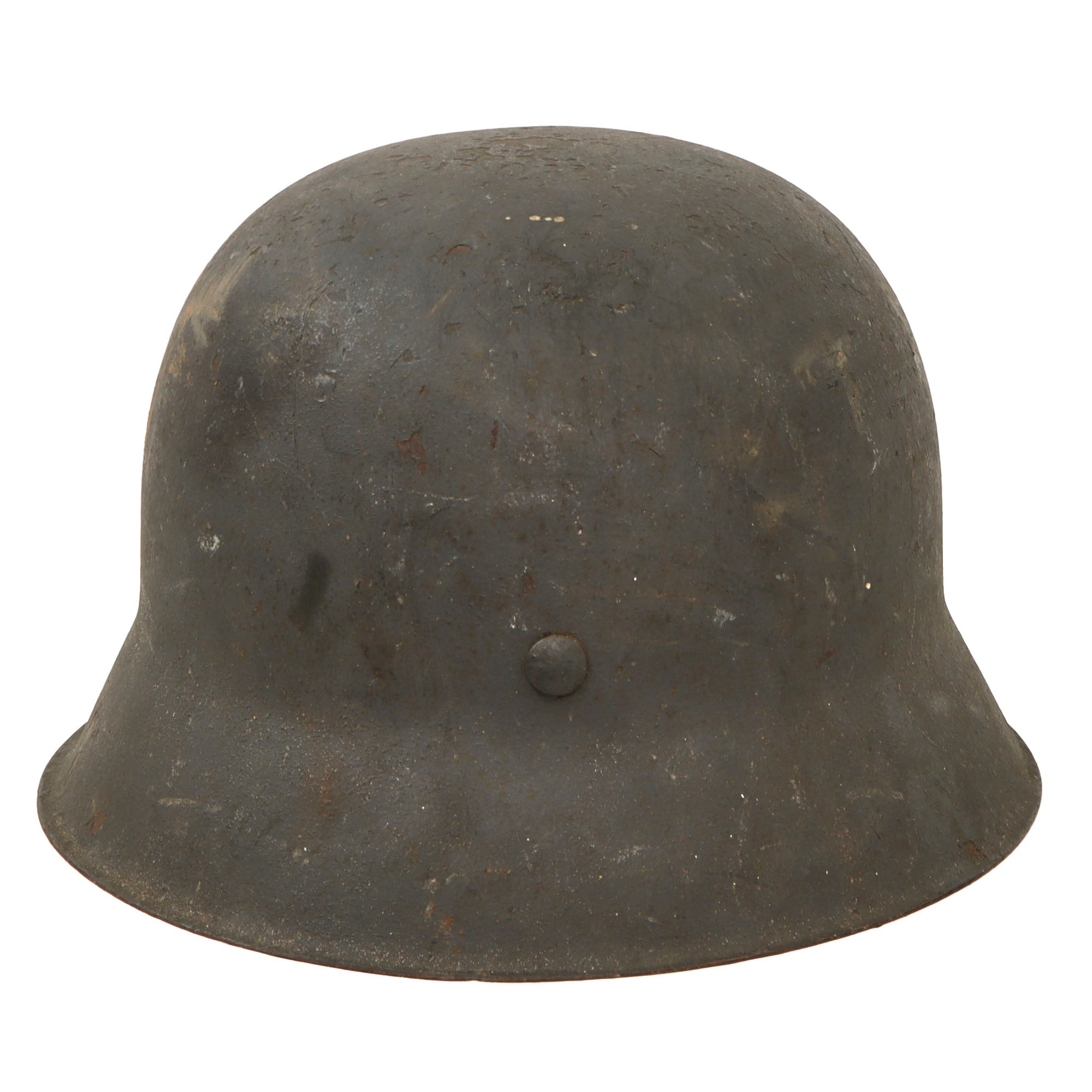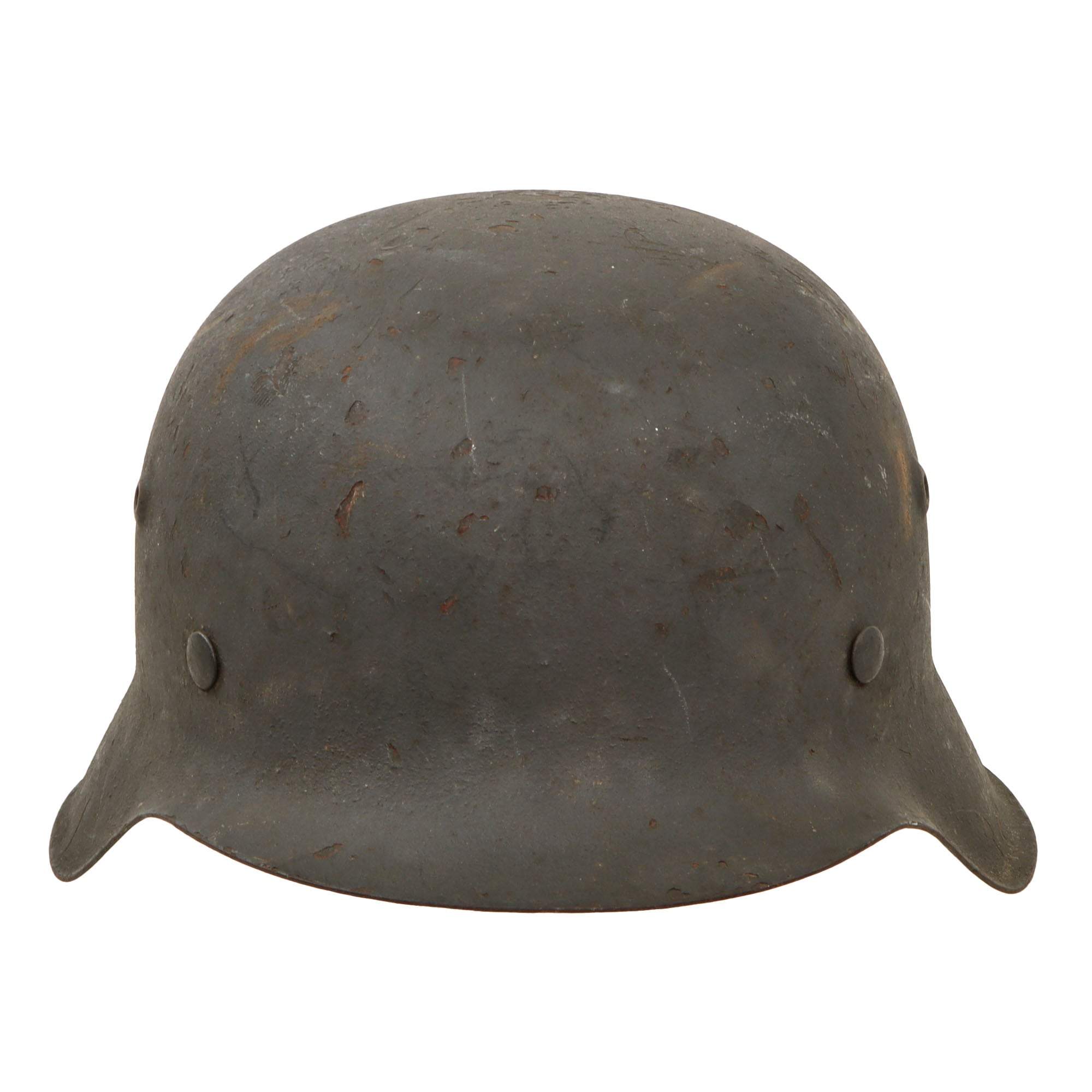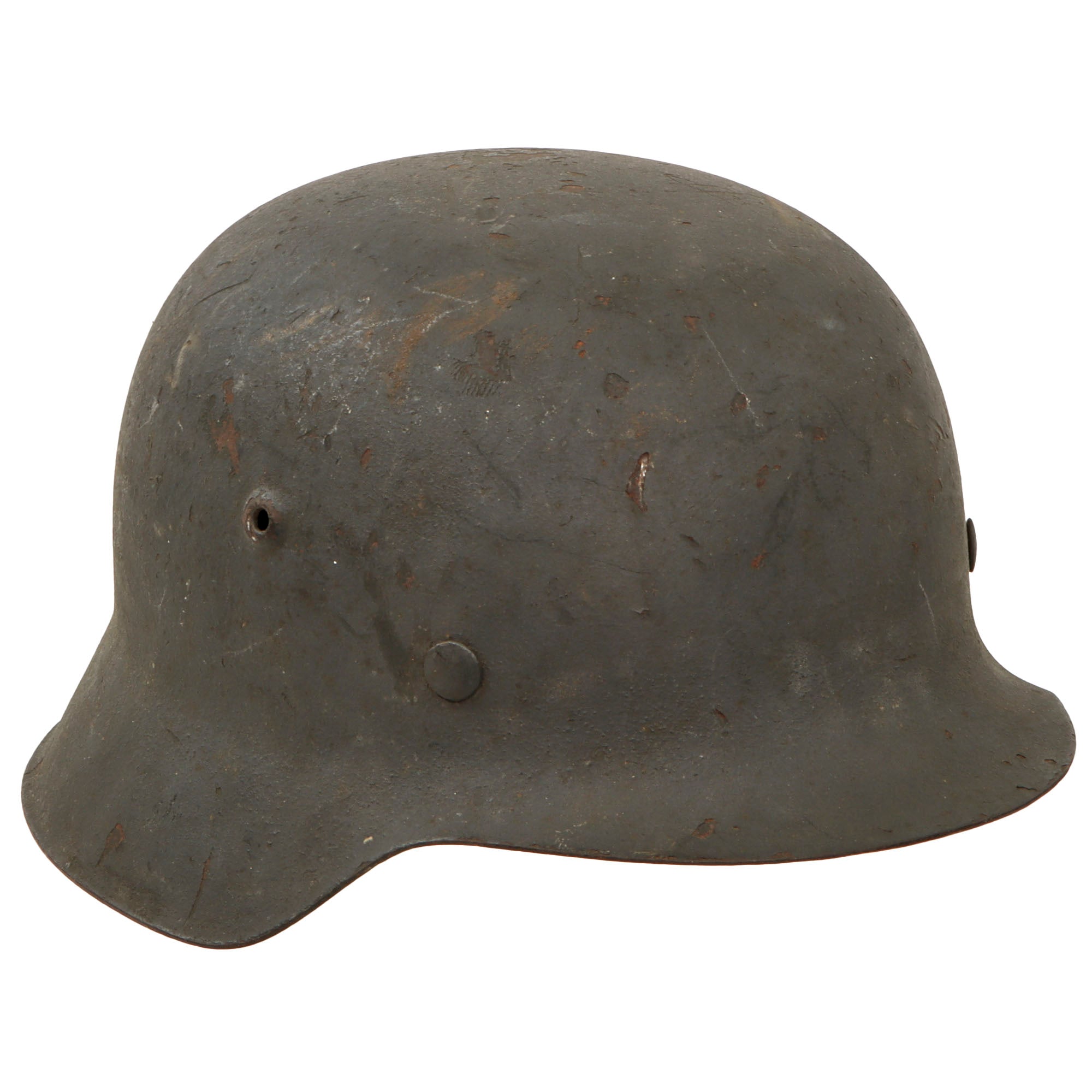 Original Item: Only One Available. This is a very nice all original example of a German Model 42 Steel helmet, as issued to the Wehrmacht Heer (army). This stamped sheet steel construction helmet has a great service used look to the textured later war panzergrau (armor gray) paint on the exterior, showing overall wear and some areas of paint loss and oxidation, giving it a great "been there" look! The interior paint is in the same condition, possibly a little worse due to oxidation inside the dome. There is no decal on this helmet, however later in the war these were often omitted due to rushed production.