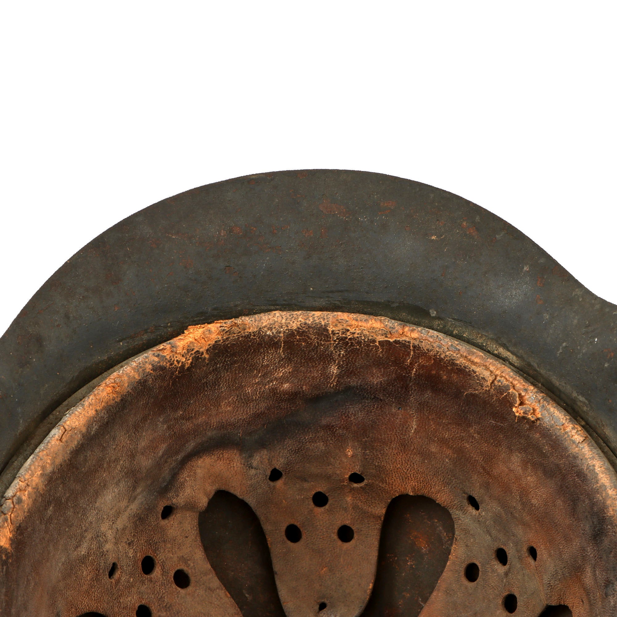 All three liner retaining pins are intact, with the original paint well retained on all, showing just a bit of wear around the edges. The interior of the helmet still has the original M31 leather liner present, with all eight fingers still present, though the top tie is missing. The leather has definitely become stiff and shrunken over the years, and also shows some splitting and dry rot over the rim, though there are not any major tears that we can see. The late war issue galvanized steel liner band is marked on the left outer side with 66 nA / 58, indicating that the liner is a size 58, intended for a 66 shell. The outer left side of the band still has clear maker markings:-