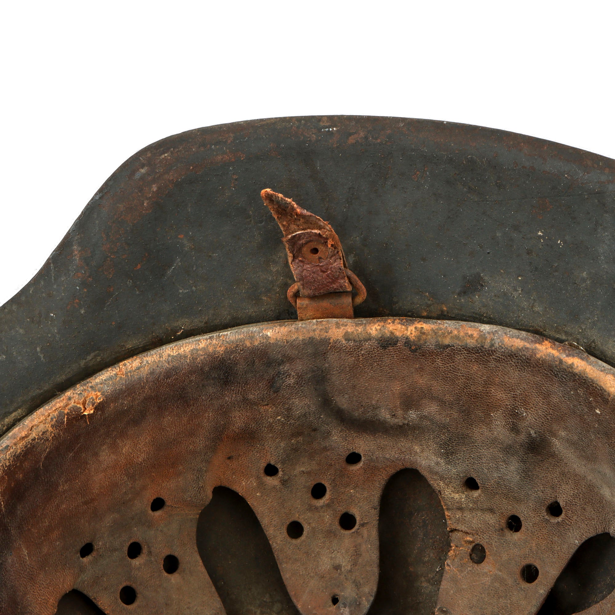 This liner was made by Biedermann & Czarnikow, a German company who moved operations to Łódź in occupied Poland to take advantage of the slave labor in the ghetto located there. NSDAP authorities renamed Łódź to Litzmannstadt in honor of the German General Karl Litzmann who had captured the city in the previous World War. There are parts of a chin strap attached to the liner, however the longer side only has one hole remaining, and the buckle side looks to be an ersatz replacement, and is missing the buckle.