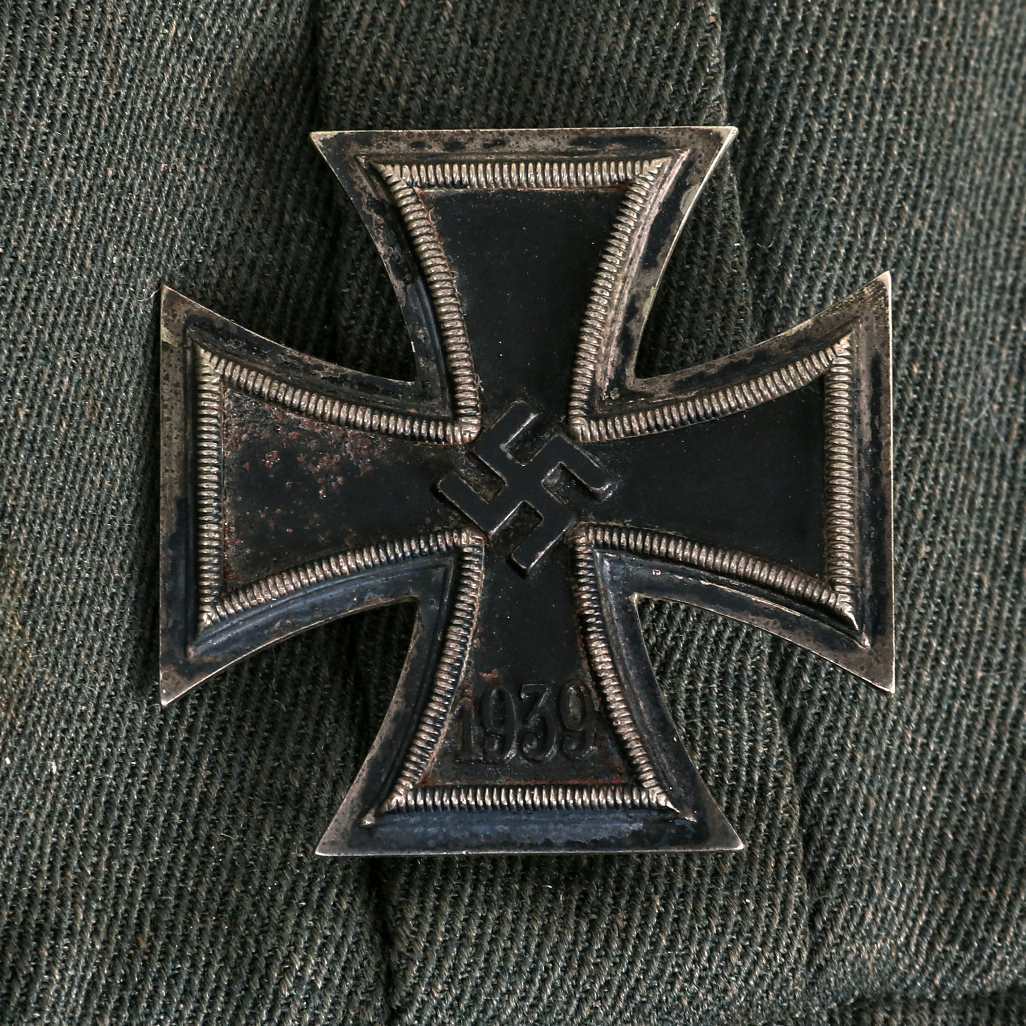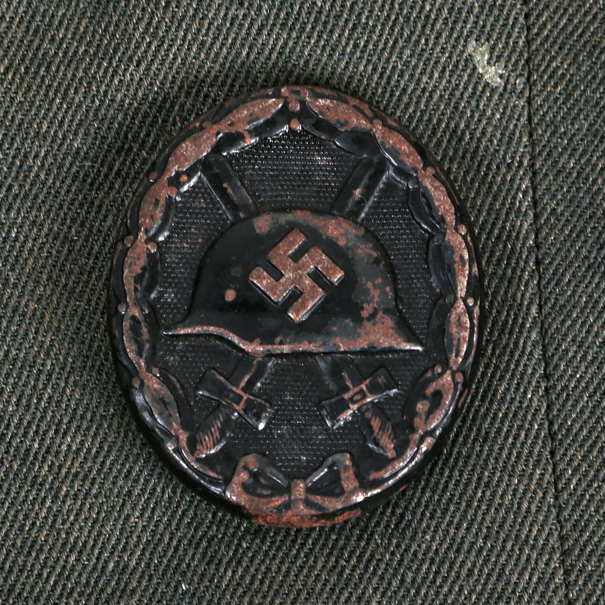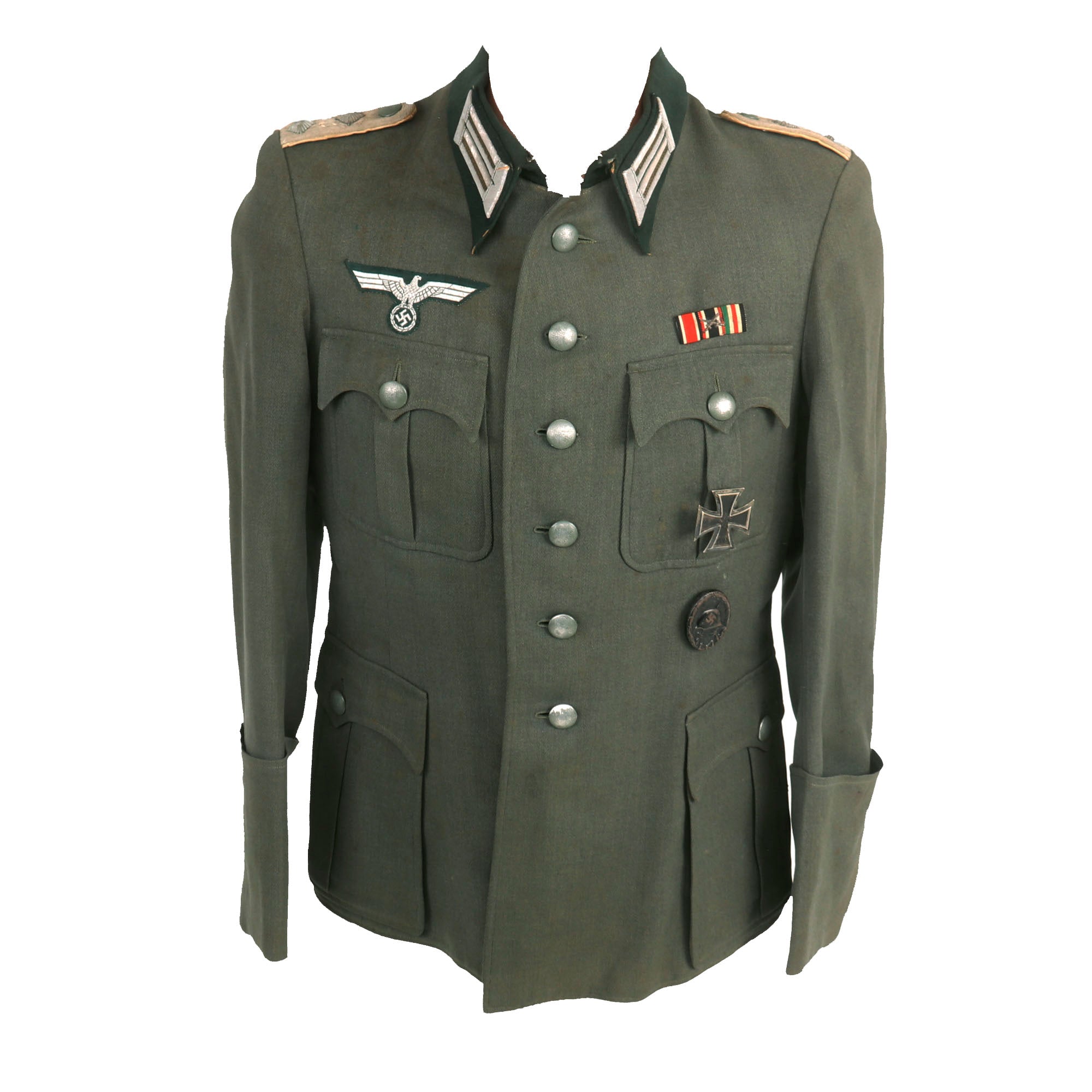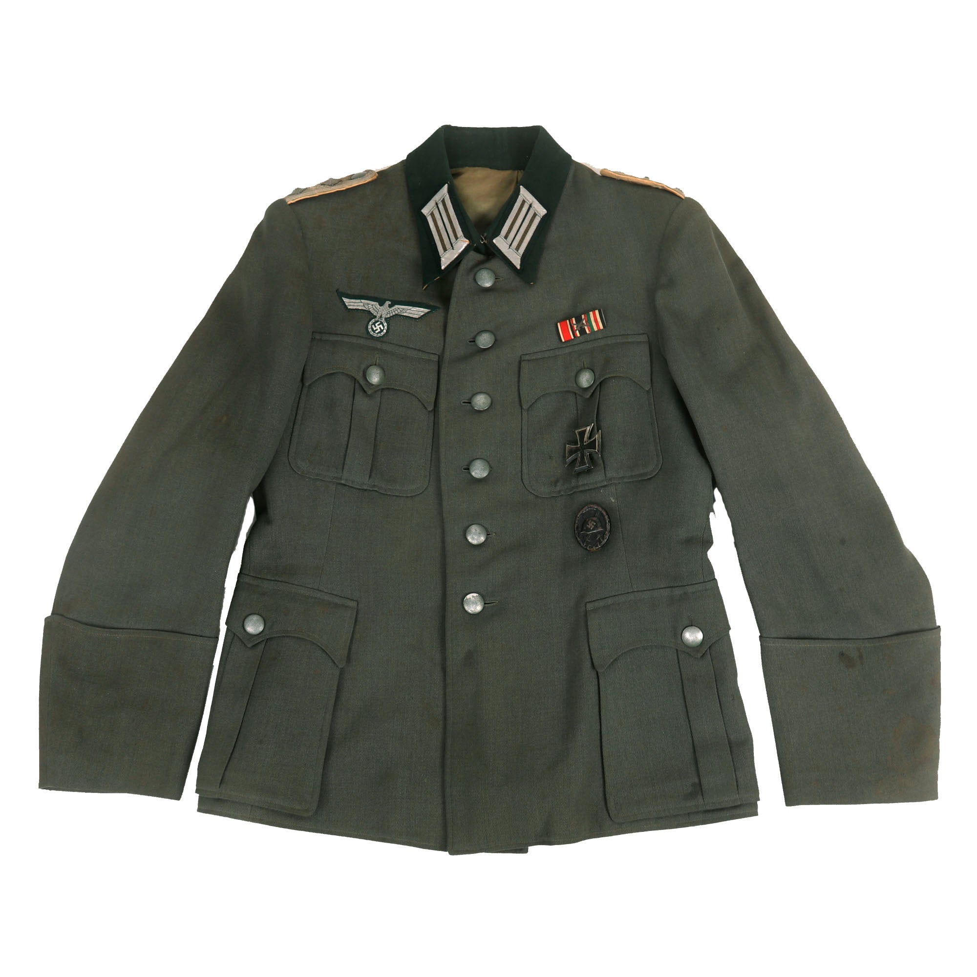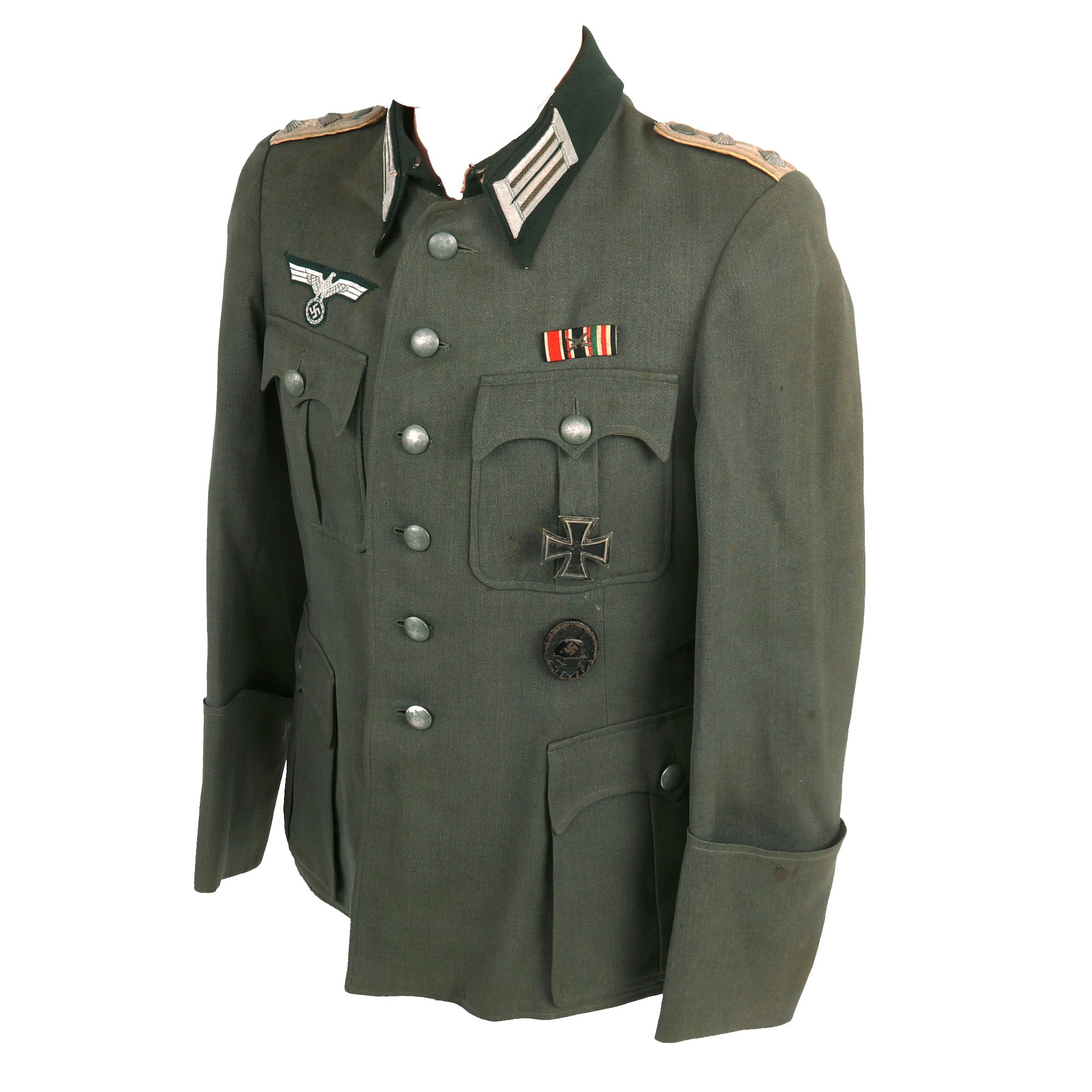 The left chest pocket has two thread loops on it, where there is a very nice patinated Iron Cross First Class 1939 attached, which is completely correct. It is marked on the rear below the pin catch with Präsidialkanzlei des Führers Lieferant (Presidential Chancellery Supplier) number 3, which represents Wilhelm Deumer of Lüdenscheid. a very desirable maker. Below this is a hollow back steel WWII Wound badge 3rd class in black, for one wound during service. There is also a medal ribbon bar above the pocket, which indicates that he received the following awards: WWII Iron Cross 1939 2nd Class EKII, German WWII War Merit Cross 2nd Class KVKII with Swords (for front line combat), and what looks to be the WWII German and Italian African Campaign Medal, but it is upside down / reversed.