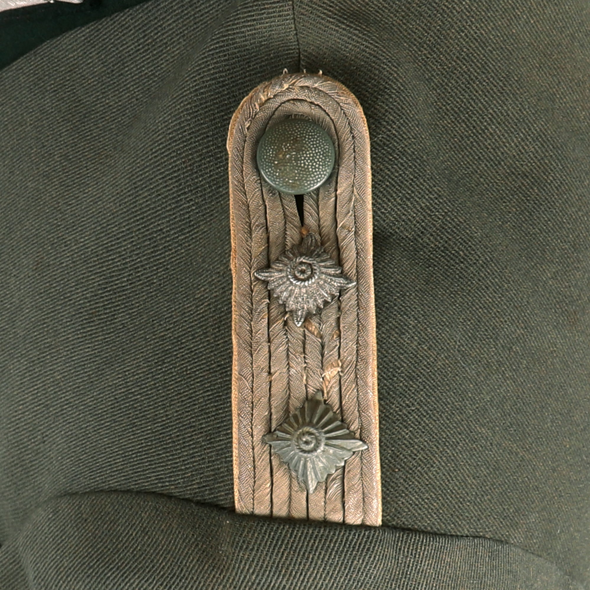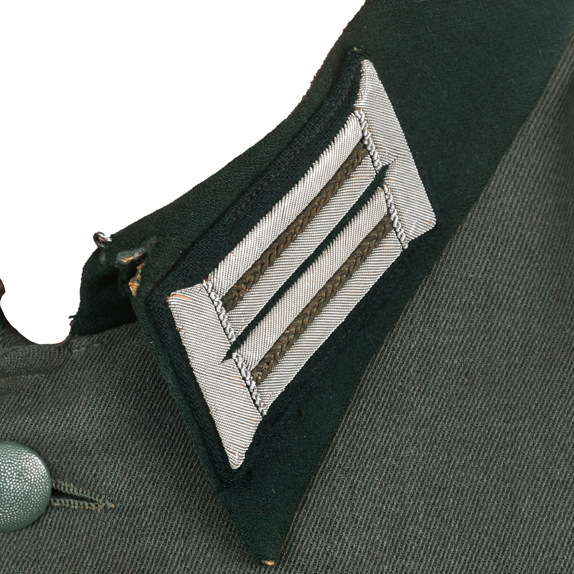 The colored stripes on the litzen are oxidized Weiß (white) Silver Bullion, the Waffenfarbe (Corps Color) during WWII for Infanterie (Infantry) and Motorisiert Infanterie (Motorized Infantry). The collar is in good shape, tough there is wear and some holes around the top edge, which is usually one of the first places to show damage from use. The collar stiffener has also cracked through around the top, and has been repaired. The “sew-in” style company grade officers schulterklappen (shoulder boards) of this tunic are constructed with two rows of fine silver flatware "Russia Braid" double piping and have the correct white piping around the edges. There are two rank "pips" installed, indicating the rank of Hauptmann, equivalent to a U.S. Army Captain.