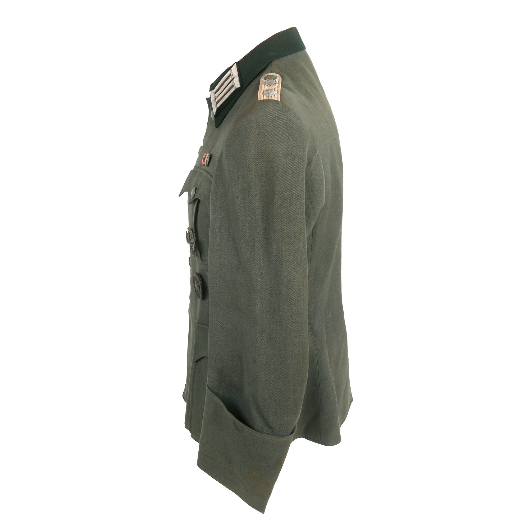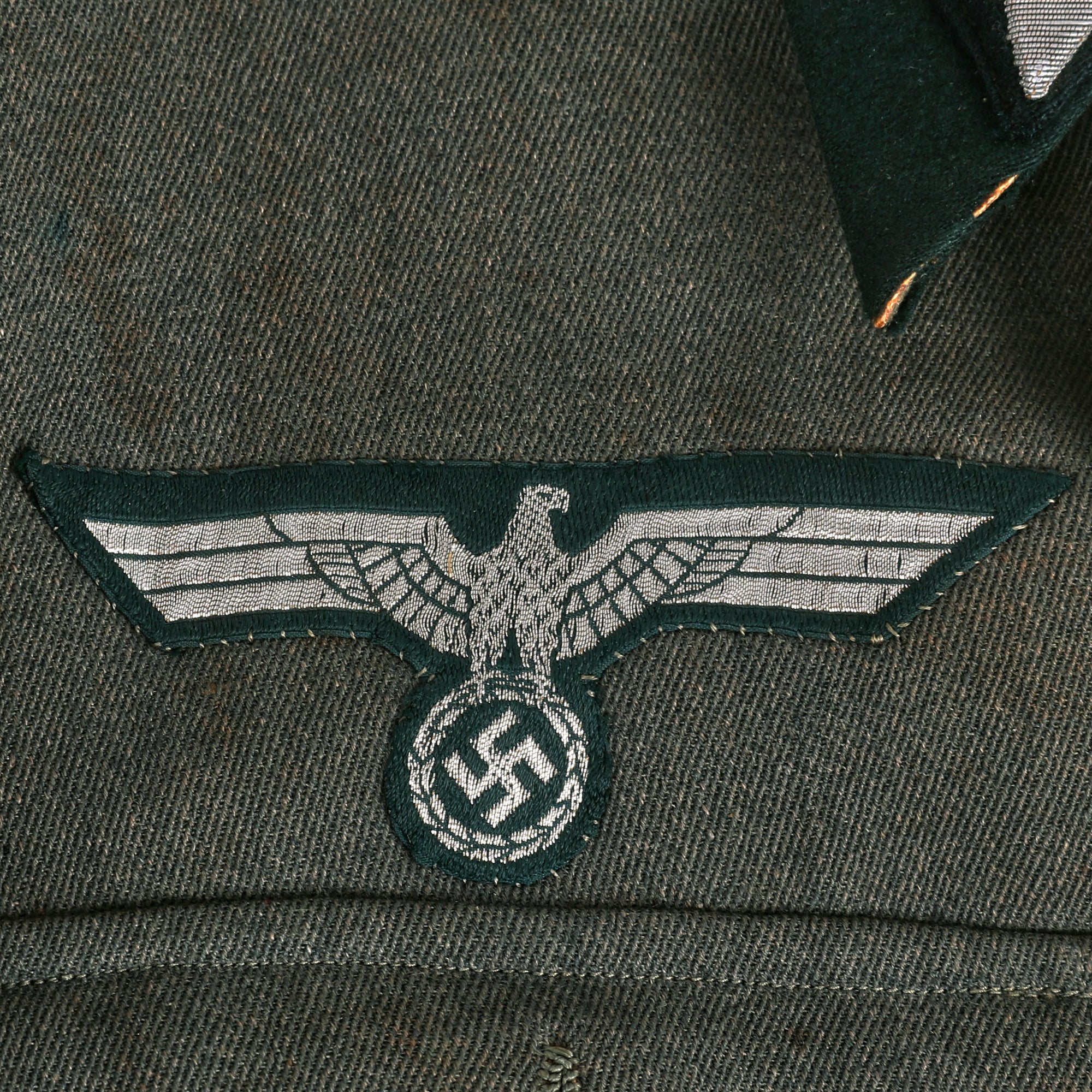 It is adorned with the usual rank and branch insignia used on German tunics. The attractive Army breast eagle is the correct officer's silver bullion BeVo embroidered type on a green background, and is stitched to the outer layer of fabric only. There is just a bit of fraying on the eagle due to wear. The collar is wrapped in flaschengrün (dark bottle-green) wool, and has officer's field litzen collar patches on each side, which are woven from silver bullion thread with a dark bottle green background matching the collar. It is in good shape, tough there is wear and some holes around the top edge, which is usually one of the first places to show damage from use. The collar stiffener has also cracked through around the top, and has been repaired.