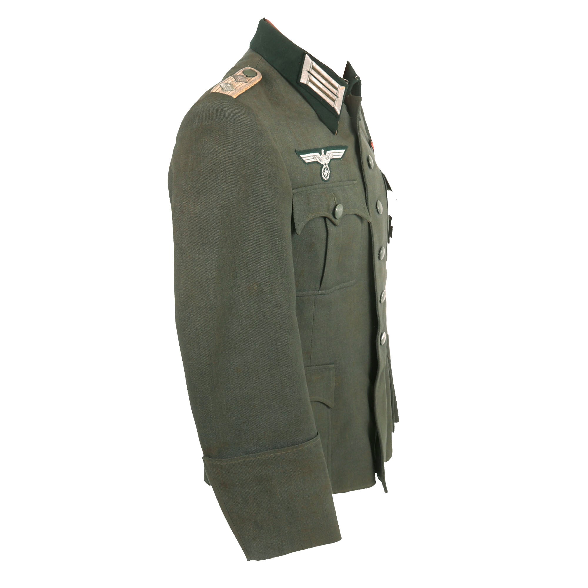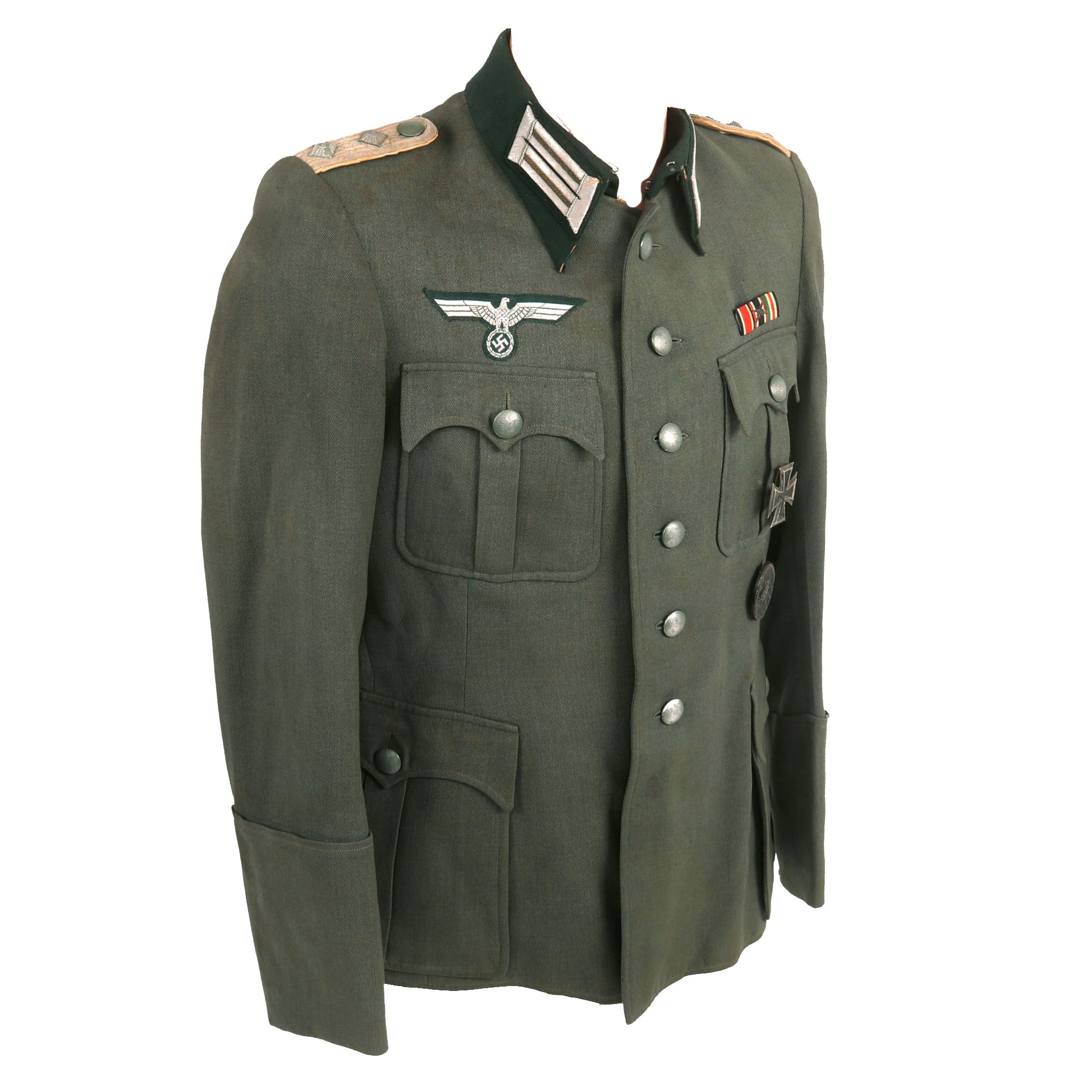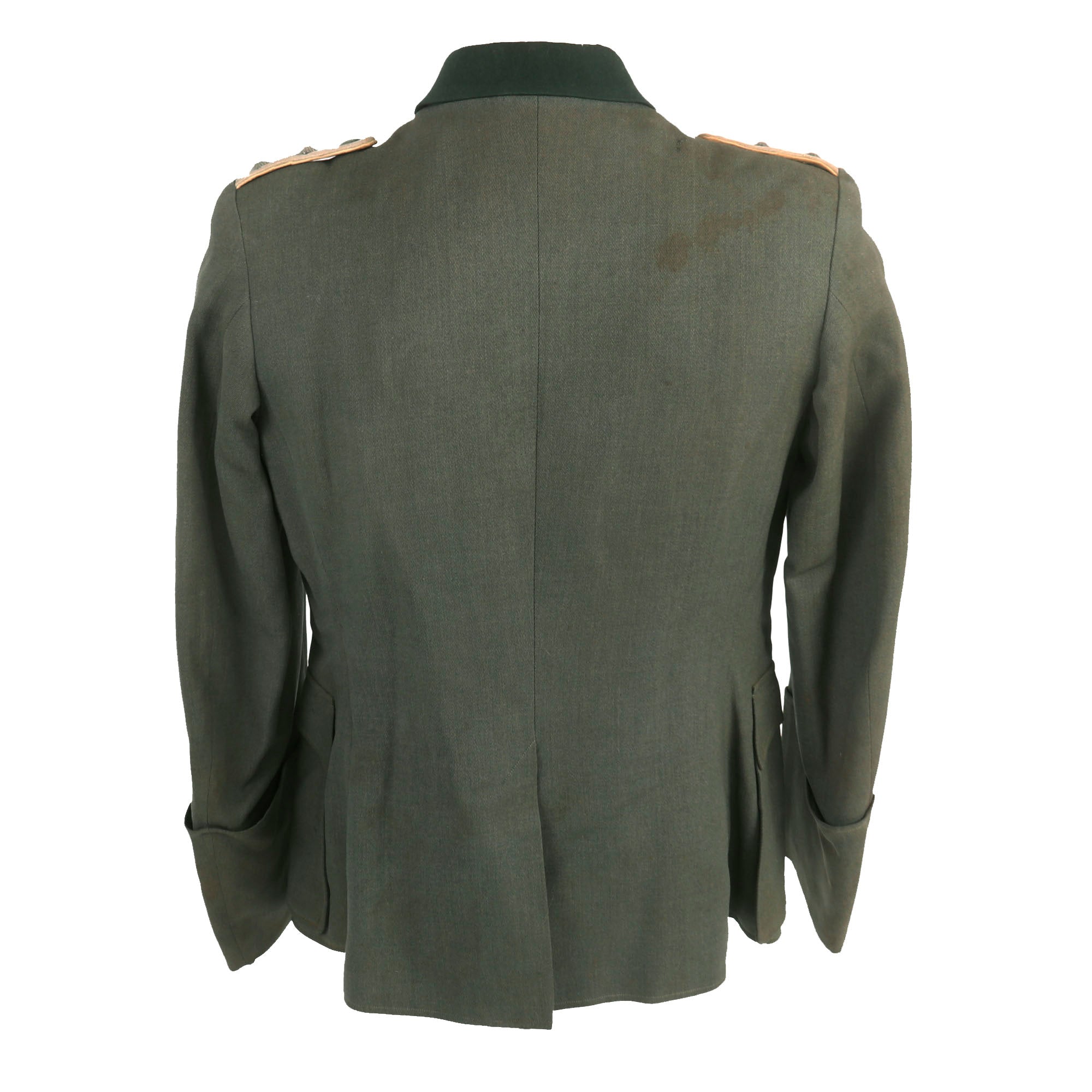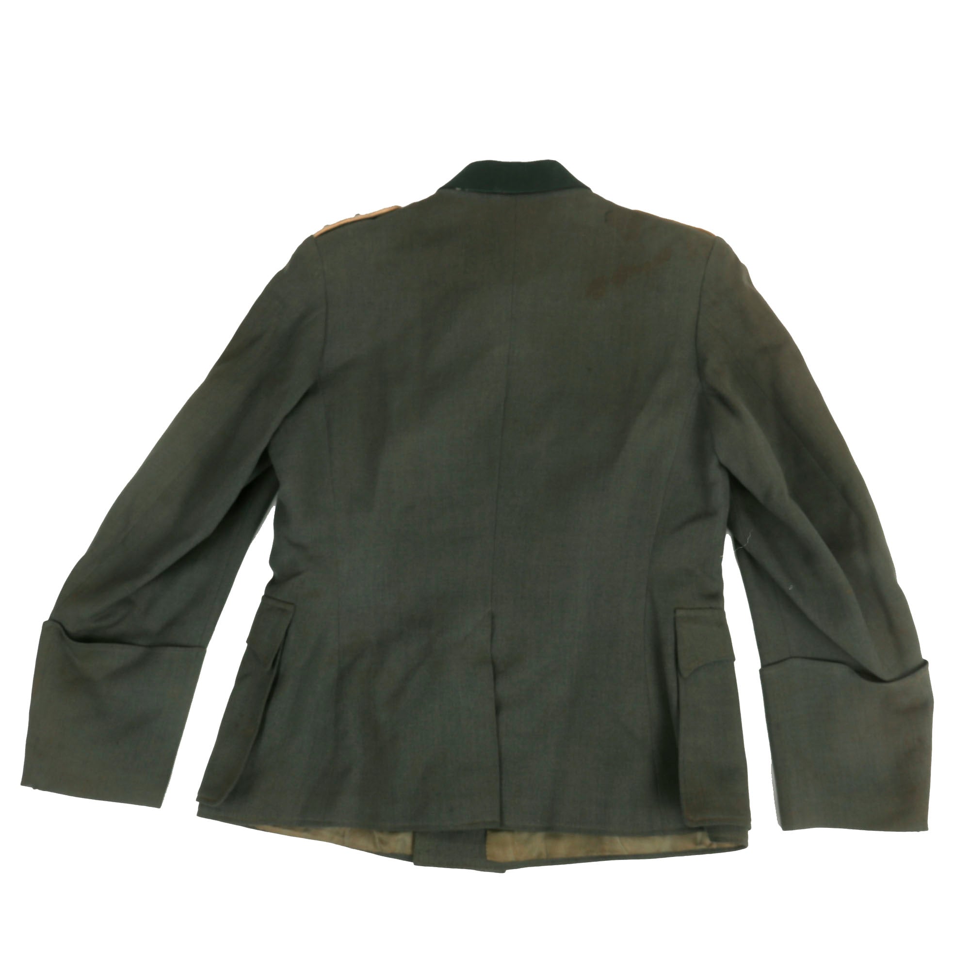 Overall condition is very good, showing wear and staining consistent with moderate service. We cannot see any major mothing or other issues with the uniform, just a few nips around the collar insignia and some scattered small holes and tears to the exterior. The litzen and shoulder boards also show some light wear. This is a uniform tunic that that saw moderate service during the war, and overall it displays very nicely.