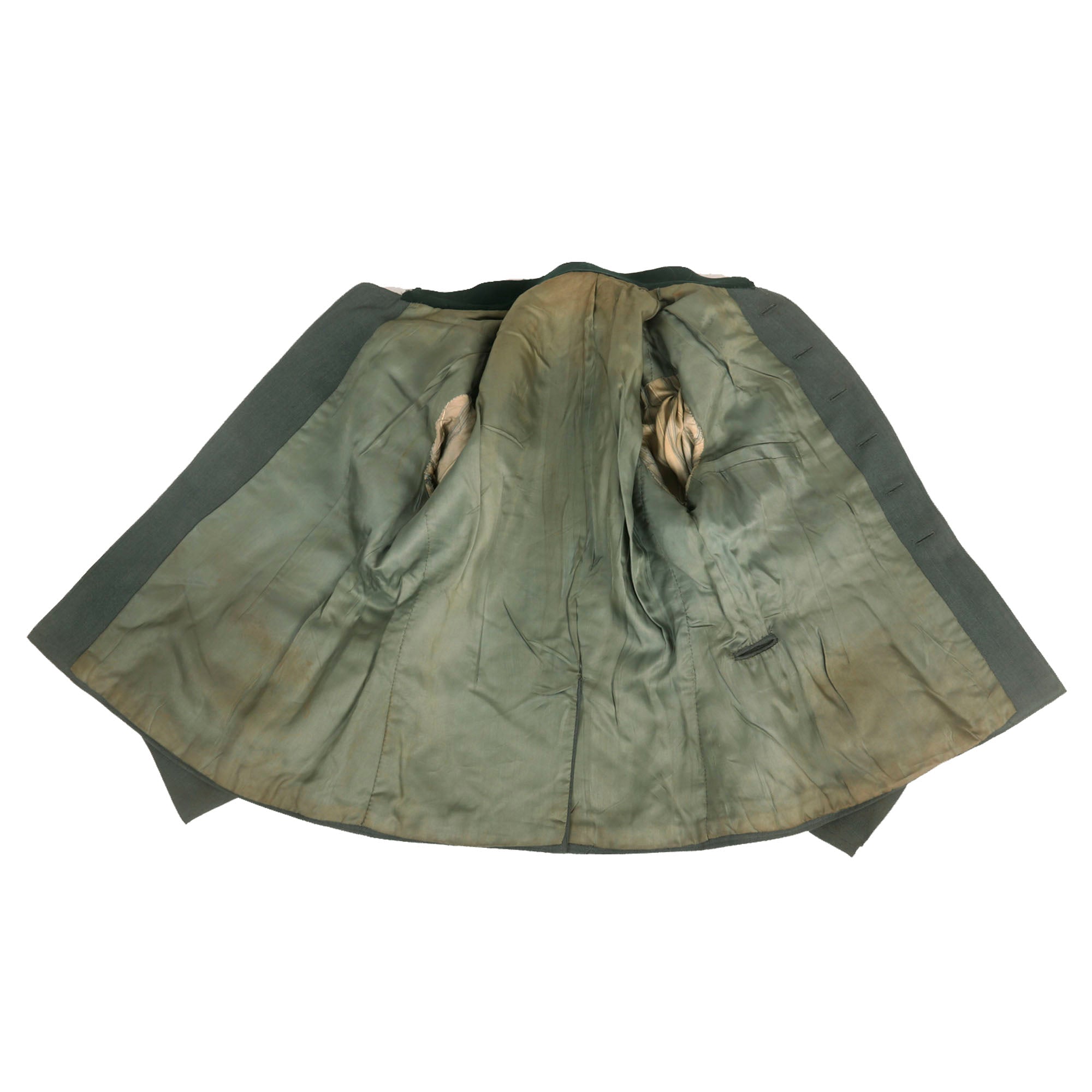 The interior is lined with with a lovely olive / gray colored rayon cotton blend, while the sleeves are lined with blue striped white rayon. There are some pulled seams near the collar as well as staining to the interior, but we do not see any major tears or repairs. There is definitely wear to the interior, with light fraying present, as well as staining in areas. There is also a large eyelet that connects to the exterior under the left waist pocket for the dagger to hang through.