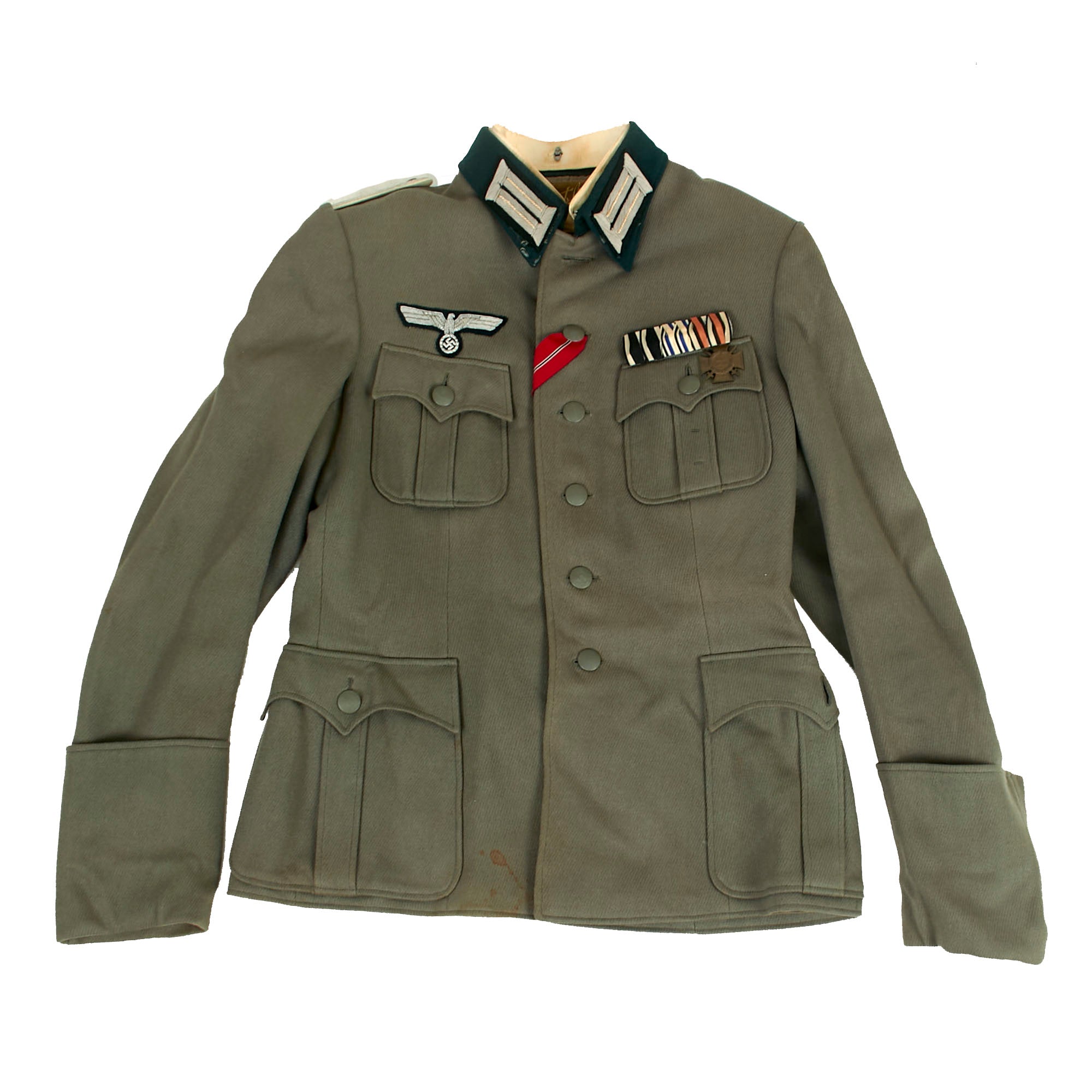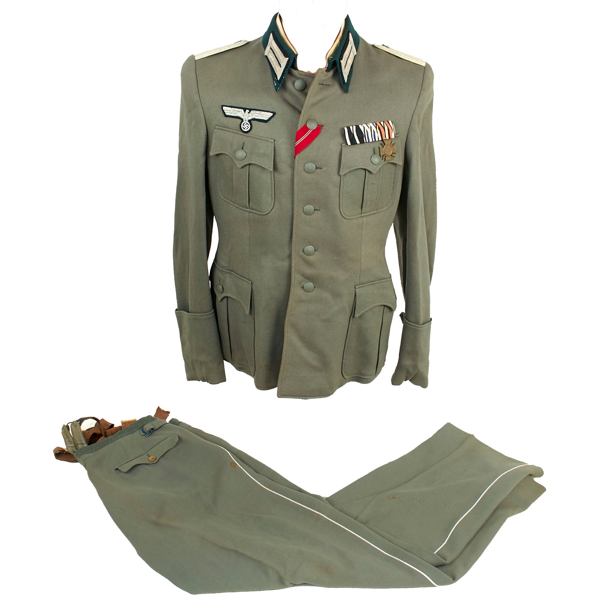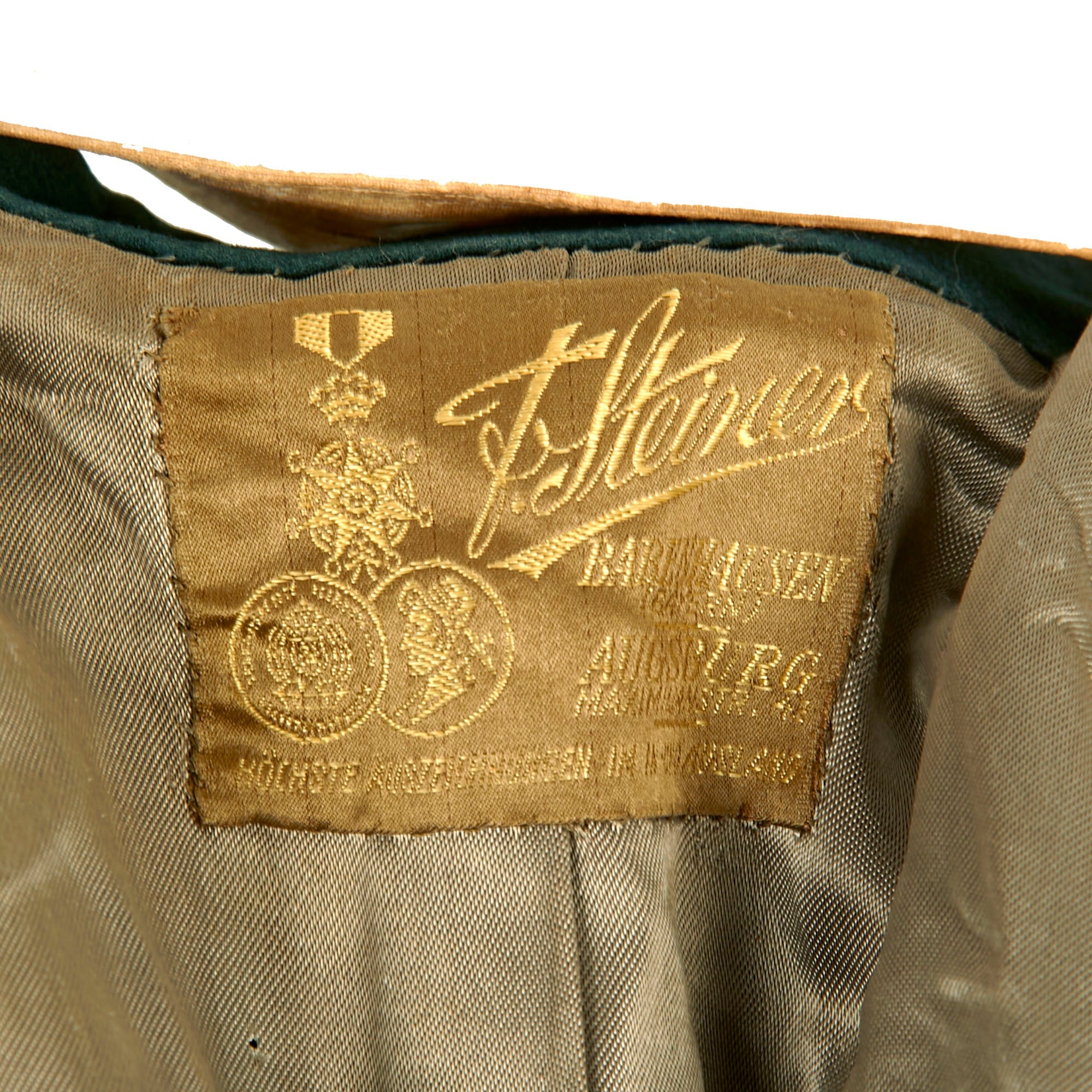 Original Items: Only One Set Available. This is a very nice German WWII Heer Army Infantry Leutnant Officer's M-36 Tunic, complete with the correct trousers as well as some great awards. The trousers even retain their suspenders. The set shows moderate wear from service and in very good display condition. Unlike many uniform sets that we see, this tunic still has an intact tailor label under the collar, with another label on the inside of the inner left chest pocket and a third on the outside! It was made by F. Steiner of Augsburg, Bavaria, and likely marketed and fitted by Wilhelm Bischof of Augsburg. There is also a circular tailor’s patch on the outside of the pocket which translates to Quality mark of the men's tailoring trade. The Bischof tag has a name and rank, appearing to read as Leutnant Mensinger, with a date of July 1943.