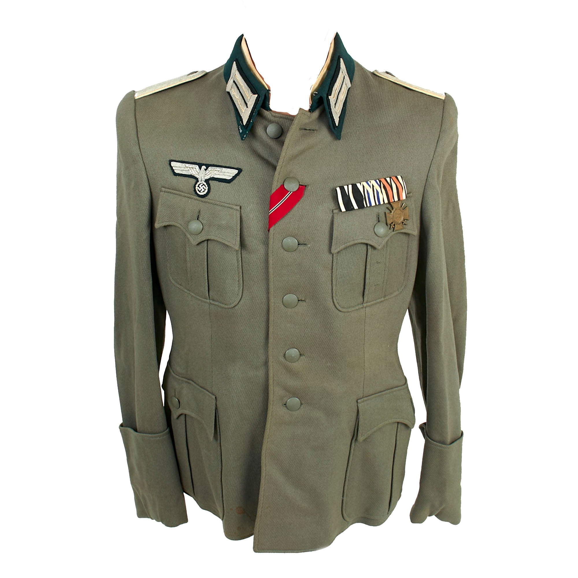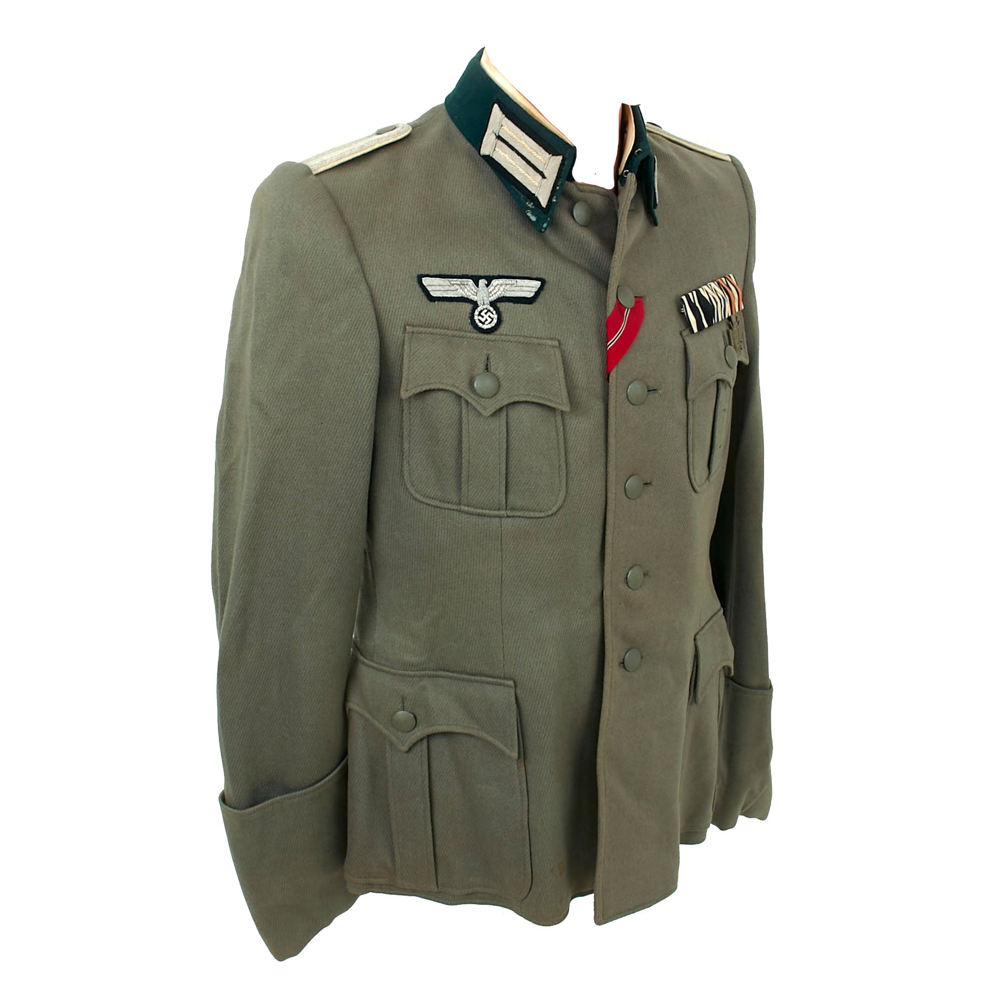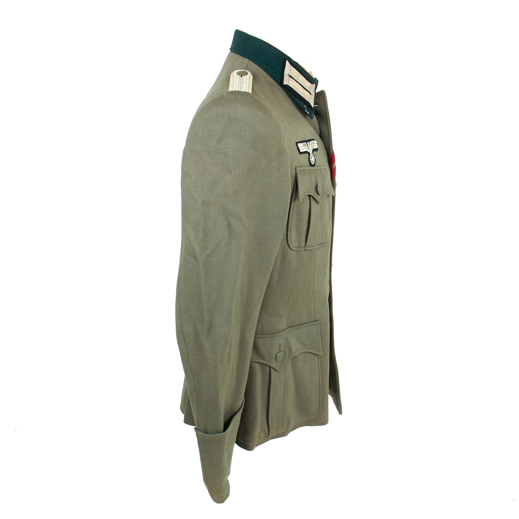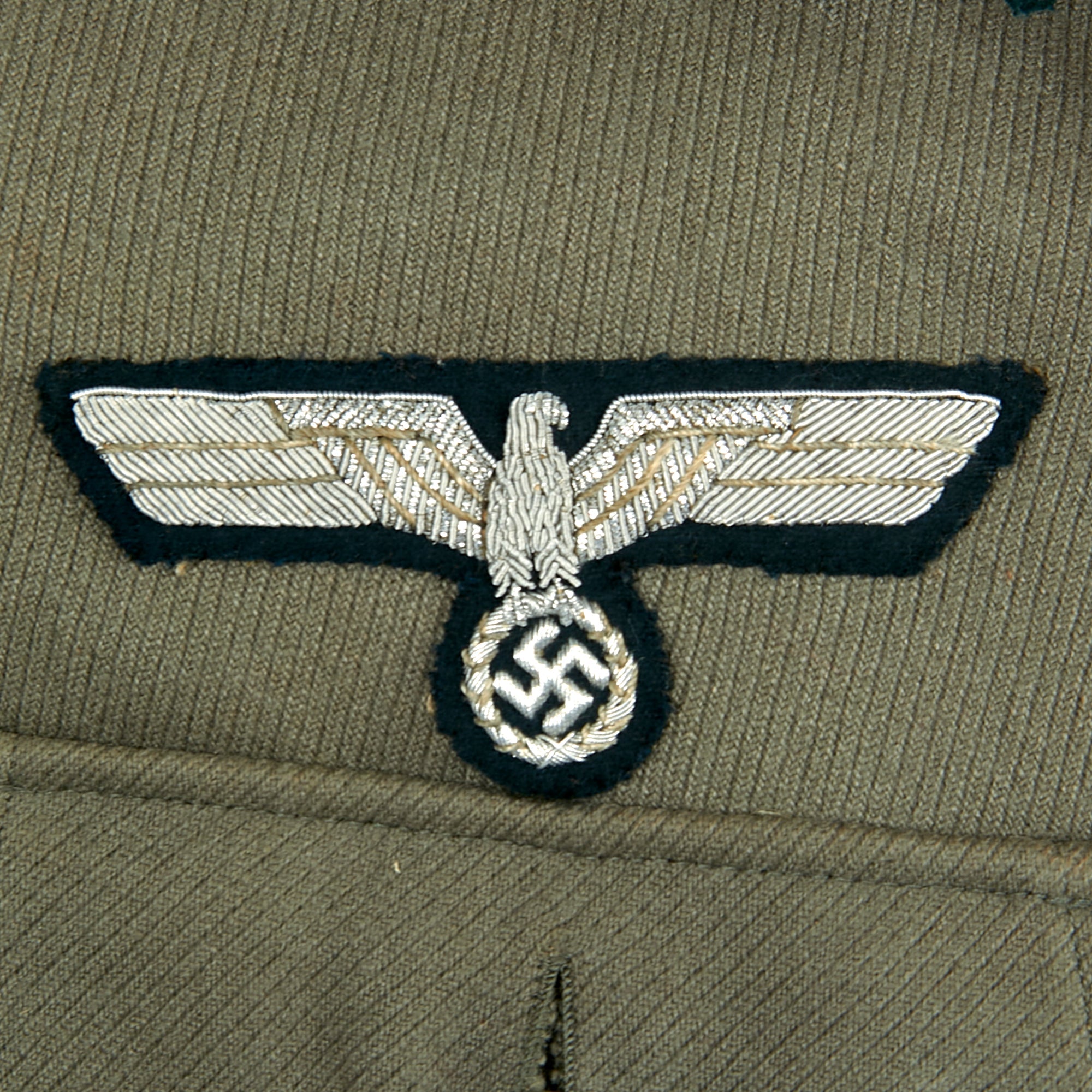 It is adorned with the usual rank and branch insignia used on German tunics. The attractive Army breast eagle is hand embroidered in aluminum bullion, and is very neatly hand stitched to the chest in a fashion typical of wartime German tailor work. The collar is wrapped in flaschengrün (dark bottle-green) wool, and has officer's field litzen collar patches on each side, which are woven from silver bullion thread with a dark bottle green background matching the collar. It is in good shape, though there is wear and some moth holes around the edge of the collar itself, which is usually one of the first places to show damage from use.