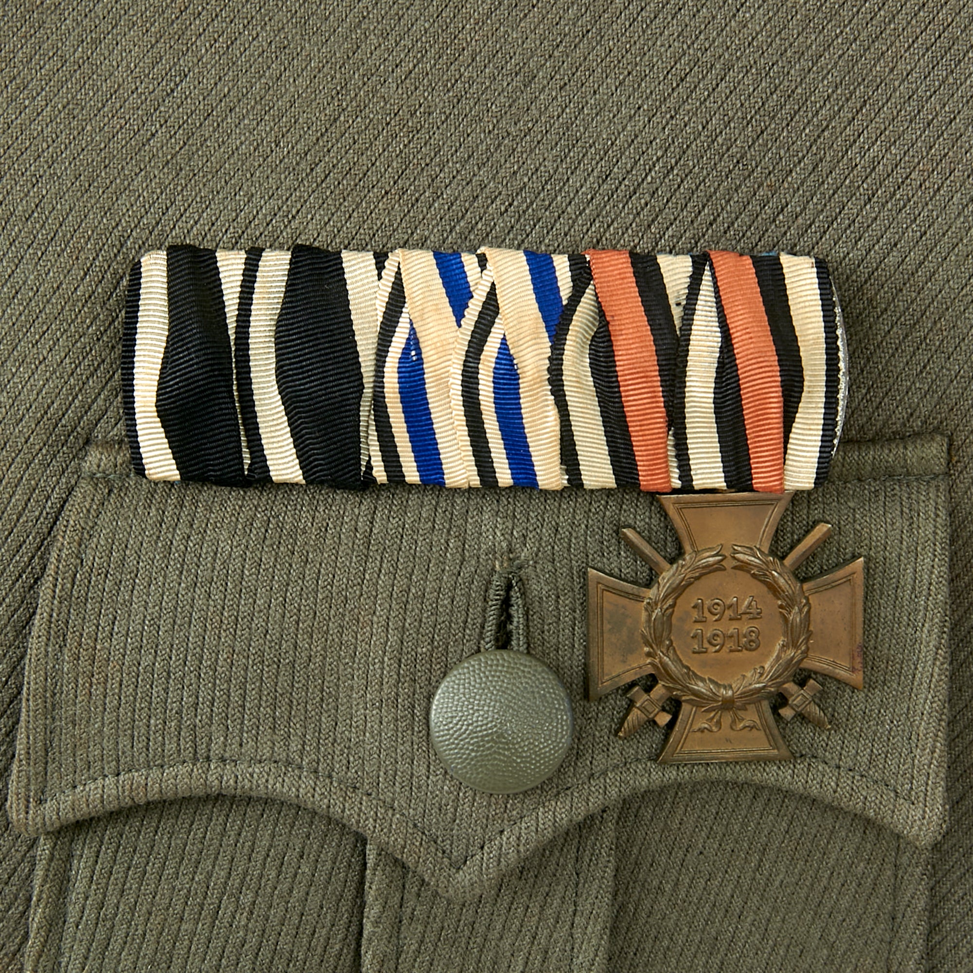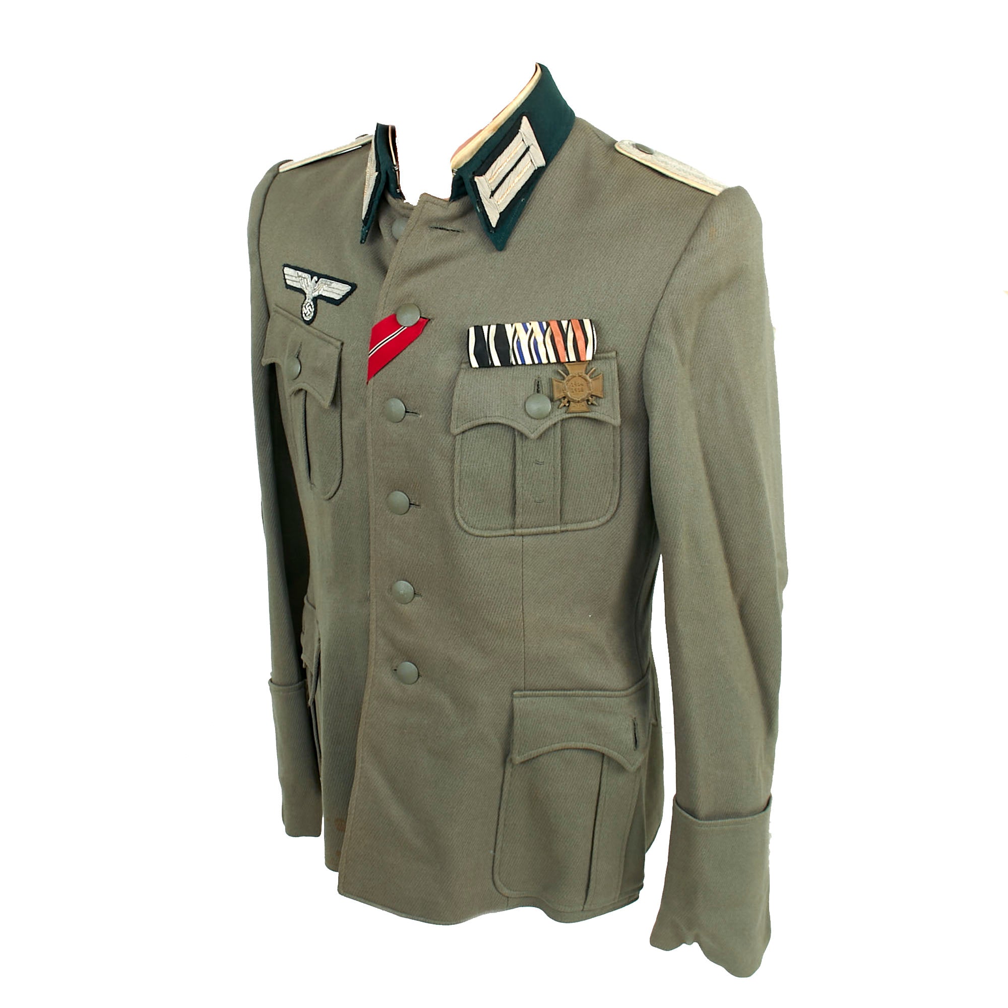 The left chest pocket has two thread loops on it, where there was likely originally an award attached. Above the left breast pocket is an attached 3-place medal bar, which is missing two of the planchets. The medal bar consists of the 1914 Iron Cross 2nd Class (missing medal), the Bavarian Military Merit Cross (missing medal), and the 1914-1918 Hindenburg Cross with Crossed swords for combat. The ribbons are in fair shape but the medals could be replaced. Stitched into the 2nd buttonhole is the ribbon for the Eastern Medal, or Ostmedaille, a very interesting addition as this space was often reserved for the 1939 Iron Cross 2nd Class.
