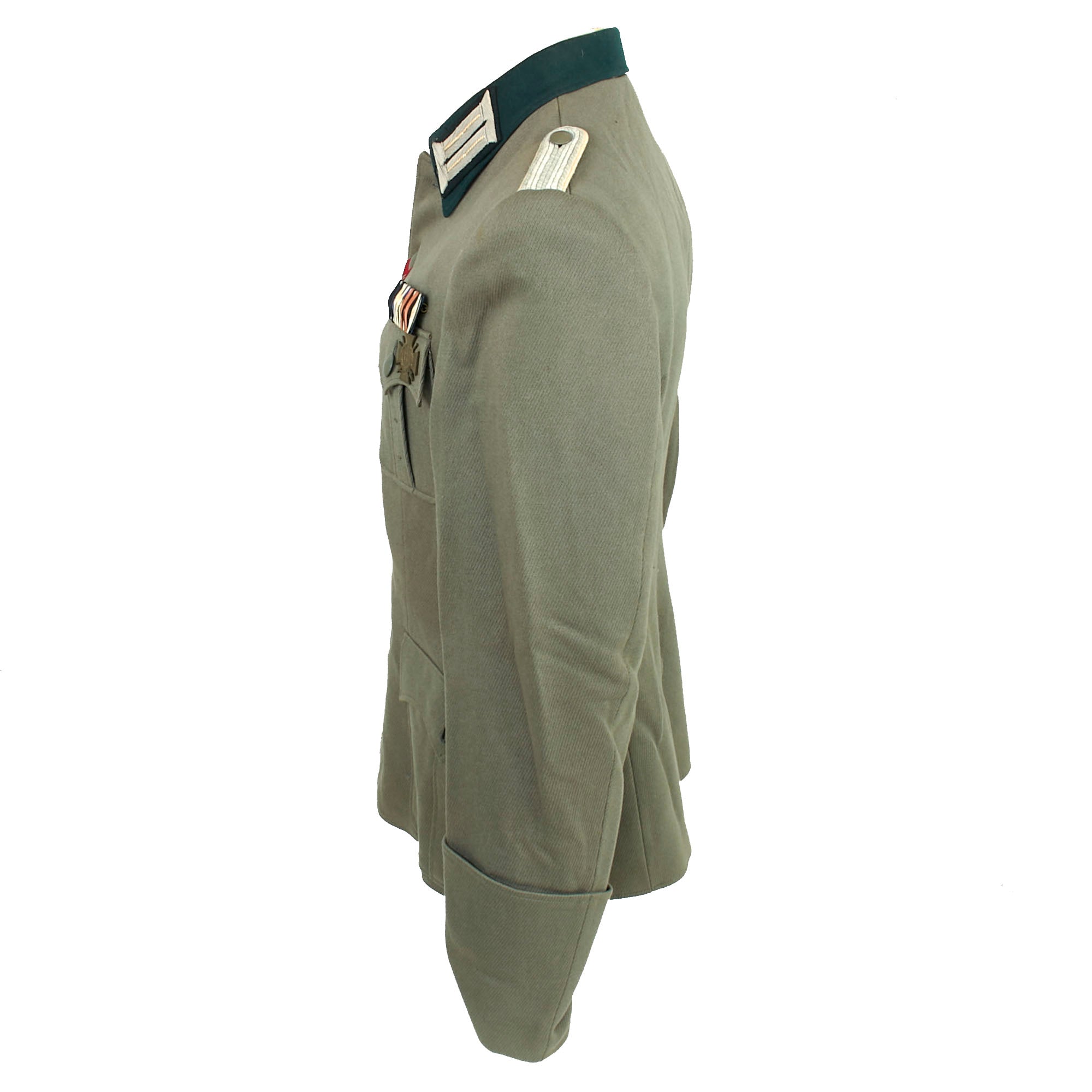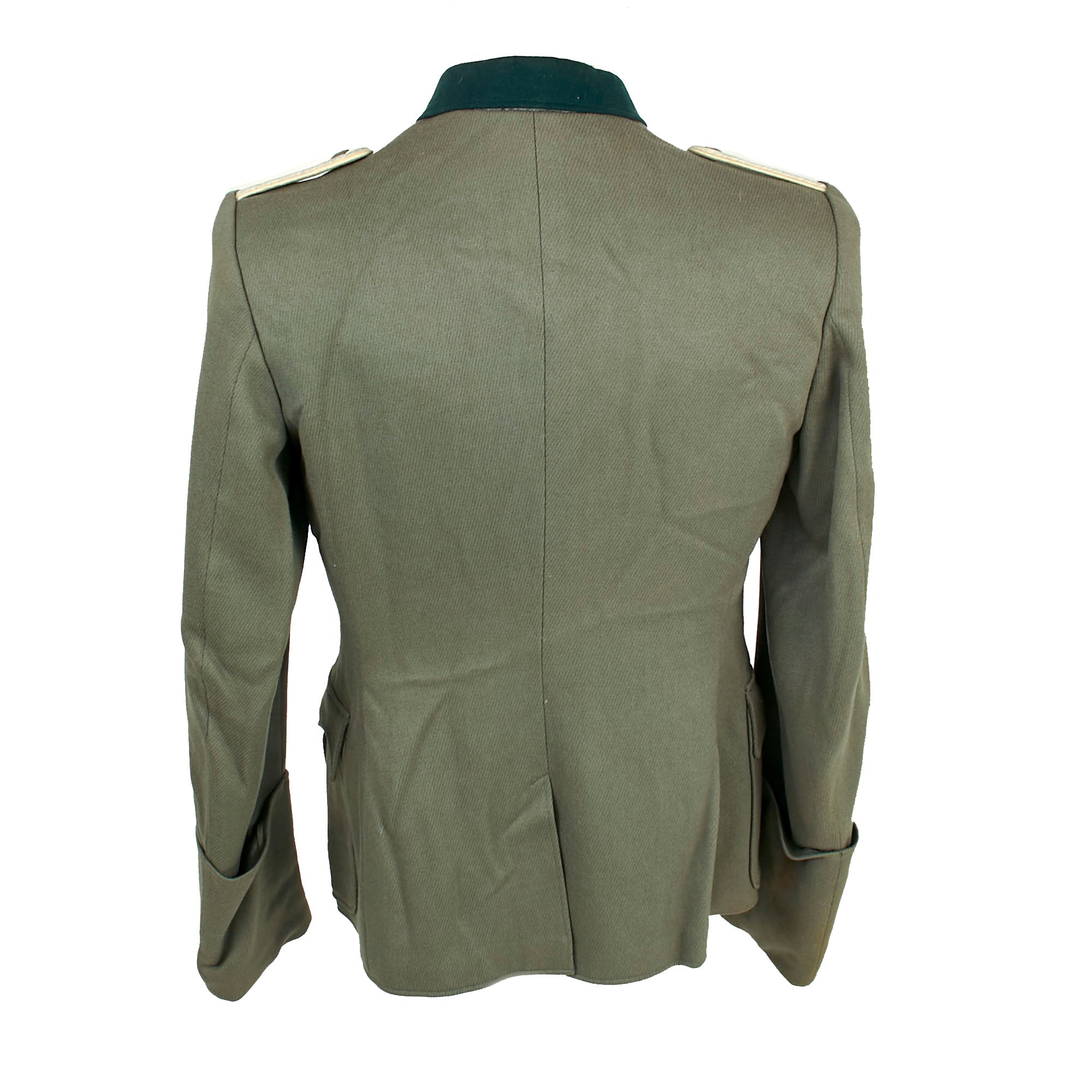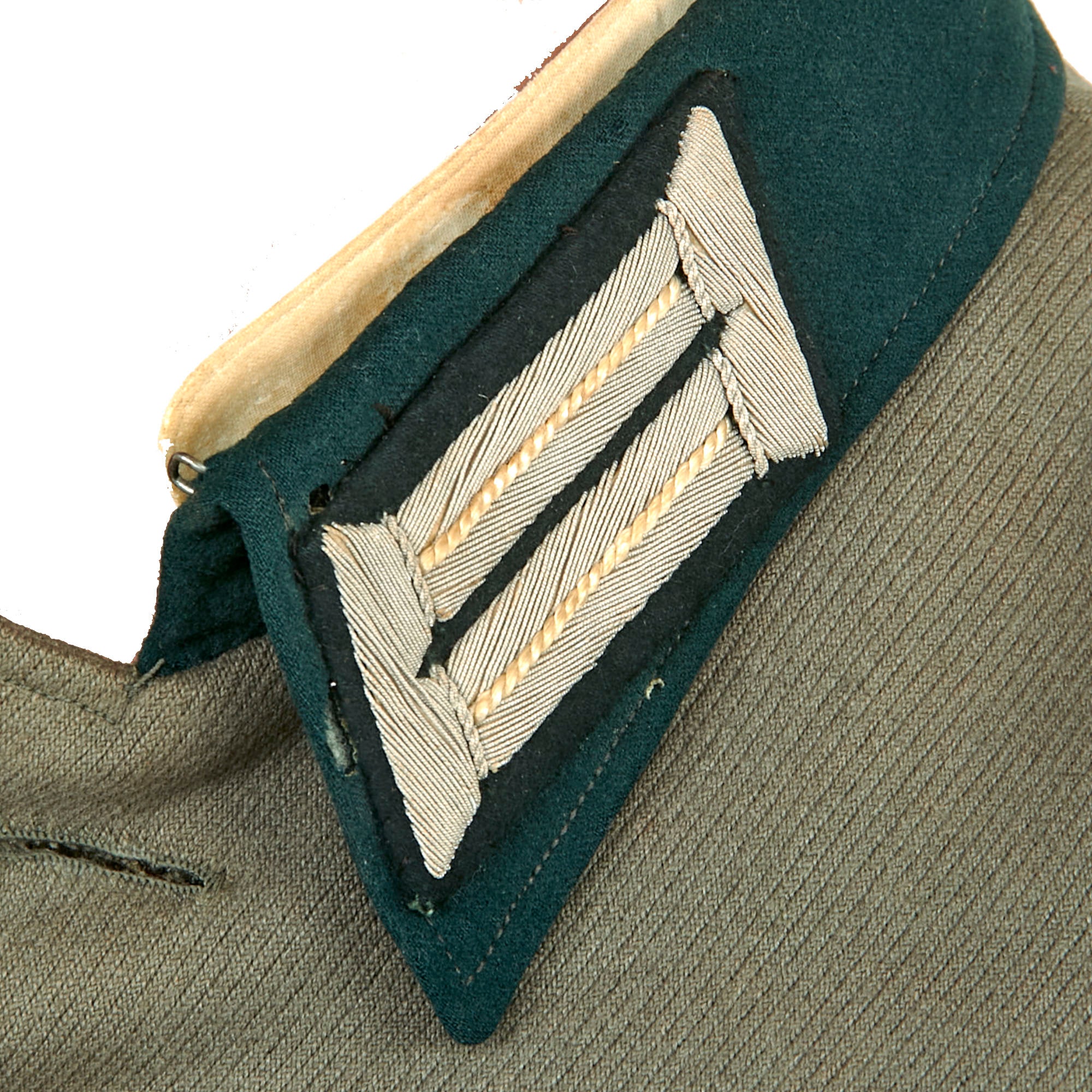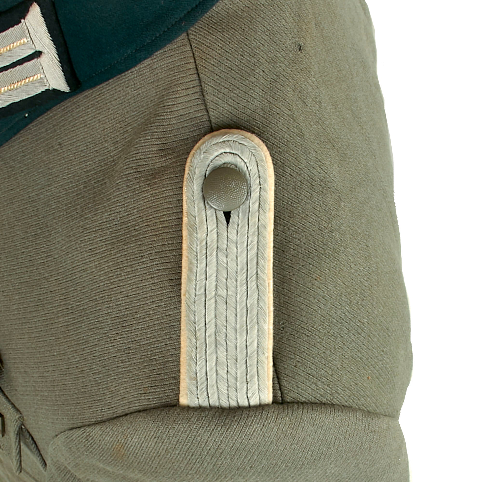 The colored stripes on the litzen are oxidized Weiß (white) Silver Bullion, the Waffenfarbe (Corps Color) during WWII for Infanterie (Infantry) and Motorisiert Infanterie (Motorized Infantry). The “sew-in” style company grade officers schulterklappen (shoulder boards) of this tunic are constructed with two rows of fine silver flatware "Russia Braid" double piping and have the correct white piping around the edges. There are no rank pips, indicating the rank of Leutnant, equivalent to a U.S. Army 2nd Lieutenant.