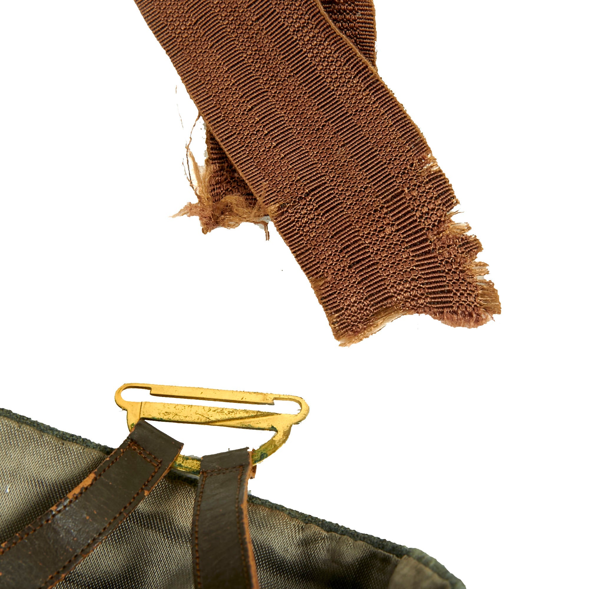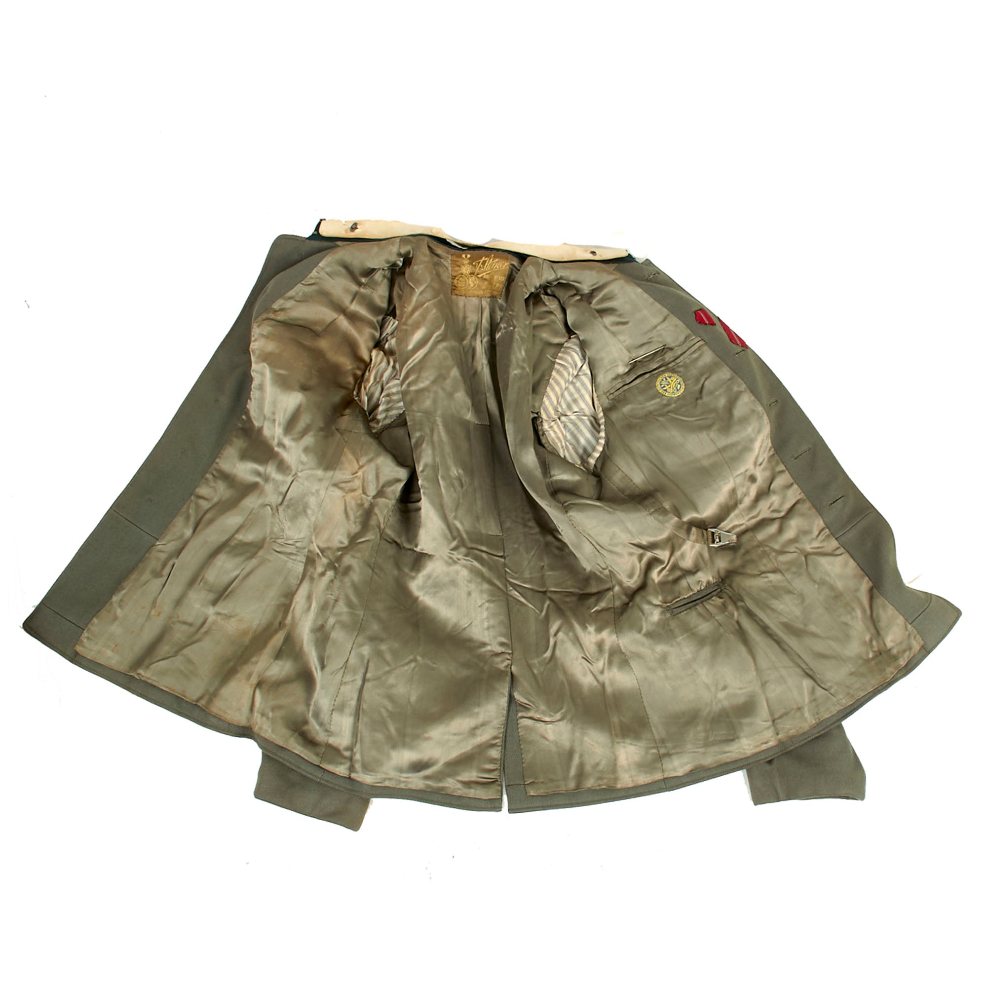 The interior is lined with a lovely olive / gray colored rayon cotton blend, while the sleeves are lined with blue & red striped white rayon. There is definitely wear to the interior, with light fraying present, as well as staining in areas. There is also a large eyelet that connects to the exterior under the left waist pocket for the dagger to hang through, with the hook for the dagger still intact.