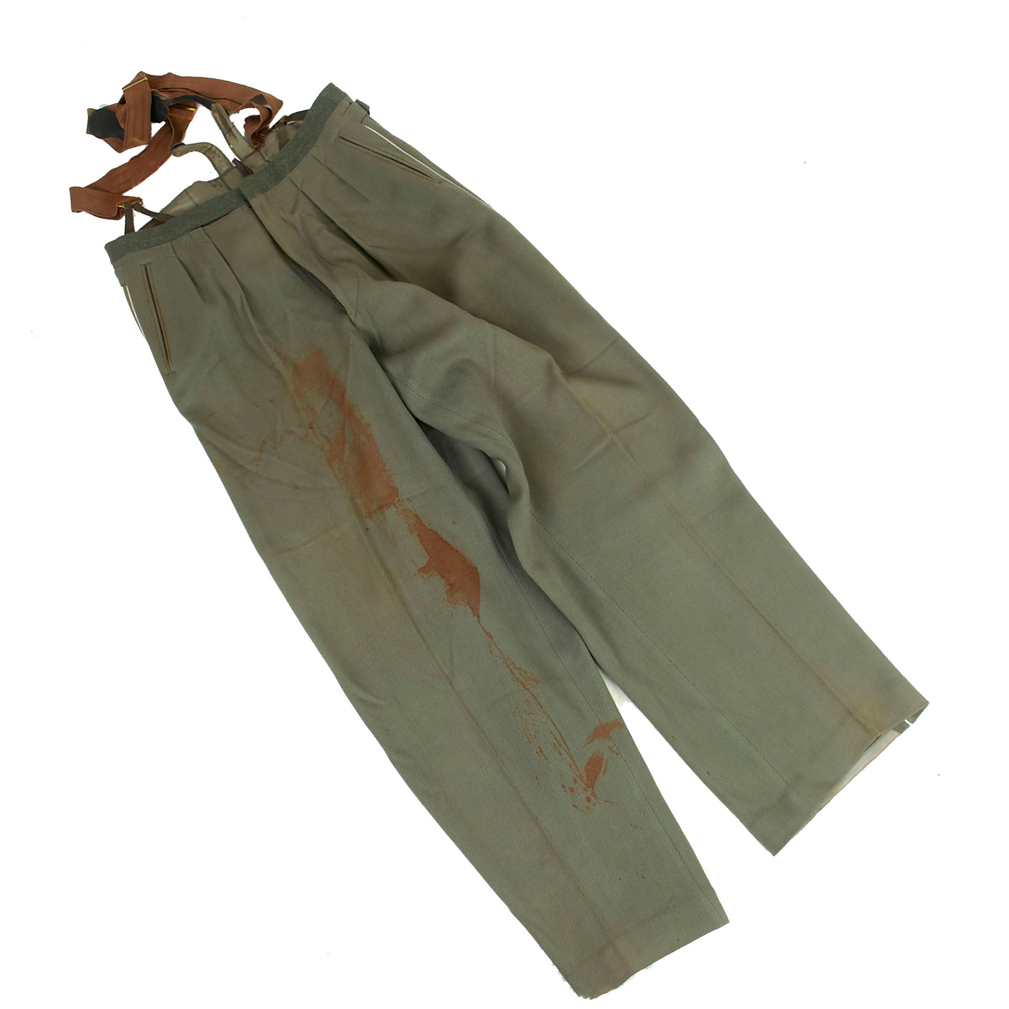 Along with the tunic there is a lovely pair of officers trousers in the correct stone gray (steingrau) color, with white stripes on the side for infantry issue. They show moderate wear from service, matching the condition of the tunic. The trousers still retain their original suspenders, however the suspenders are marked on the back with PARIS MADE IN U.S.A., so they are obviously added to the uniform, however they do look period and will work well for display.