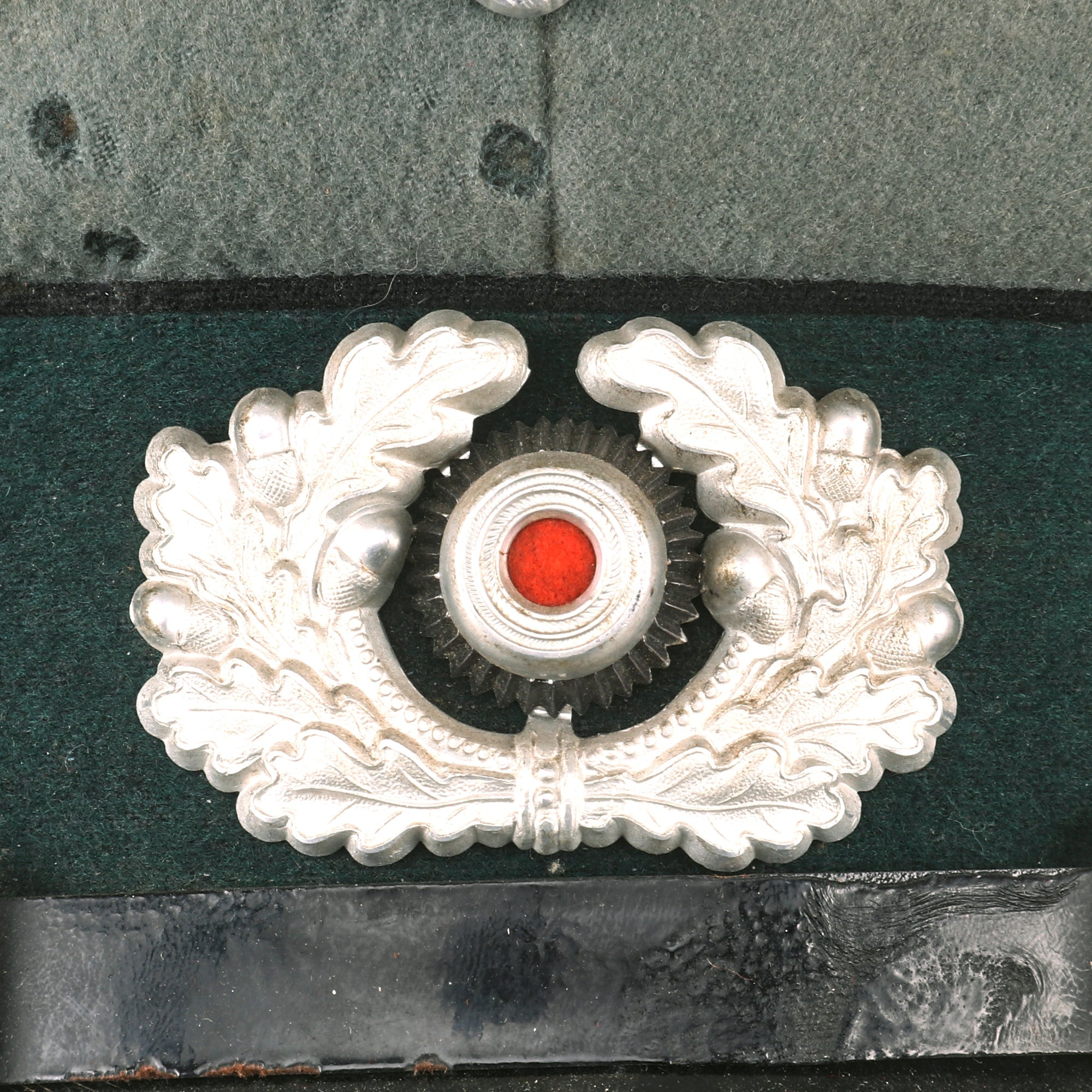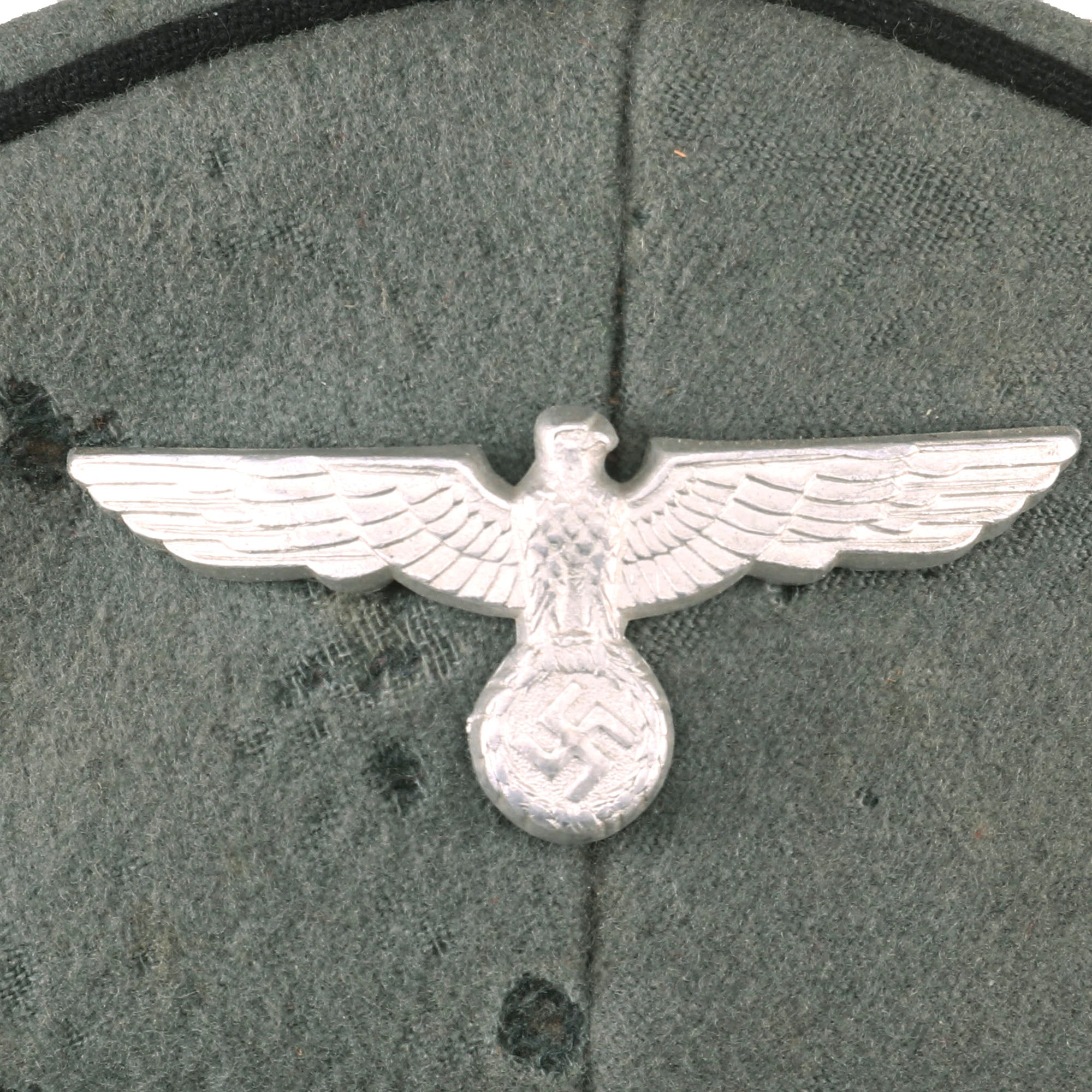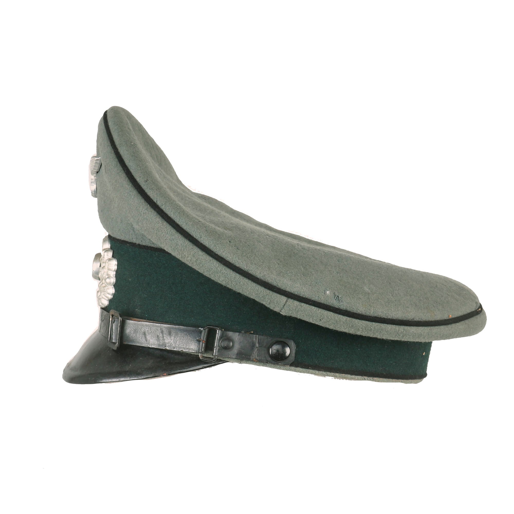 The visor cap (Schirmmütze) was an important part of the headgear worn by German uniformed military, civil, paramilitary and political organizations during the Third Reich. This was the standard cloth headgear worn as a part of the service uniform. Visor caps were worn outdoors as well as indoors, and were often required to be worn by all personnel on duty. Visor caps were made in versions specific to each organization and were often further differentiated through the use of insignia, colored piping, or style of chin cord, to indicate rank, role or branch. The insignia used on these caps ranged from simple stamped metal emblems, to elaborate hand embroidery. Visor caps were issued to enlisted soldiers and NCOs in the military and in some other organizations. Officers had to purchase their own hats, and lower ranks could choose to purchase caps that were of a higher quality than the rather basic, issued examples. The private purchase caps were generally made in very high quality, with fine materials. A wide variety of fabrics were used, from Trikot and doeskin, to heavy wool, or even lightweight white fabric for summer wear. In the military, issue of these caps was generally suspended shortly after the outbreak of the war, but they continued to be worn by some troops until the end of the war.