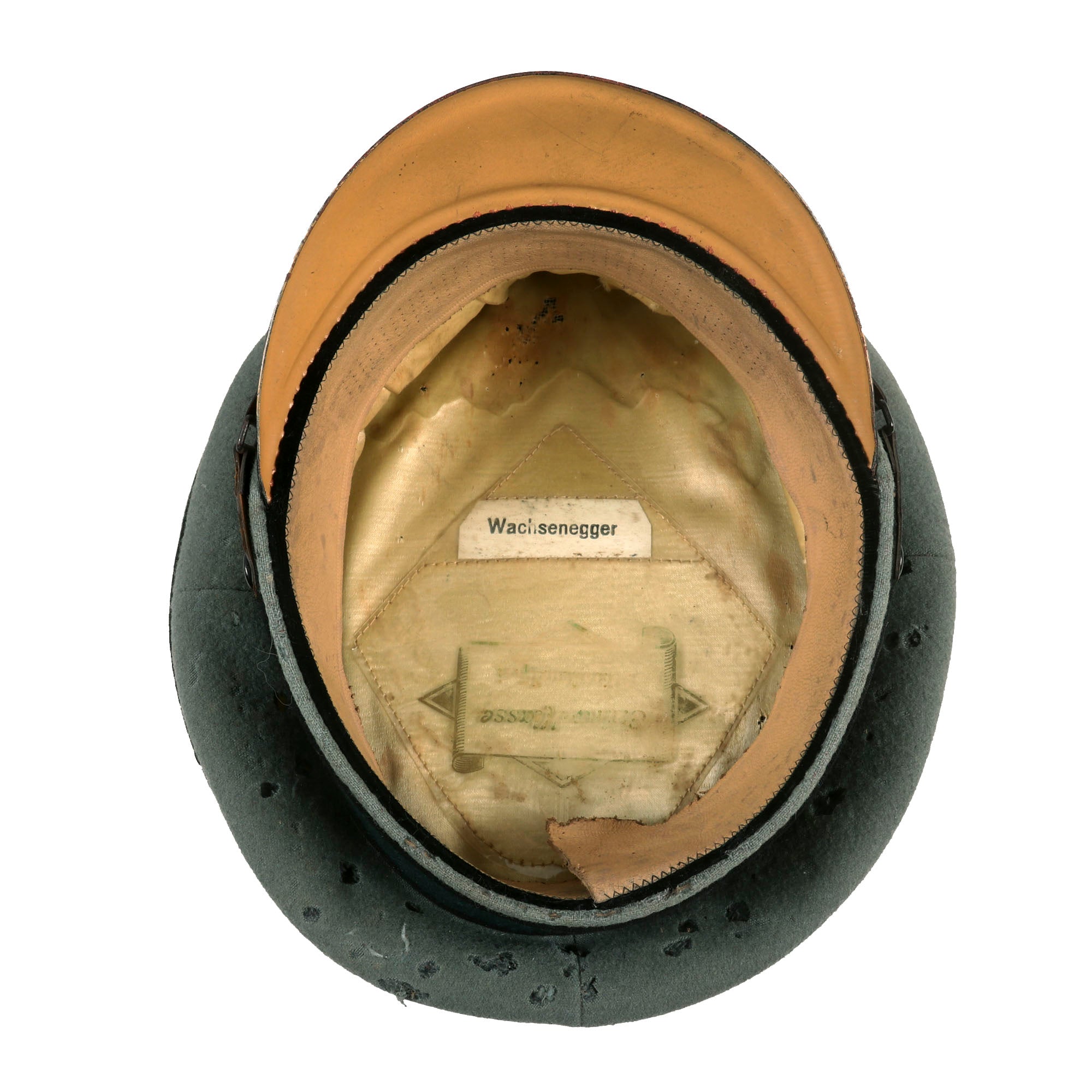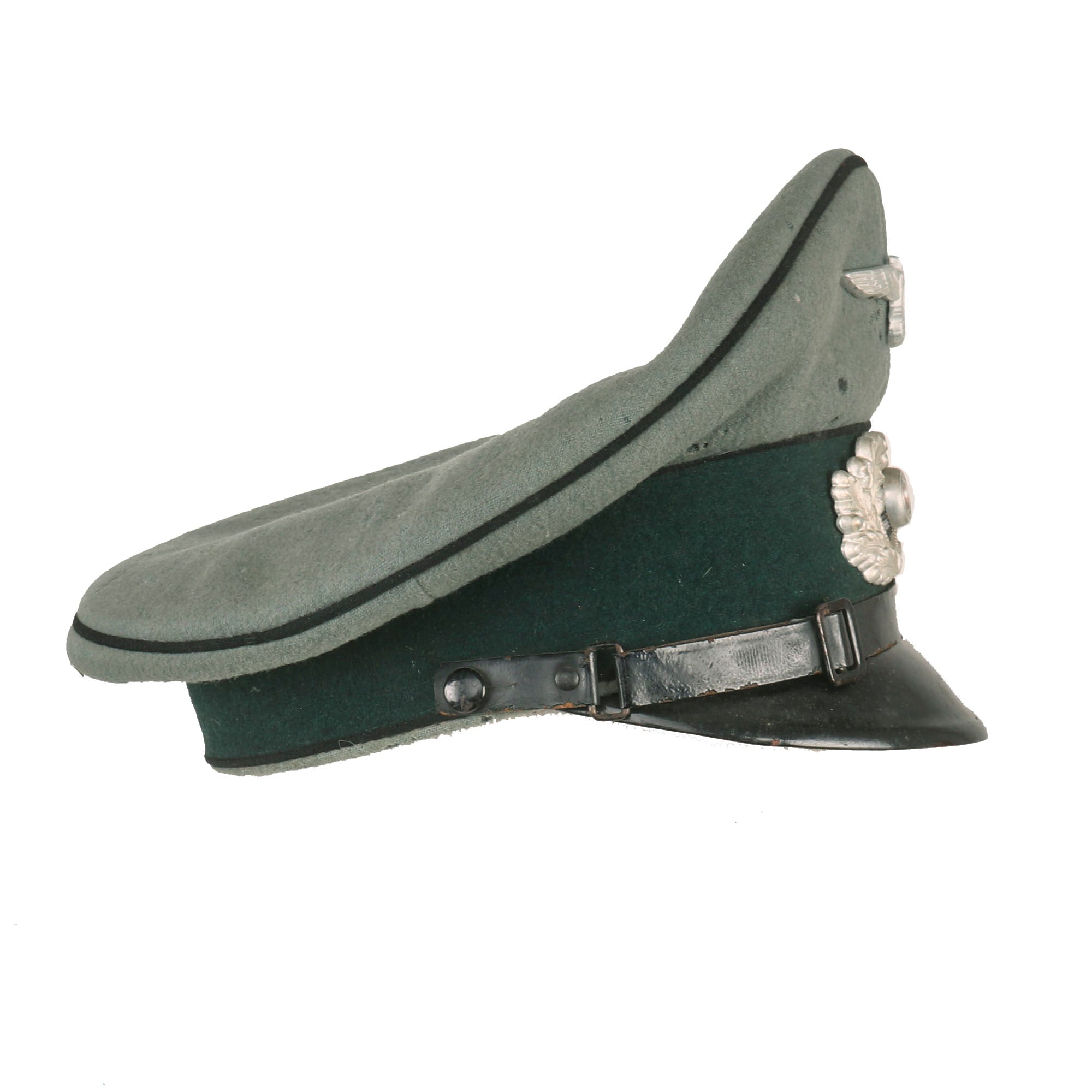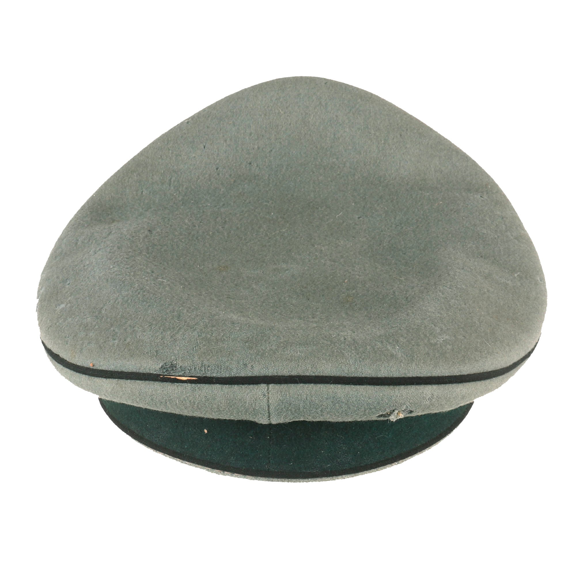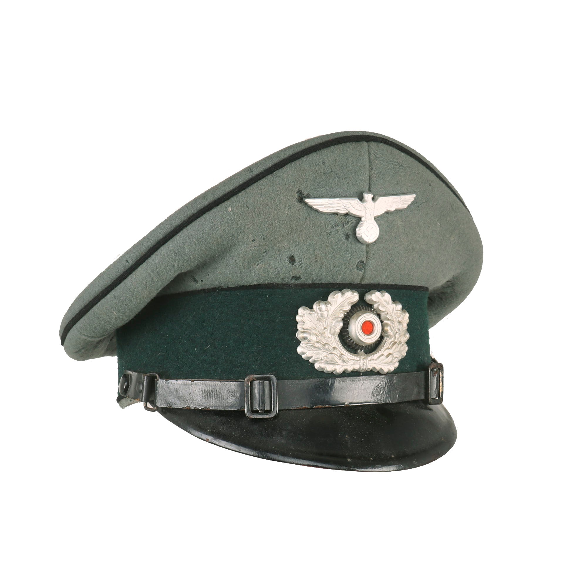 Original Item: Only One Available. This cap is a great "salty" service worn example of a German WWII Wehrmacht Heer Army Pioneer Combat Engineer EM/NCO Schirmmütze (visor cap), with a lovely "Crushed" shape. This "saddle-form" shape is highly desirable, and accomplished by removing the crown support stiffener ring. It features the typical feldgrau (field gray) "doeskin" weave wool construction with a dark bottle-green (flaschengrün) "badge cloth" band and a traditional high forward crown. It also has matching Schwarz (Black) piping along the top edge and flanking either side of the band. This is the Waffenfarbe (Corps Color) for the Pioniere (Combat engineers), as well as Assault, Armored, Fortress, and Railway engineers.