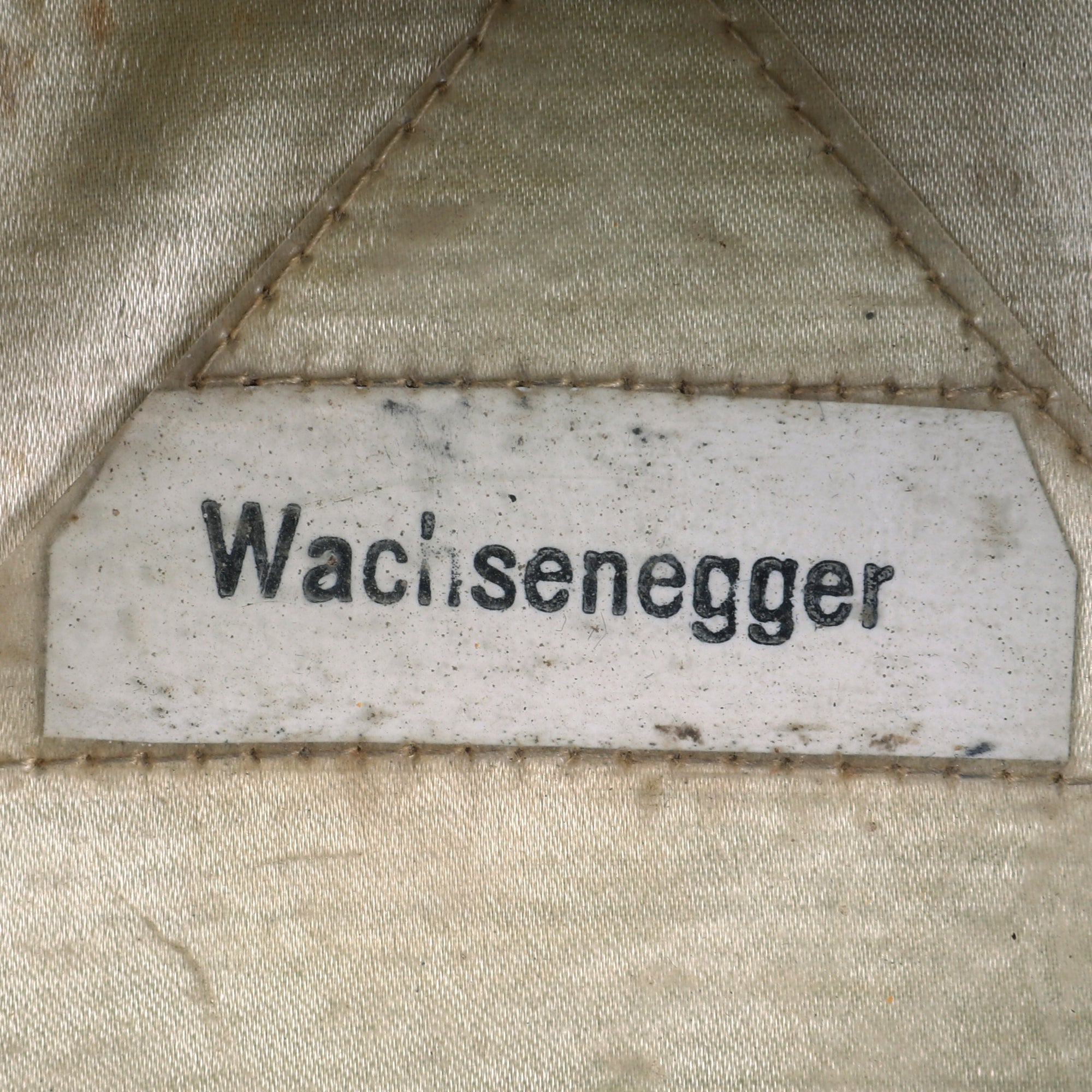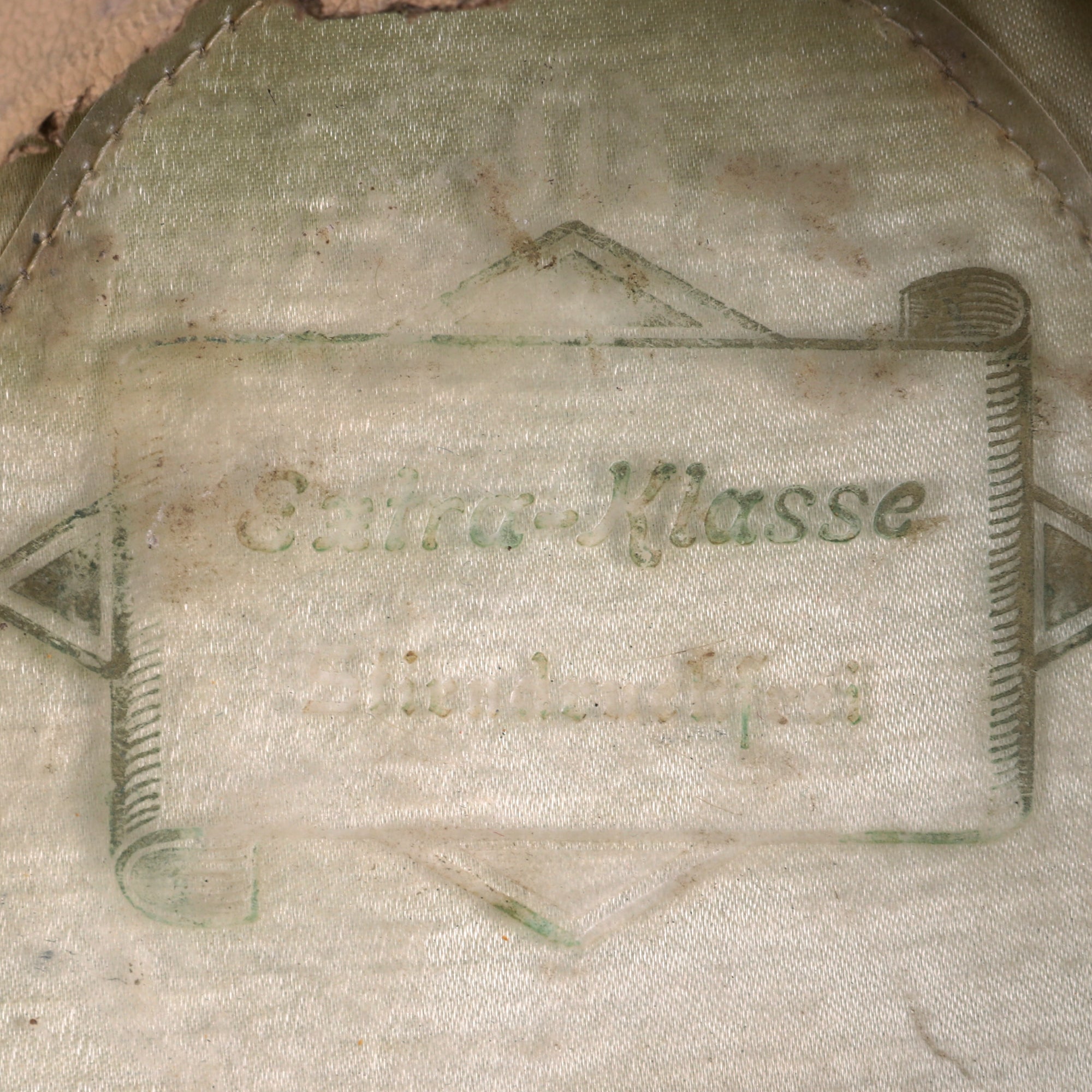 The cap is lined with lovely cream colored rayon faux silk, which is in good condition, showing staining from use, particularly towards the front. The celluloid diamond sweat shield is fully intact with complete stitching, and there is even a printed name in the name tag slot, which looks to read Wachsenegger. There is no size marked, but it seems to be about a 58cm / 7 1/4 US. The sweat shield still has the full original marking visible: