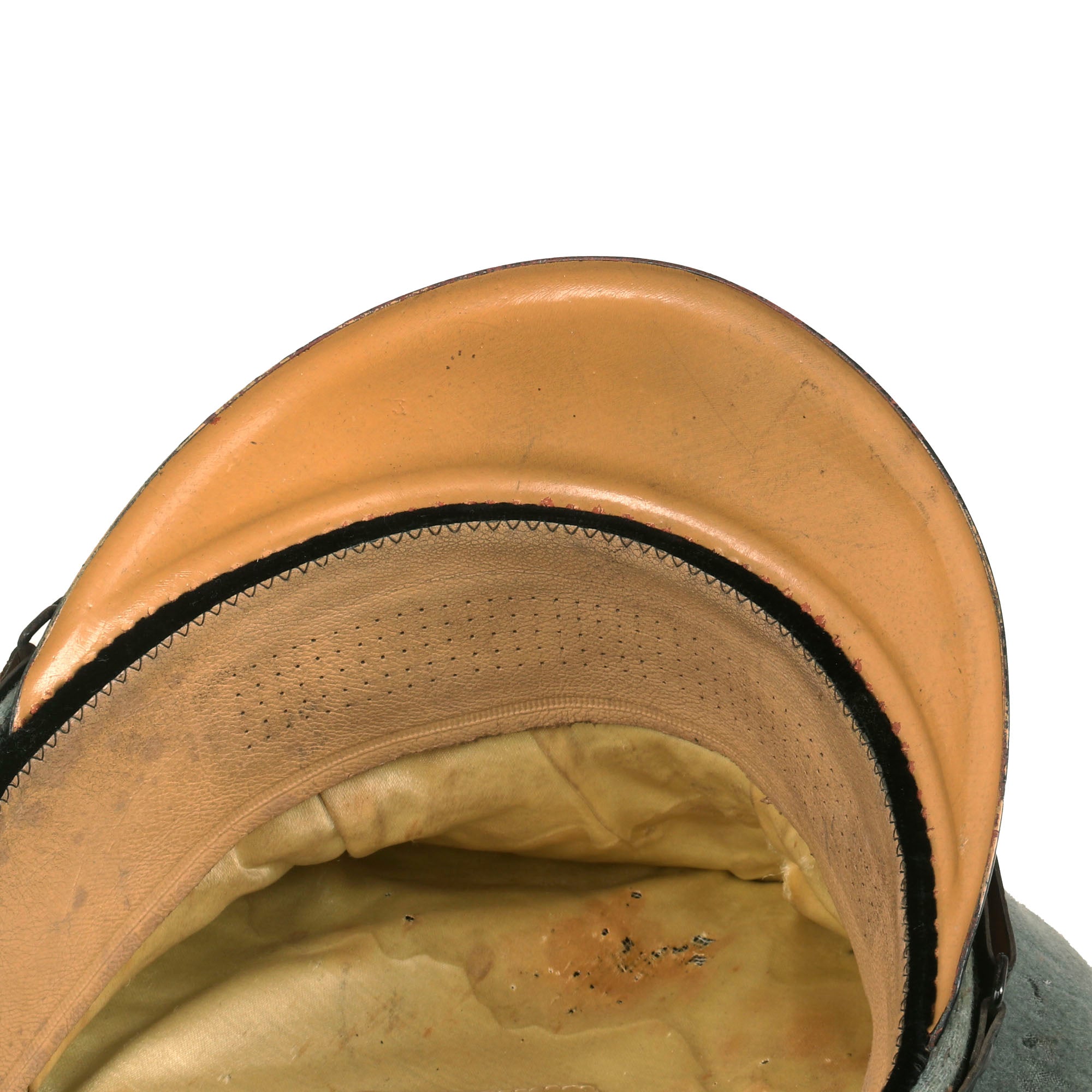 It is decorated with a well detailed stamped aluminum insignia on the peak and and an open aluminum wreath surrounding an metal tri-color cockade on the band. The insignia are in great shape, and the cockade still retains the bright red felt center inlay. The cap has the correct black patent leather EM/NCO chin strap with double buckles, which shows some crazing/checking in the finish. The visor / peak on this cap is the typical black-finished "vulcanfibre" pressed composite material, which is checkered beige on the underside. The top of the visor shows a lovely pattern of fine crazing and checking due to age, with some flaking on very edge. The visor is a bit loose on the cap due to the attachment threads stretching over time.