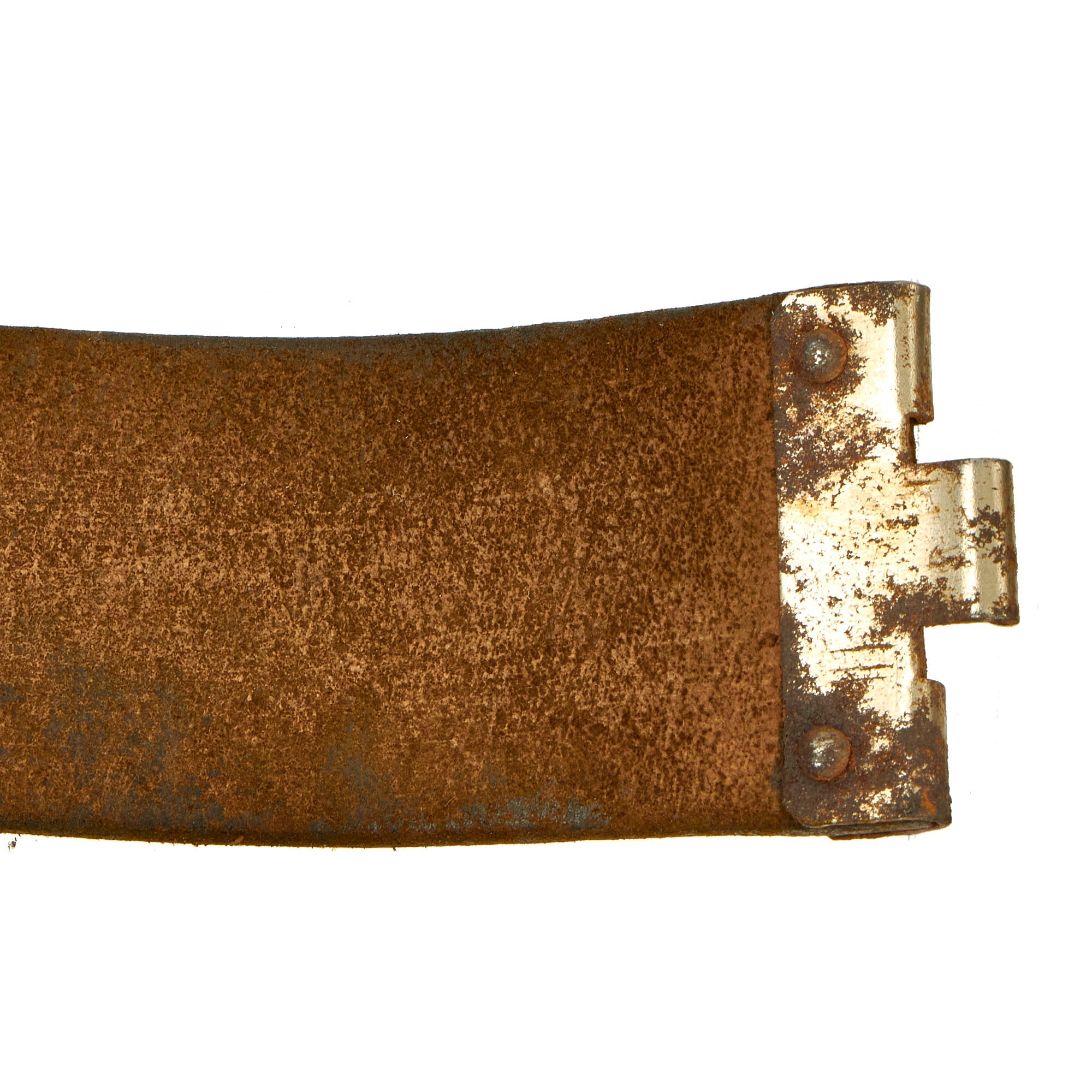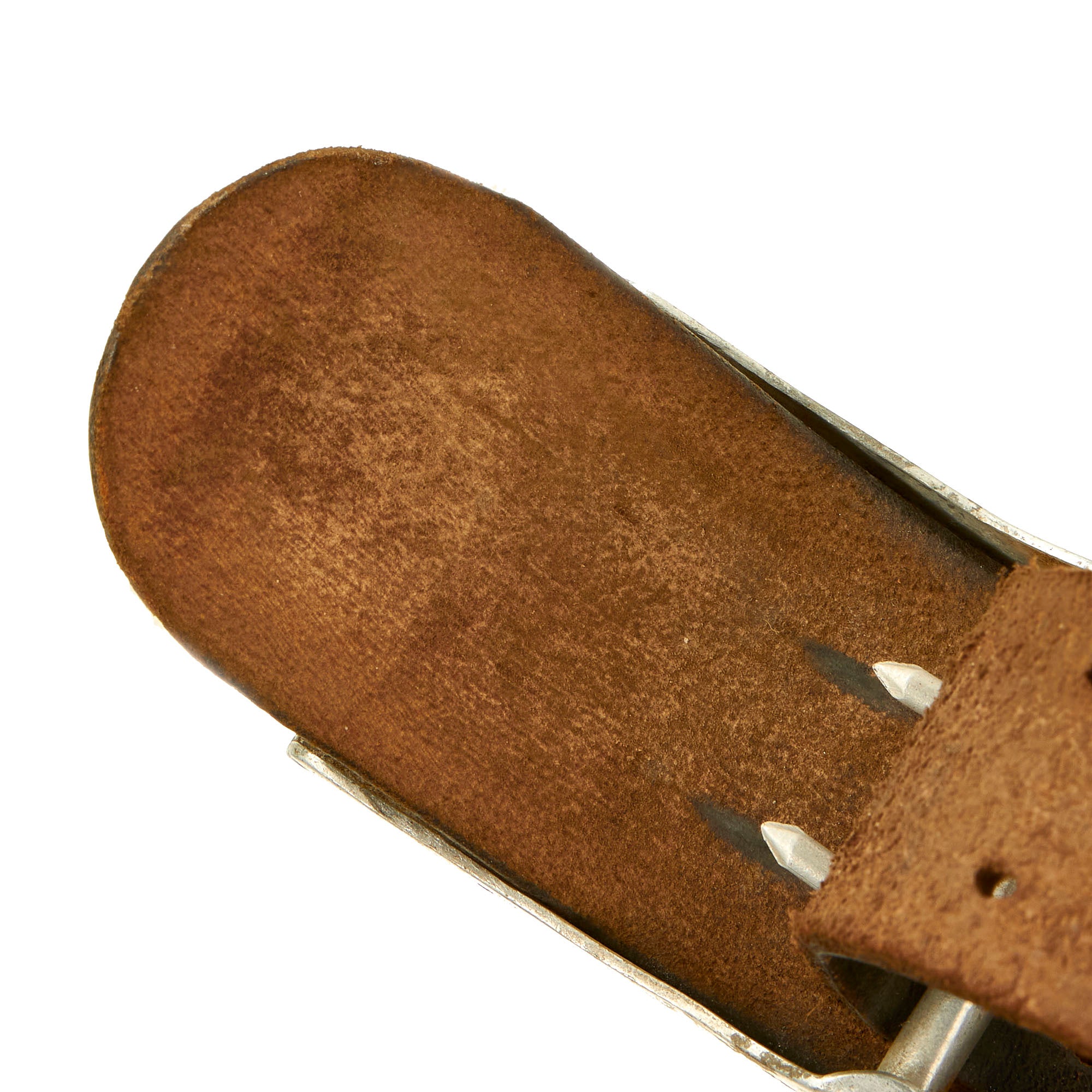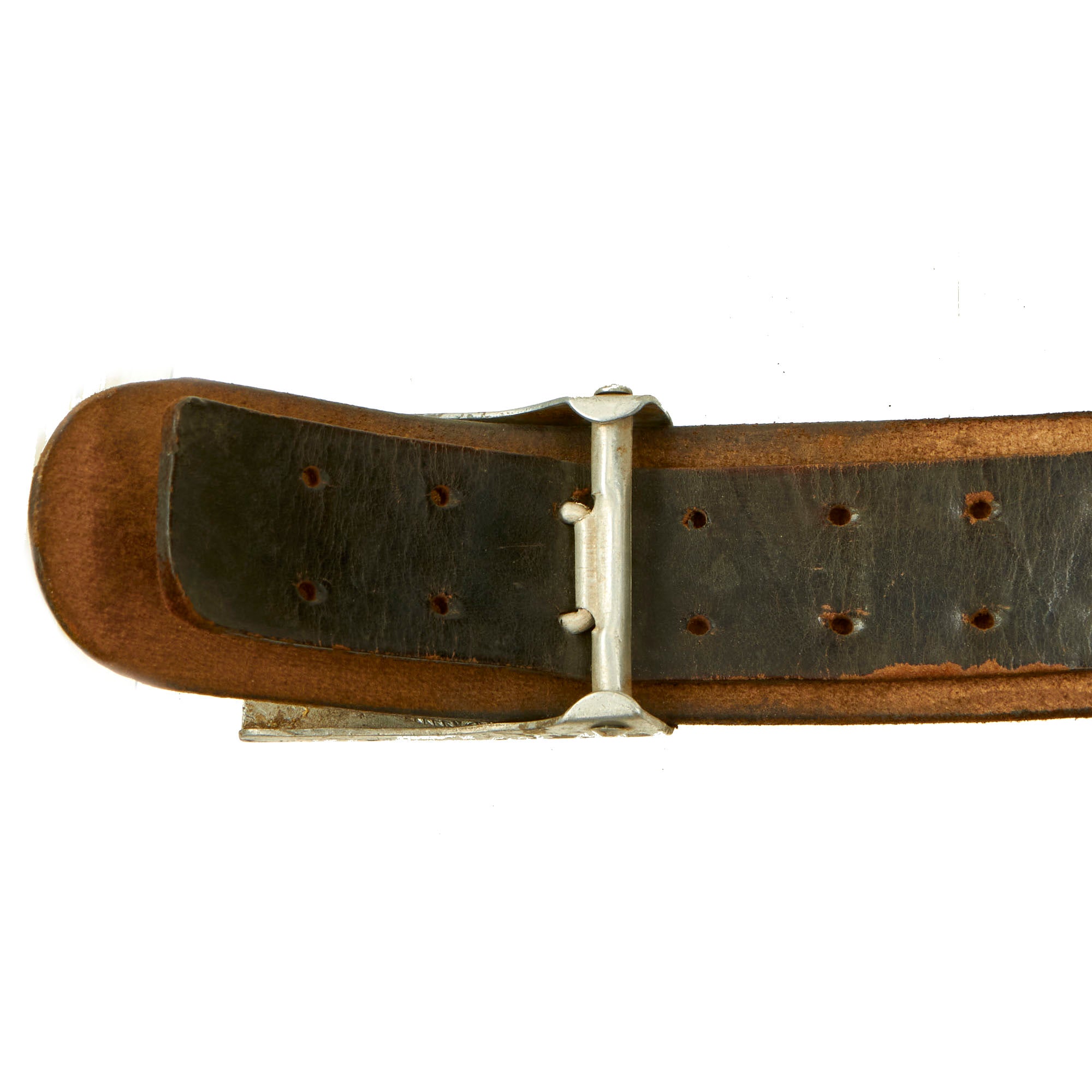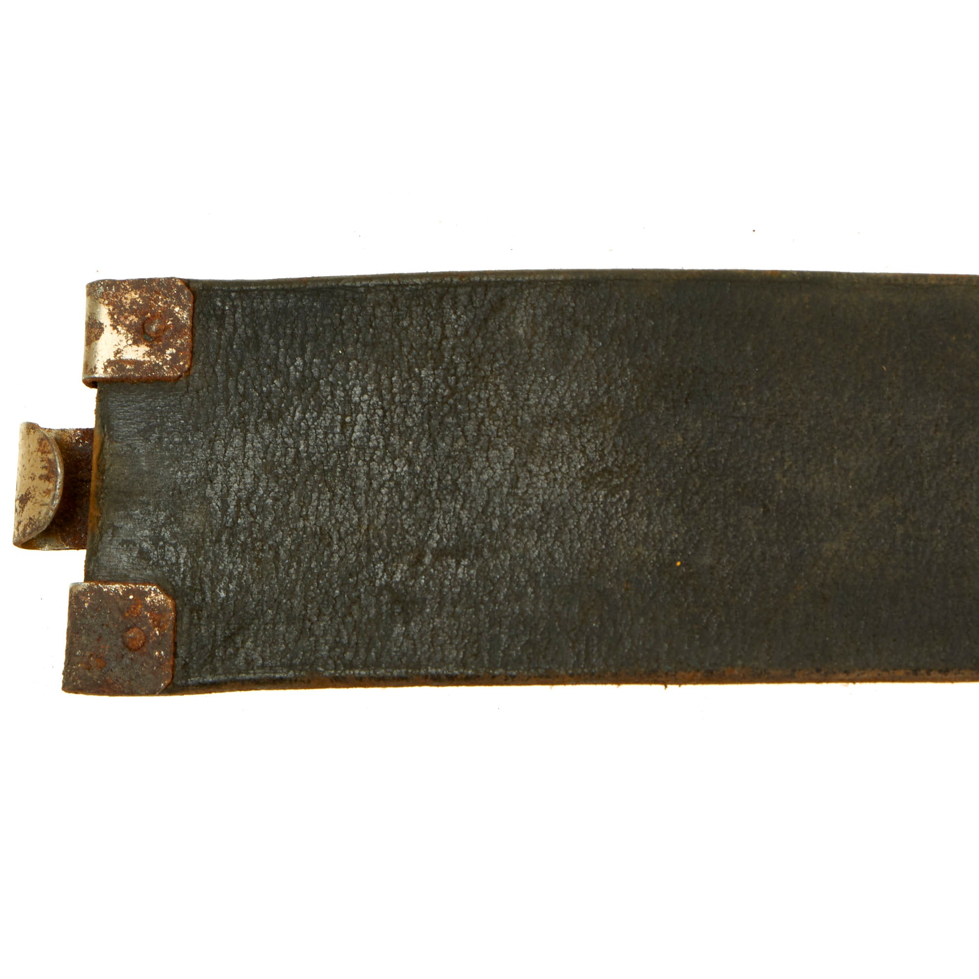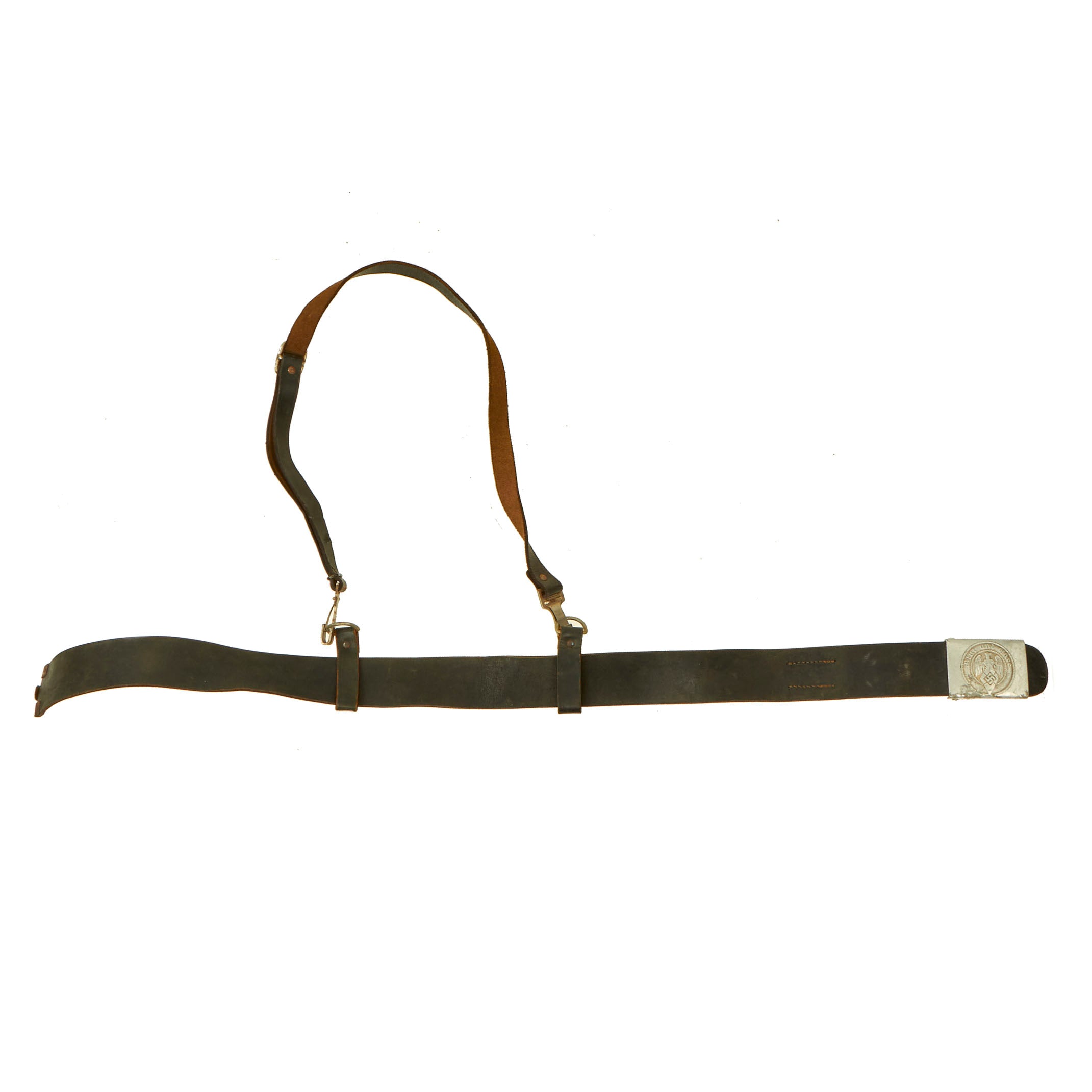 The black finished leather belt is in very good used condition, still supple and without any major cracks or tears. It measures 35" when fully extended, and also shows some markings on the size adjustment tab, which we cannot quite make out. The attached cross strap has both loops present on the belt, and overall has a great service worn look.